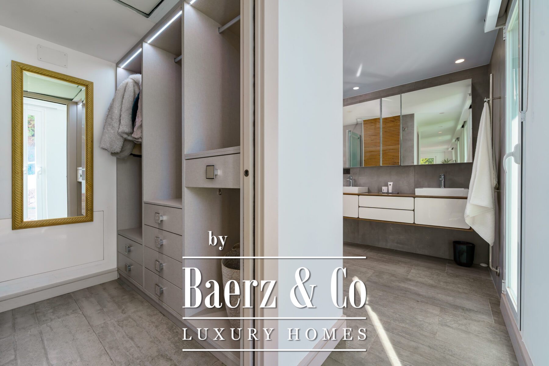 Upstairs, the master suite offers a generous walk-in wardrobe and a refined en-suite bathroom. An additional guest bedroom on this floor features its own walk-in closet and en-suite, while the living area opens to the solarium terrace, framing partial sea and mountain views. The terrace provides ample opportunity for both relaxation and entertaining.