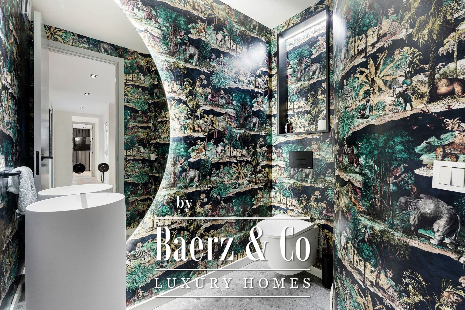 On the ground floor, natural light accentuates the open-plan living, dining, and state-of-the-art Gaggenau kitchen, each defined by premium wood and marble finishes. Herringbone floors and a neutral color palette impart warmth and understated sophistication. Extending from the living area, a private patio invites alfresco dining and moments of quiet retreat. The opulent principal suite features an expansive closet, a freestanding bathtub overlooking the terrace, and an en-suite bathroom. An additional bedroom on this floor ensures flexible accommodation for family or guests.