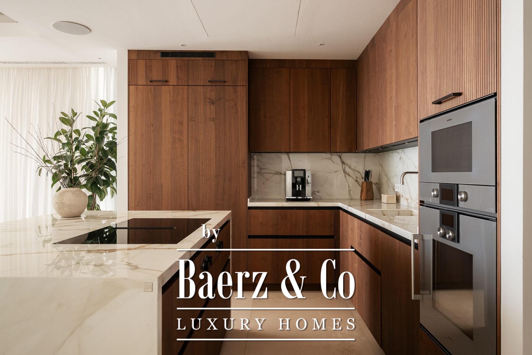 A central hall divides the layout. On one side, the social spaces: an open-plan kitchen with Gaggenau and Miele appliances, floor-to-ceiling wine display, and automated windows that open fully to merge interior and exterior. An L-shaped terrace wraps the space with sea views, lounge, dining area, jacuzzi, outdoor shower and summer kitchen—surrounded by landscaped greenery that brings the atmosphere of a private villa.