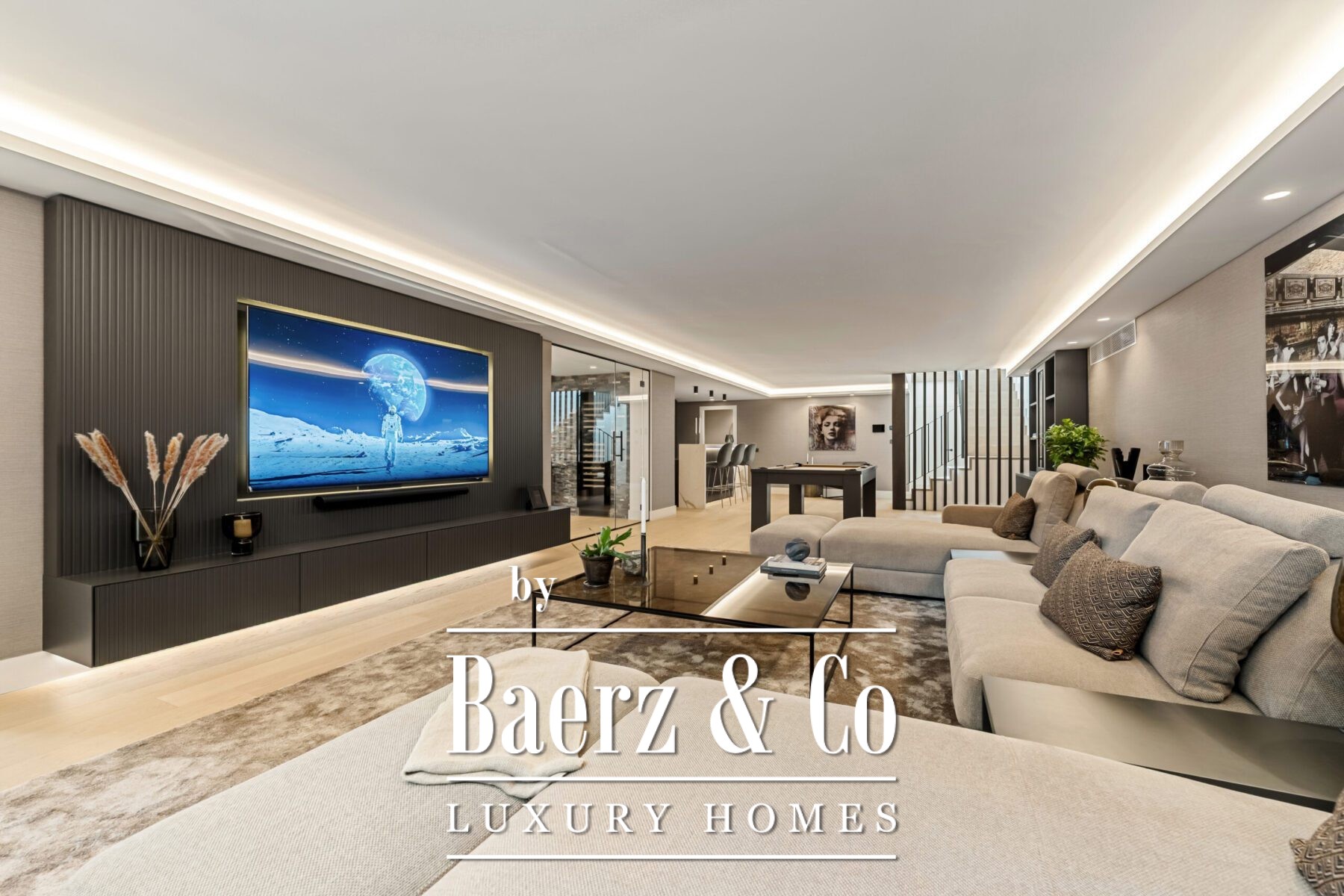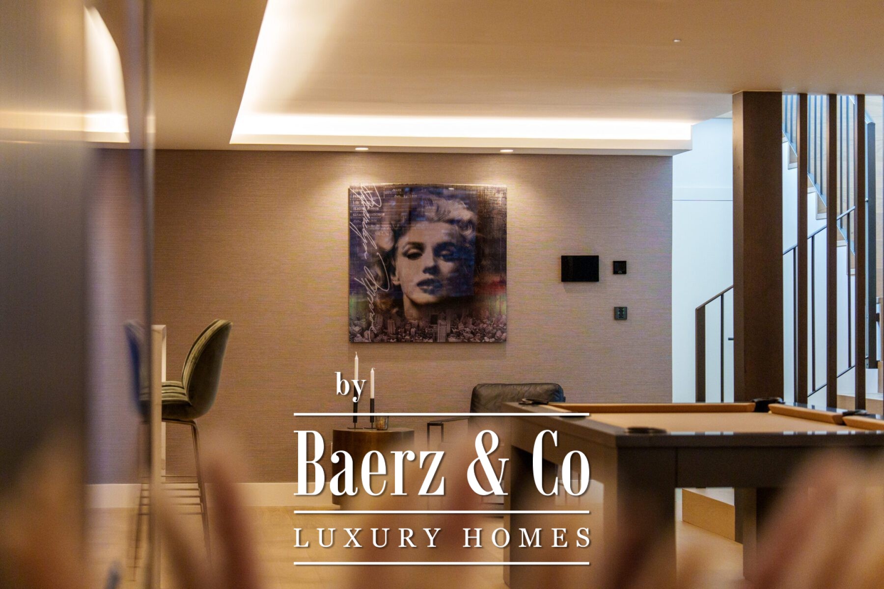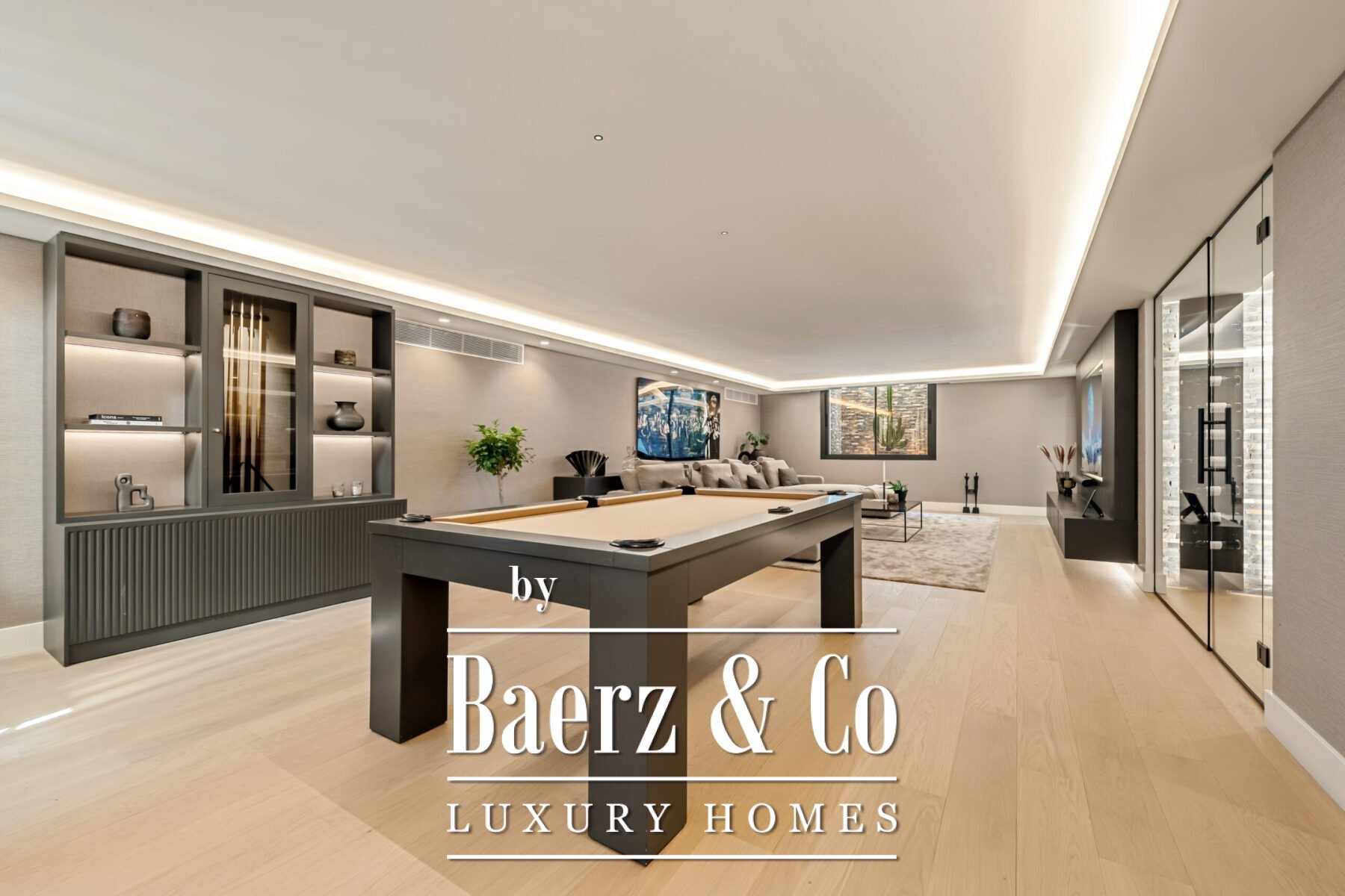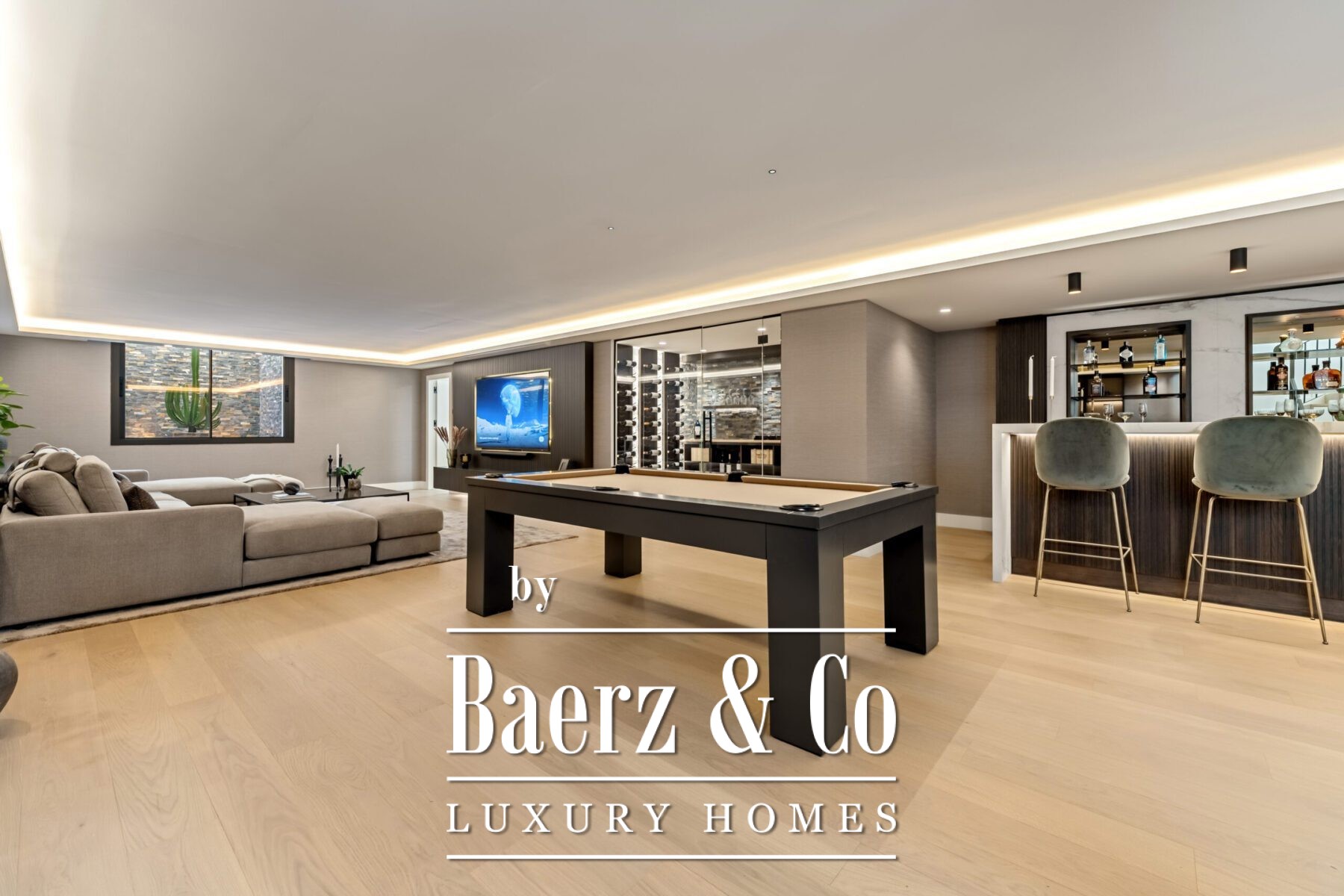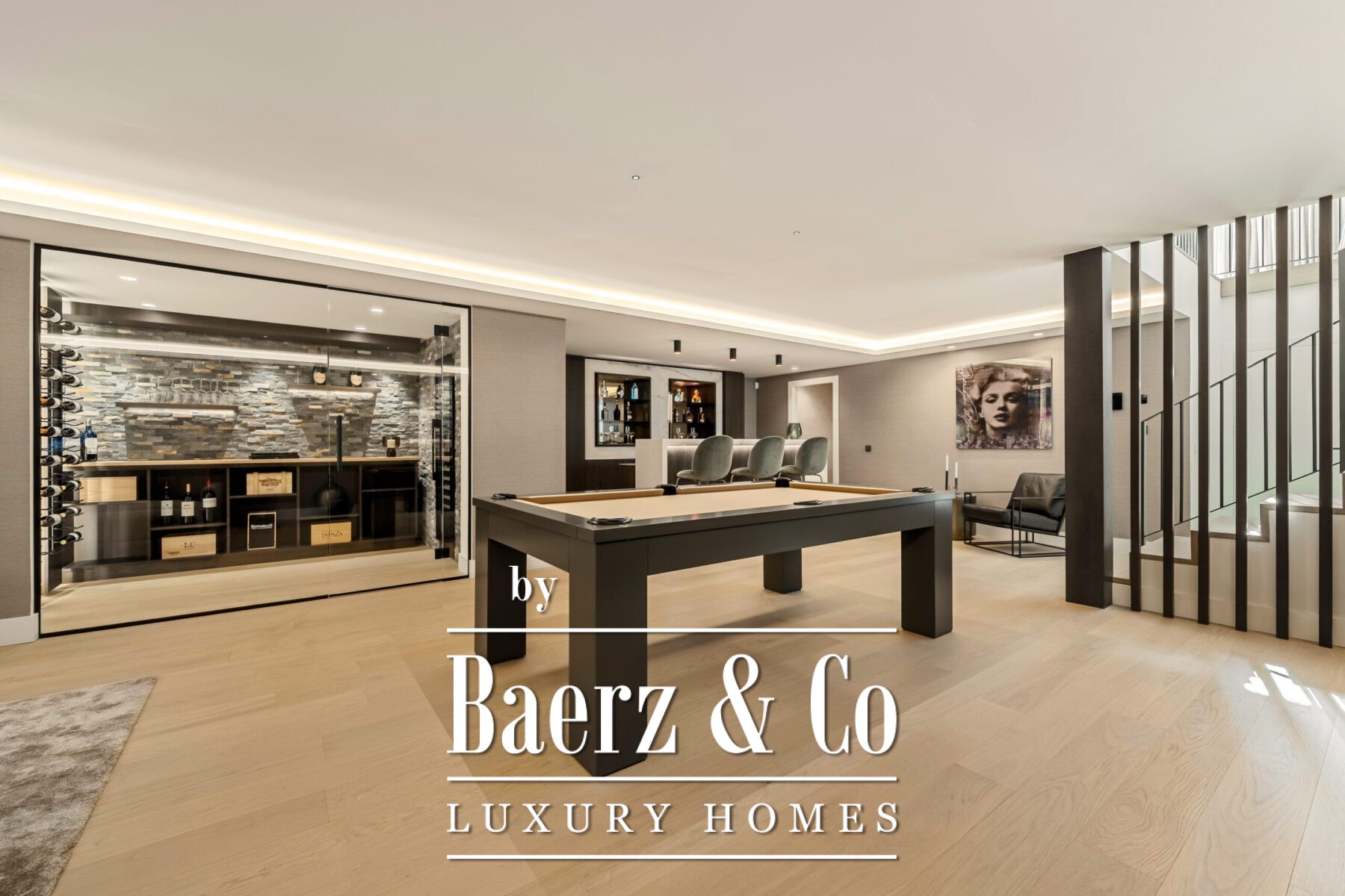 Inside, a spacious open-plan living and dining area wraps around a striking statement kitchen with central island. Five generous bedroom suites provide refined accommodation, including a panoramic principal suite with a private terrace and walk-through dressing room. The lower level offers a sleek entertainment lounge complete with a bar, glass-fronted wine cellar, and billiards table, complemented by two guest WCs and ample storage space.