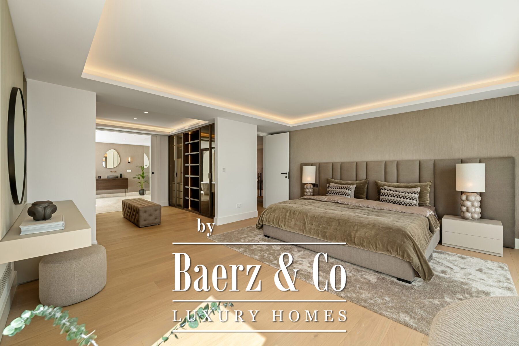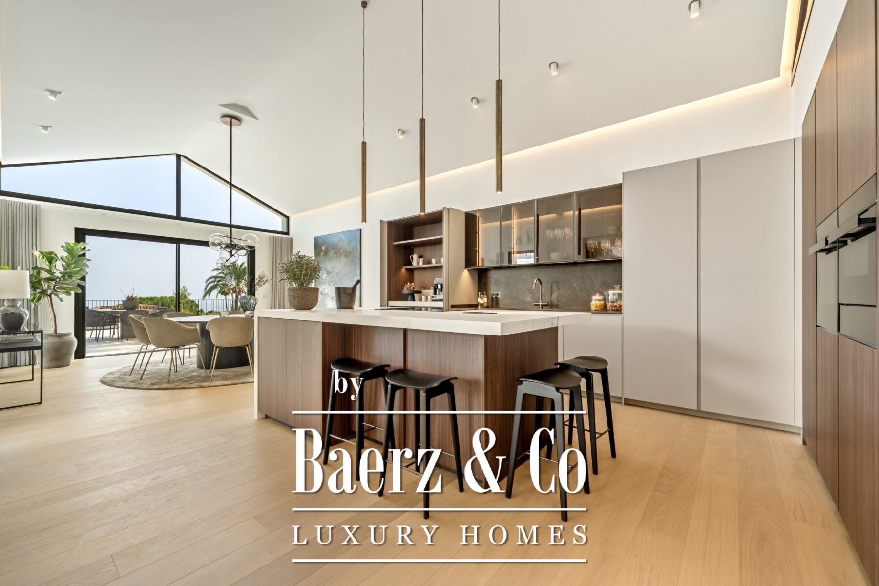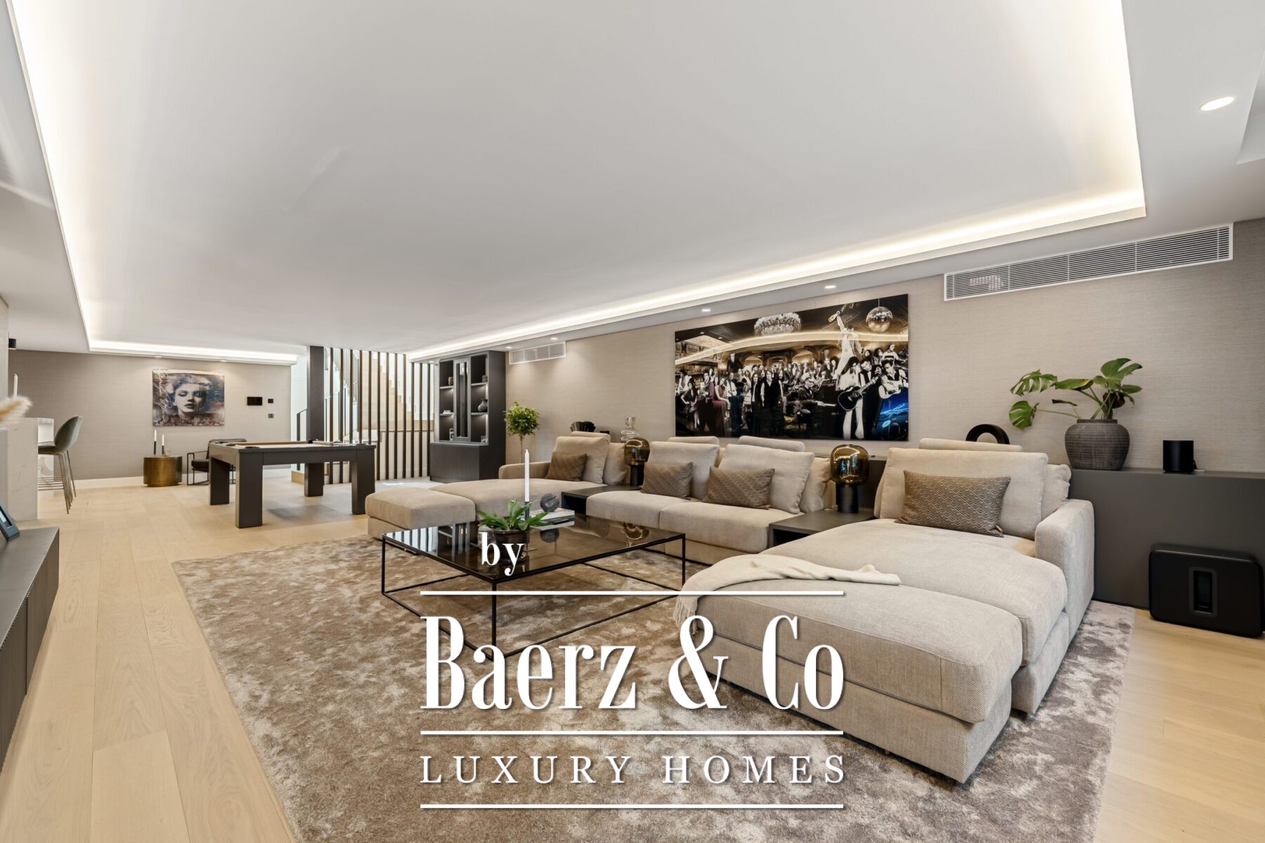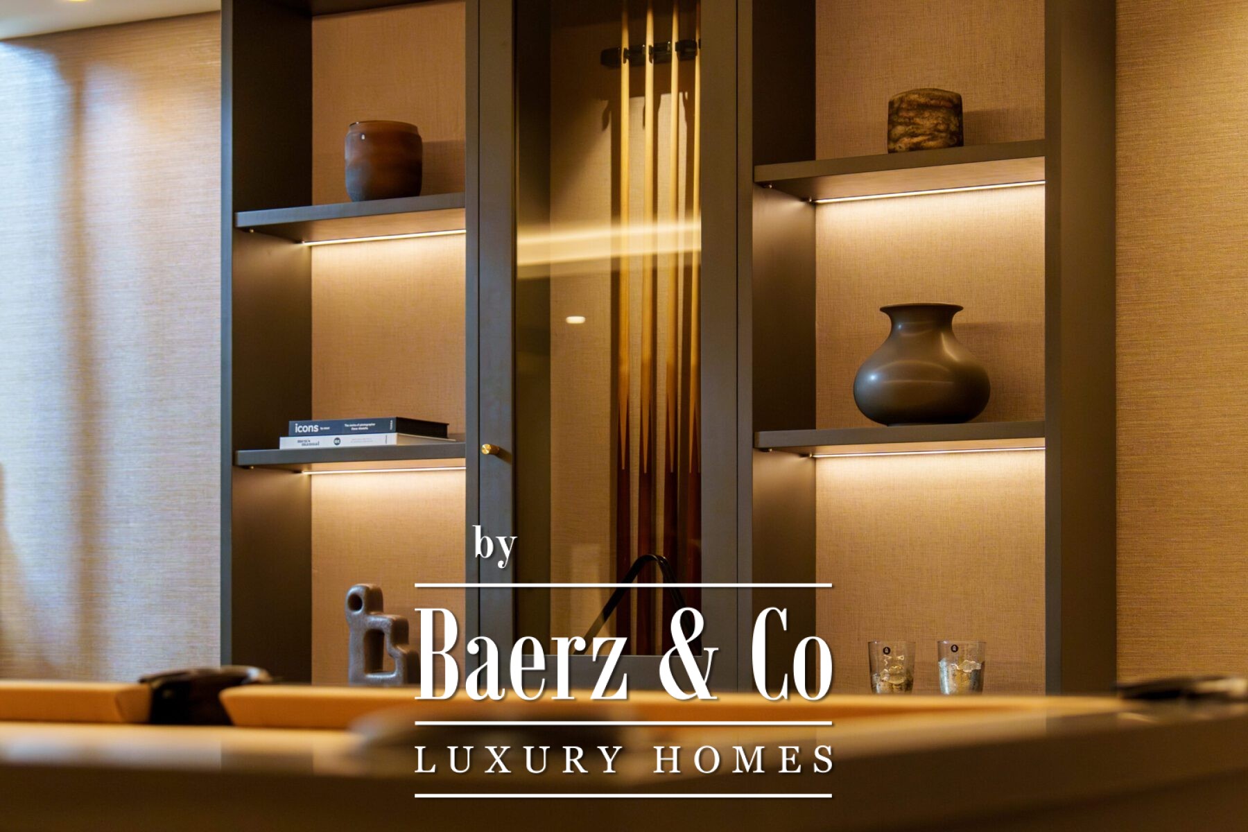 Inside, a spacious open-plan living and dining area wraps around a striking statement kitchen with central island. Five generous bedroom suites provide refined accommodation, including a panoramic principal suite with a private terrace and walk-through dressing room. The lower level offers a sleek entertainment lounge complete with a bar, glass-fronted wine cellar, and billiards table, complemented by two guest WCs and ample storage space.