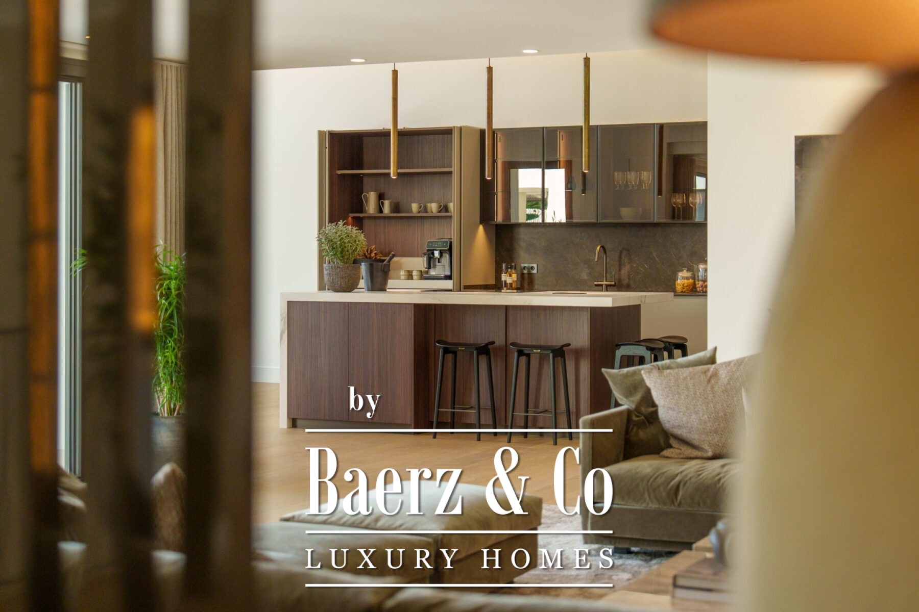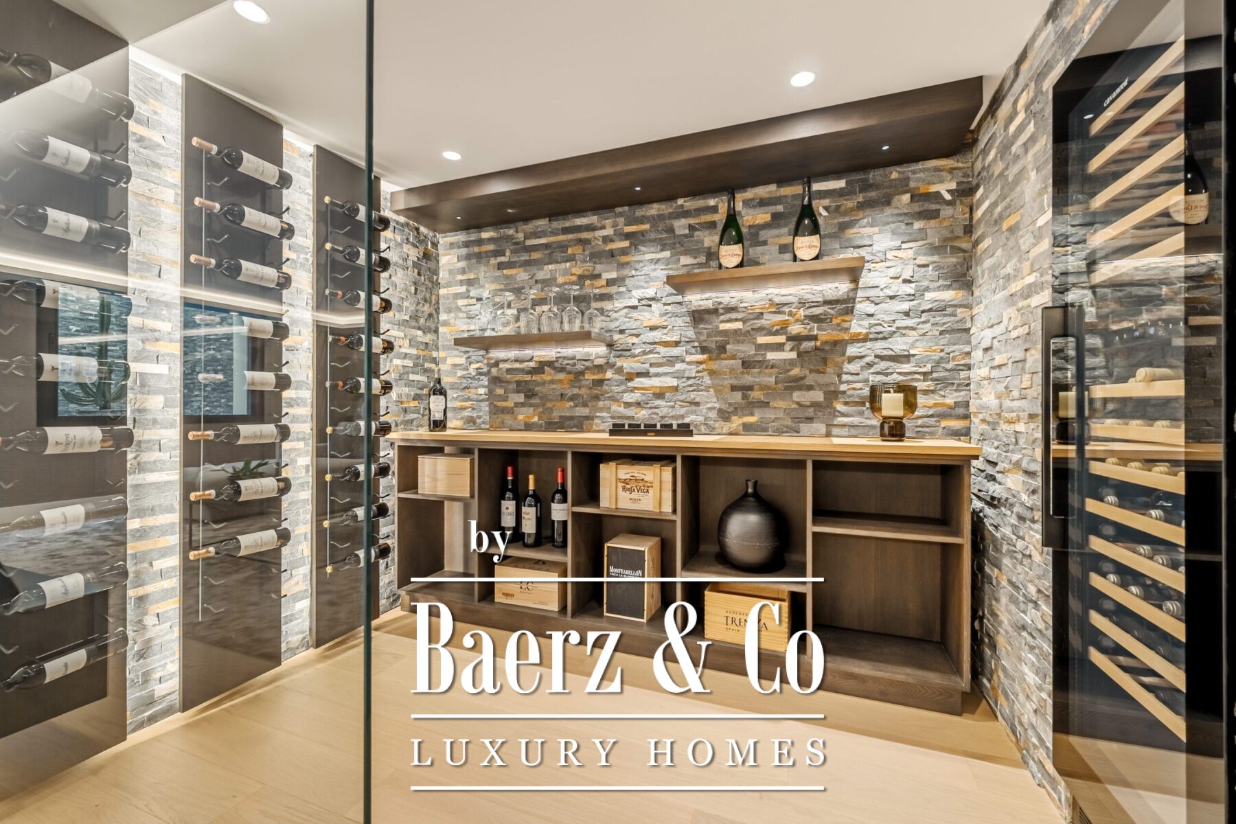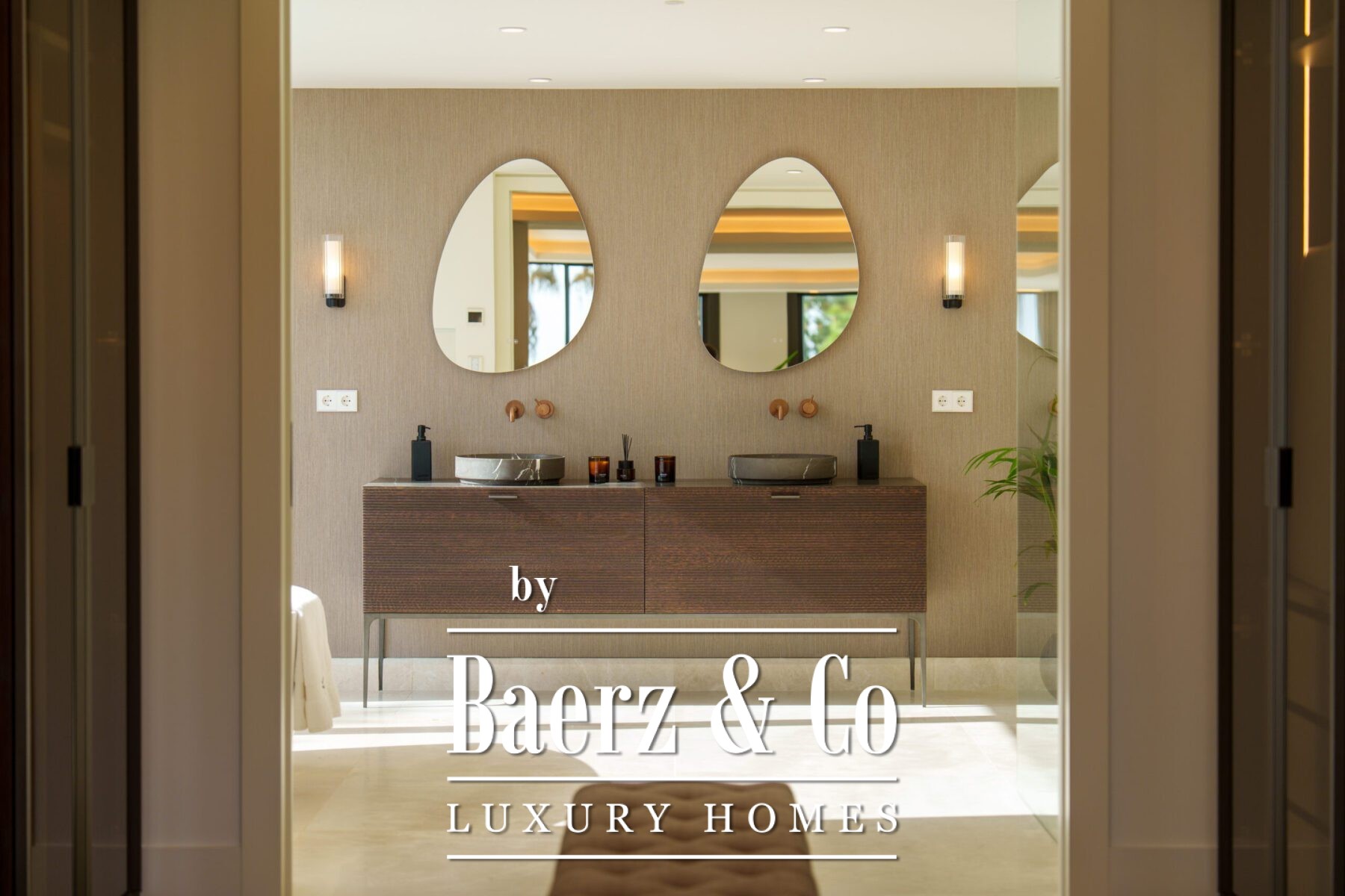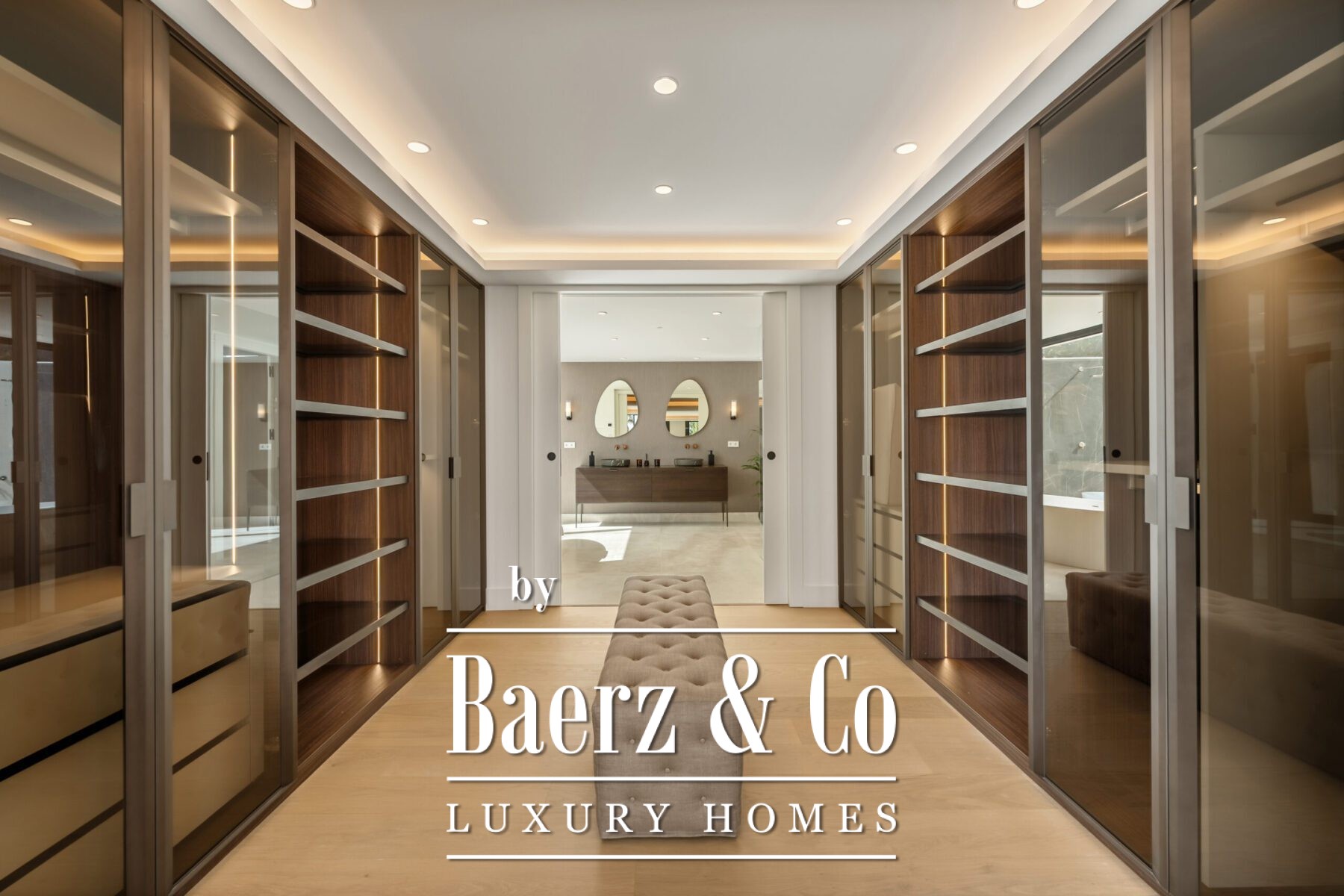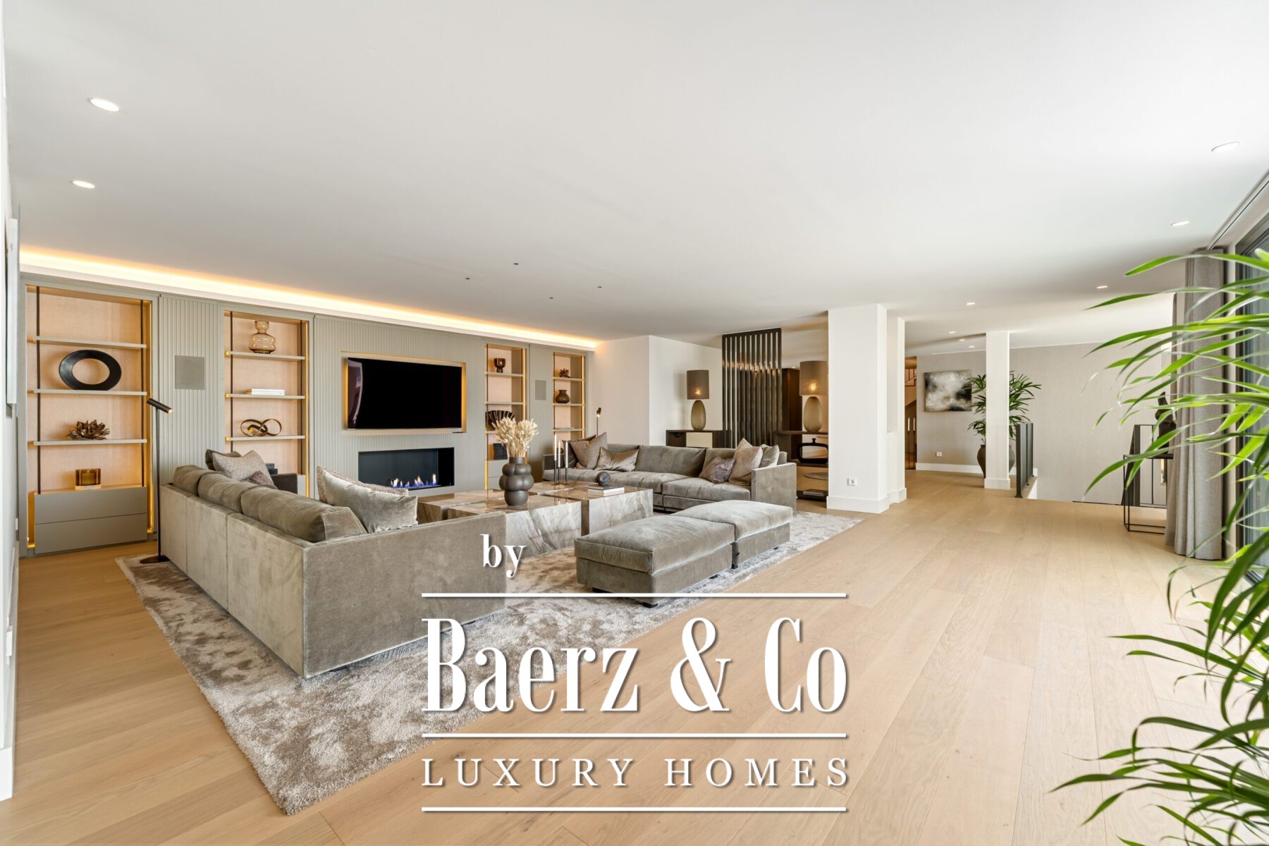 Inside, a spacious open-plan living and dining area wraps around a striking statement kitchen with central island. Five generous bedroom suites provide refined accommodation, including a panoramic principal suite with a private terrace and walk-through dressing room. The lower level offers a sleek entertainment lounge complete with a bar, glass-fronted wine cellar, and billiards table, complemented by two guest WCs and ample storage space.