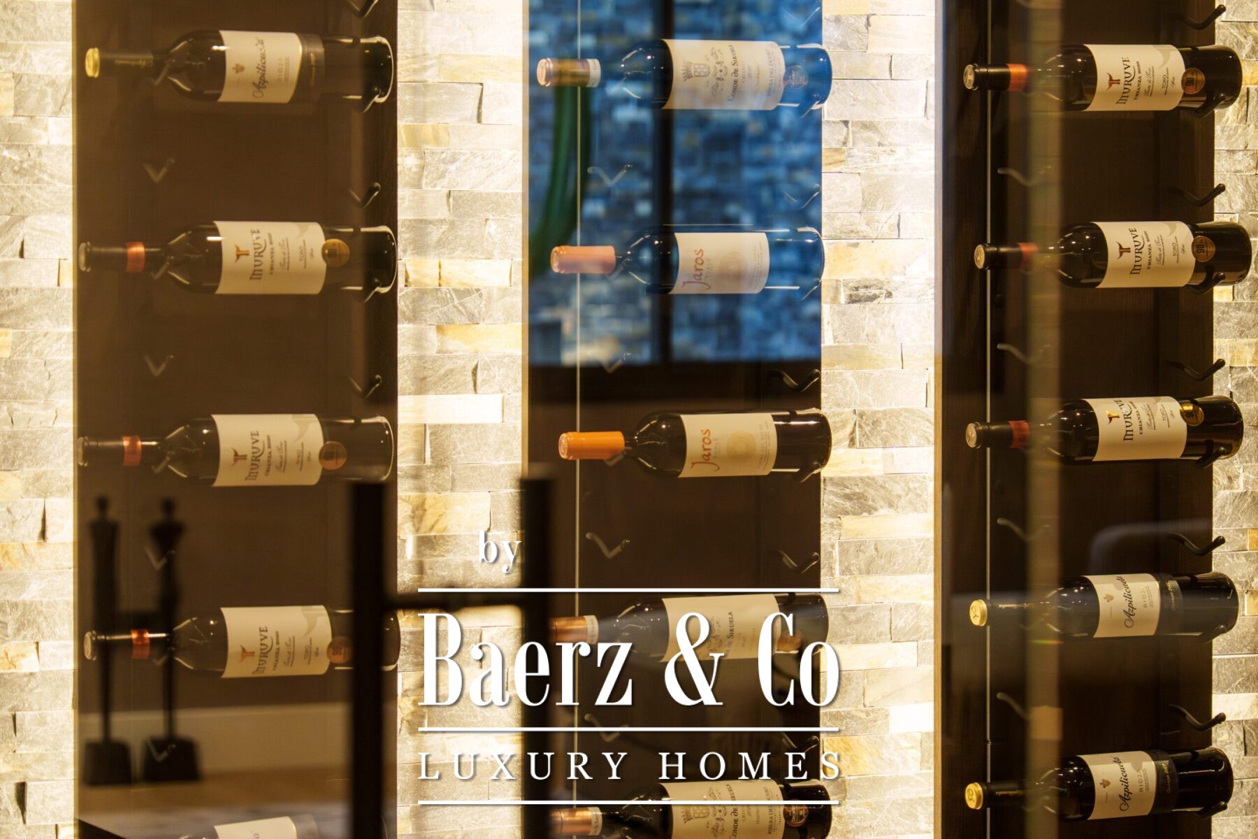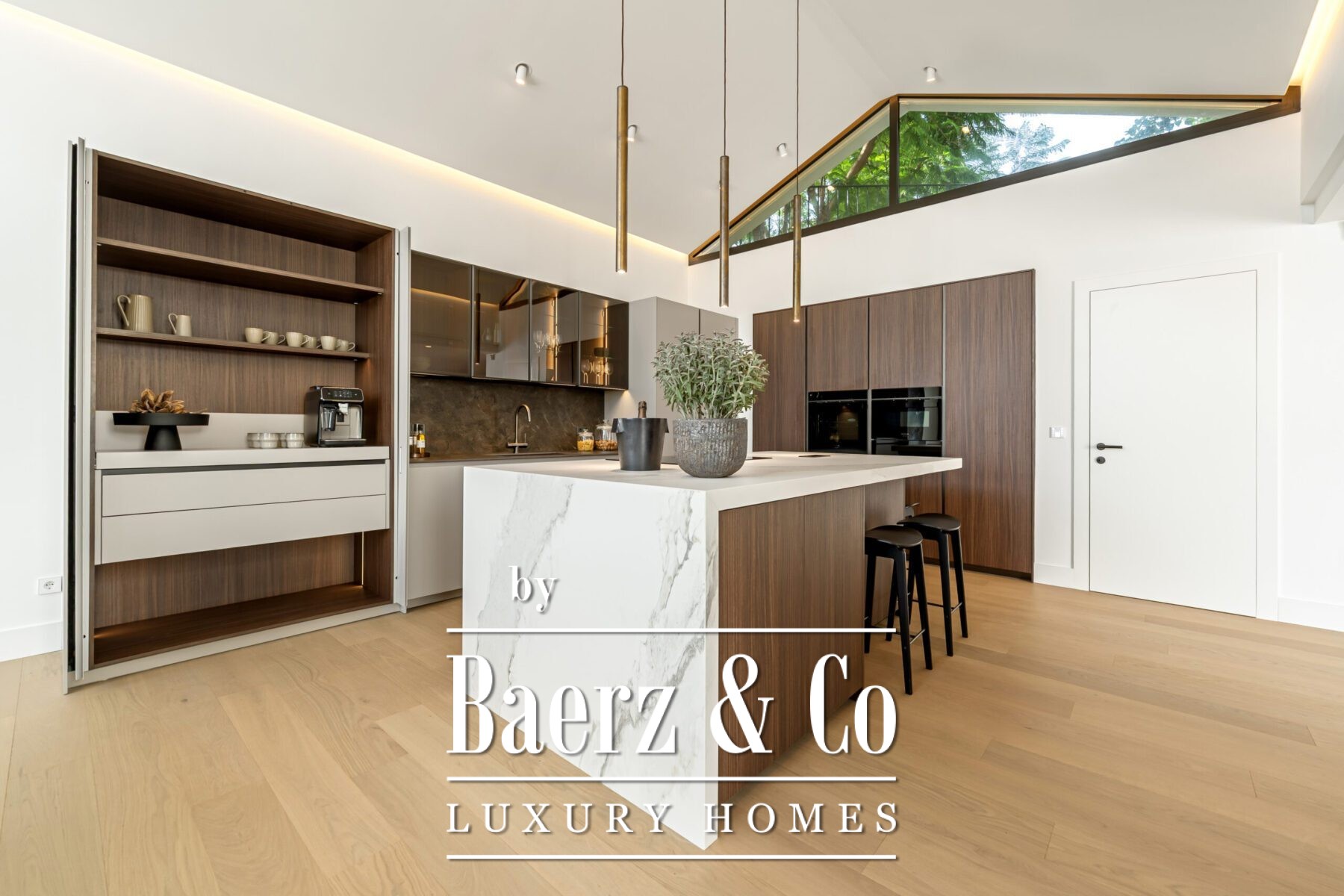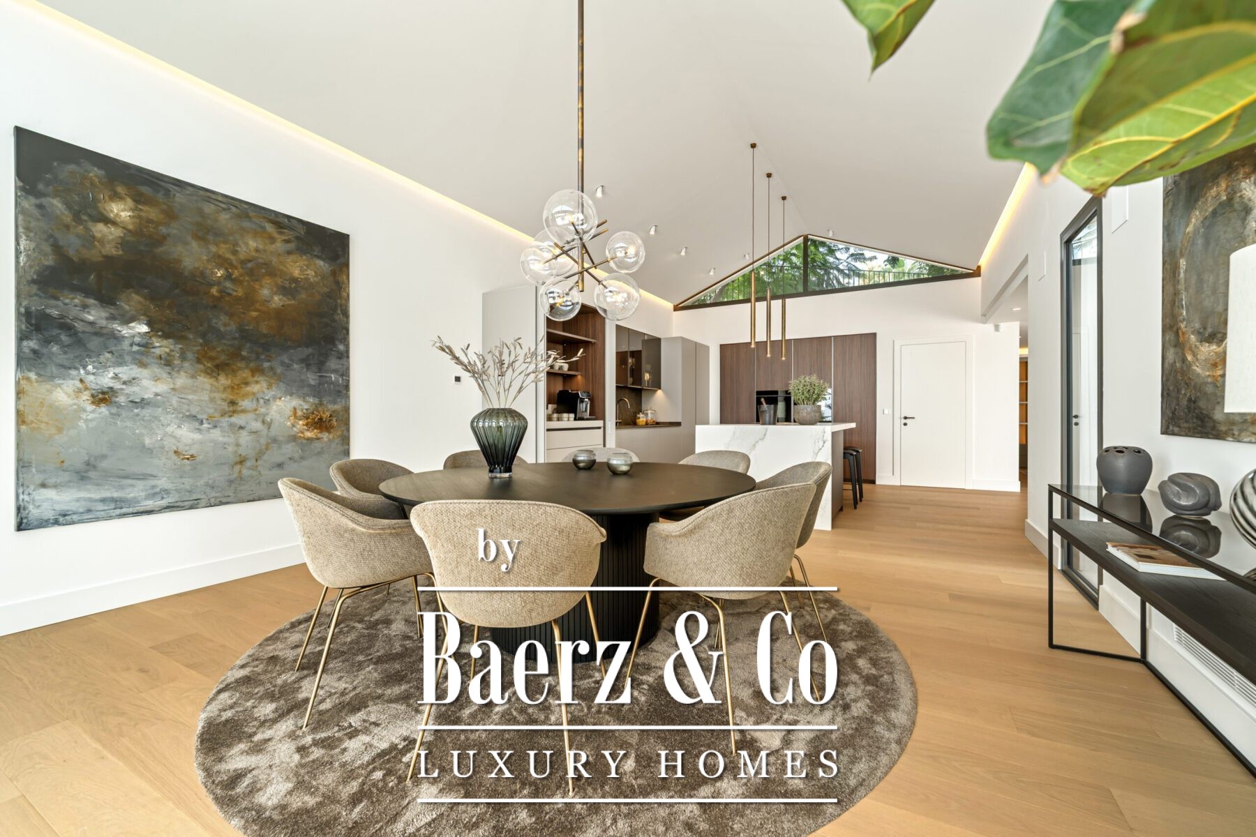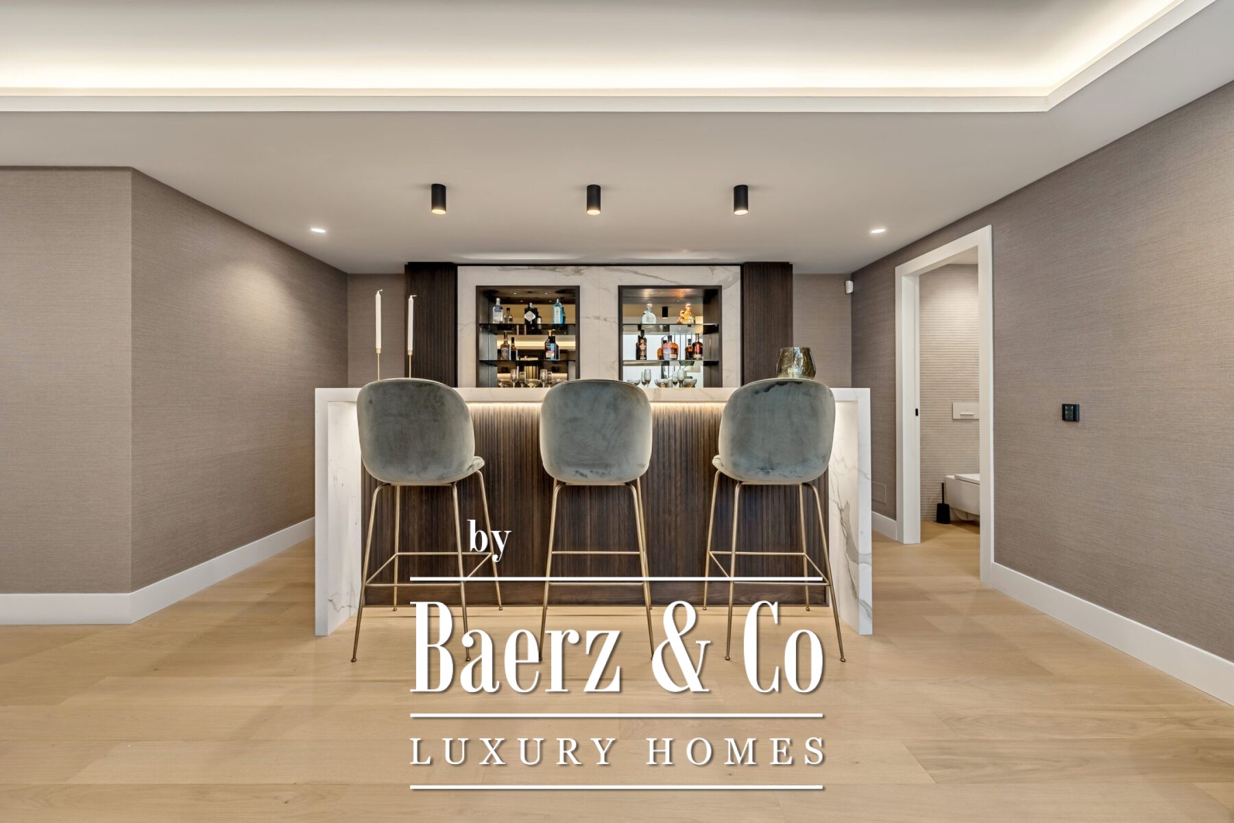 Inside, a spacious open-plan living and dining area wraps around a striking statement kitchen with central island. Five generous bedroom suites provide refined accommodation, including a panoramic principal suite with a private terrace and walk-through dressing room. The lower level offers a sleek entertainment lounge complete with a bar, glass-fronted wine cellar, and billiards table, complemented by two guest WCs and ample storage space.