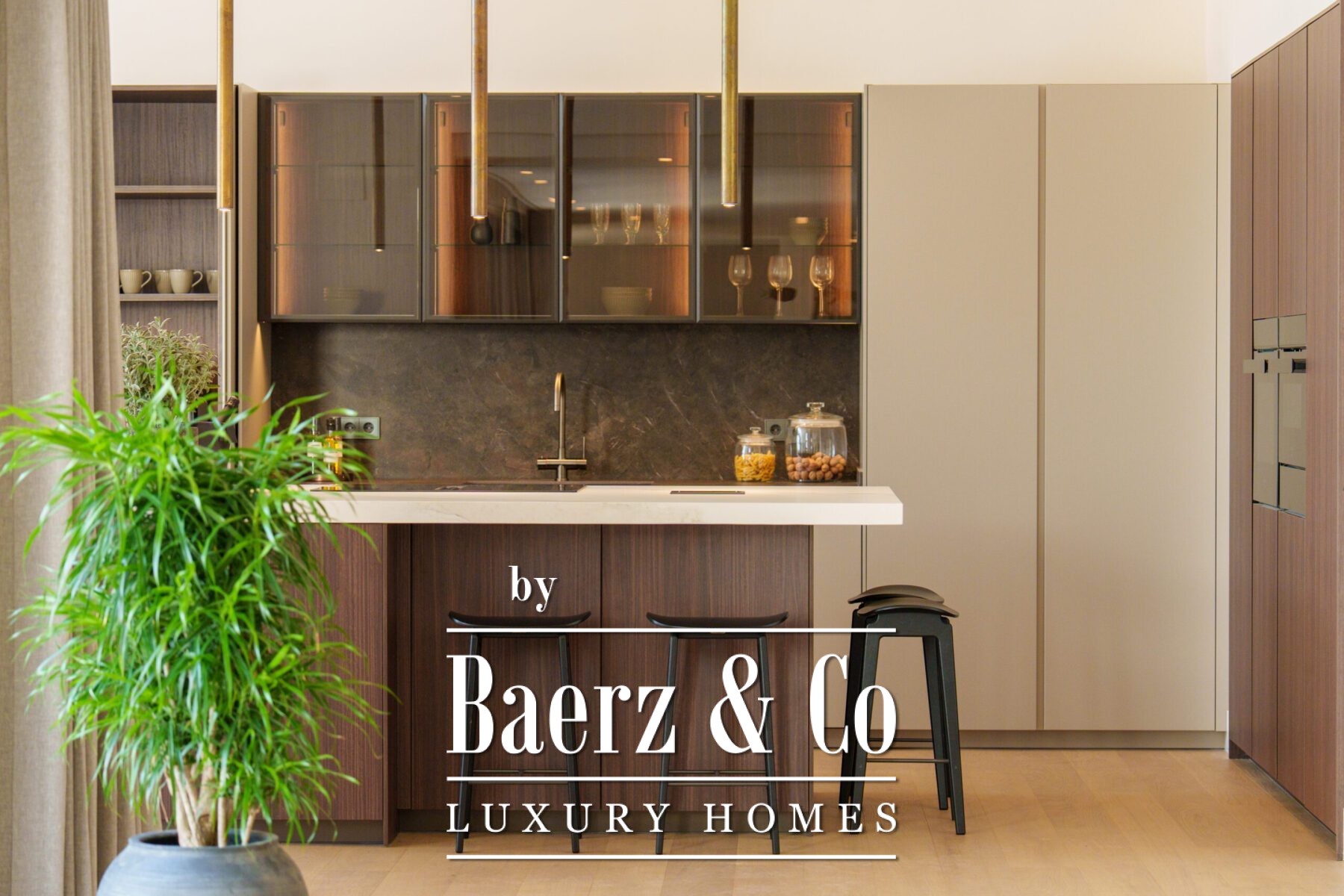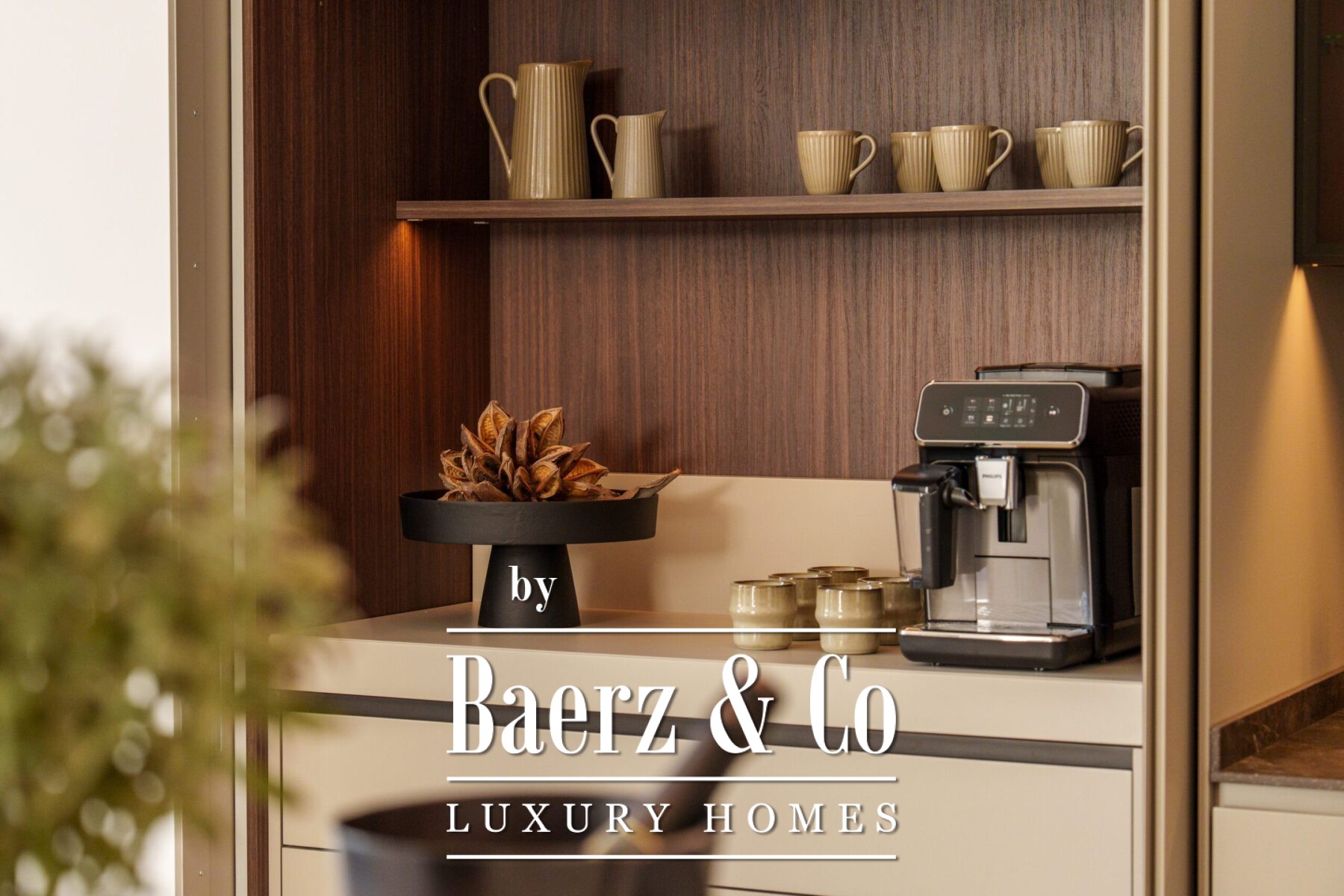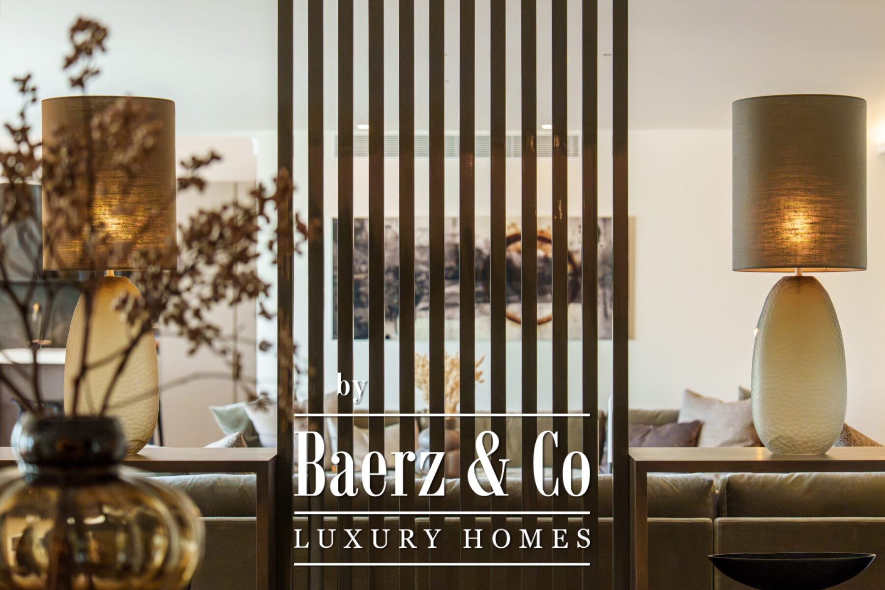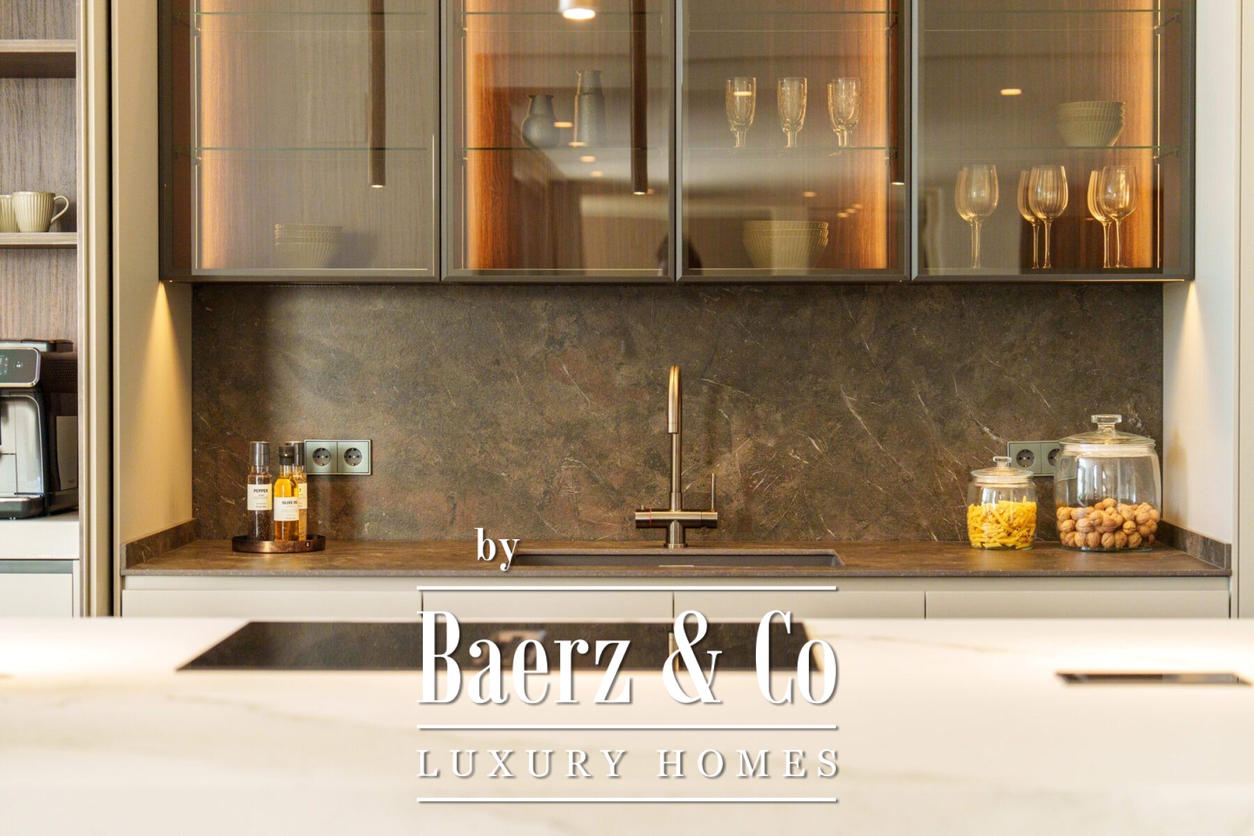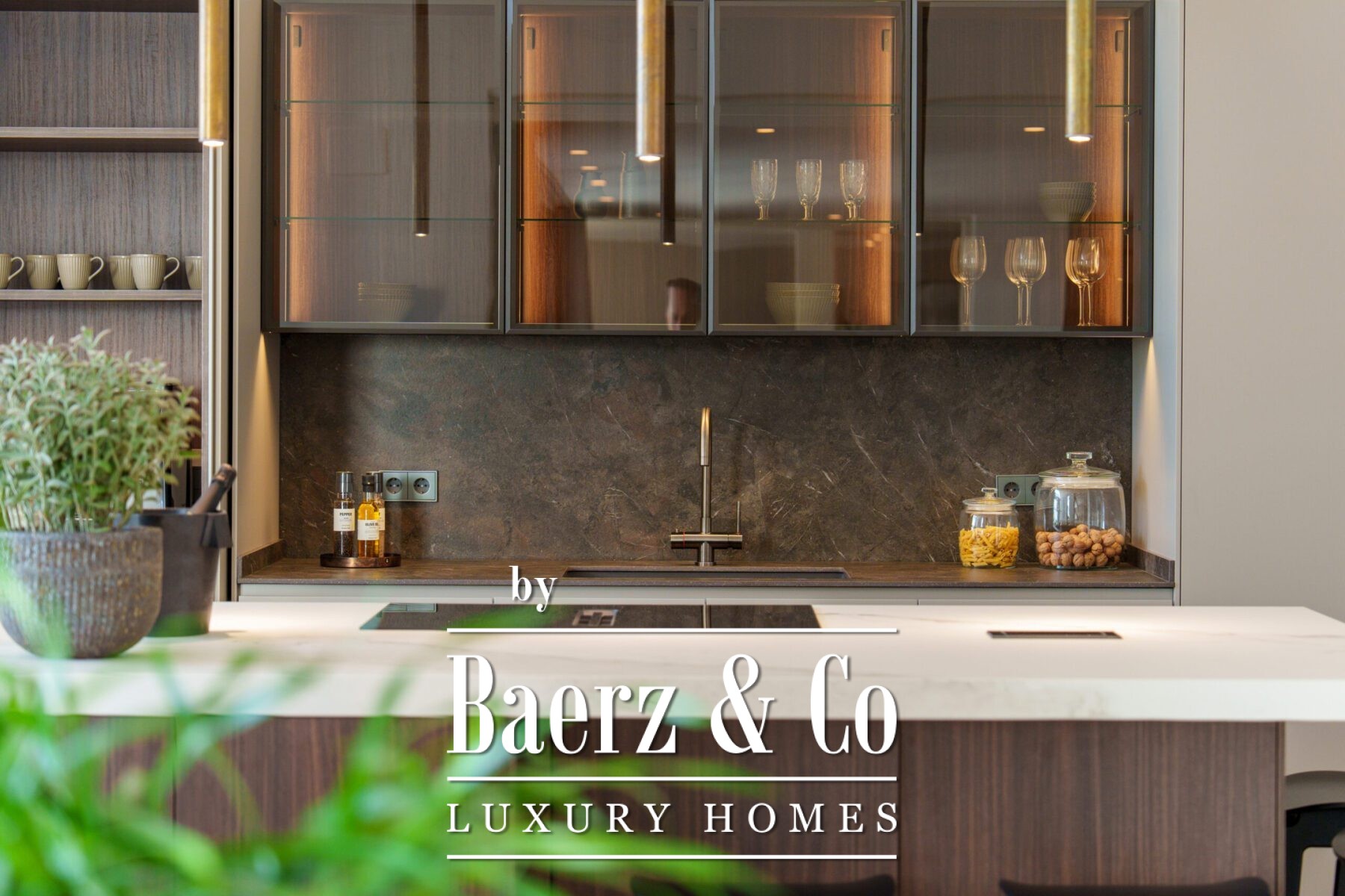 Inside, a spacious open-plan living and dining area wraps around a striking statement kitchen with central island. Five generous bedroom suites provide refined accommodation, including a panoramic principal suite with a private terrace and walk-through dressing room. The lower level offers a sleek entertainment lounge complete with a bar, glass-fronted wine cellar, and billiards table, complemented by two guest WCs and ample storage space.