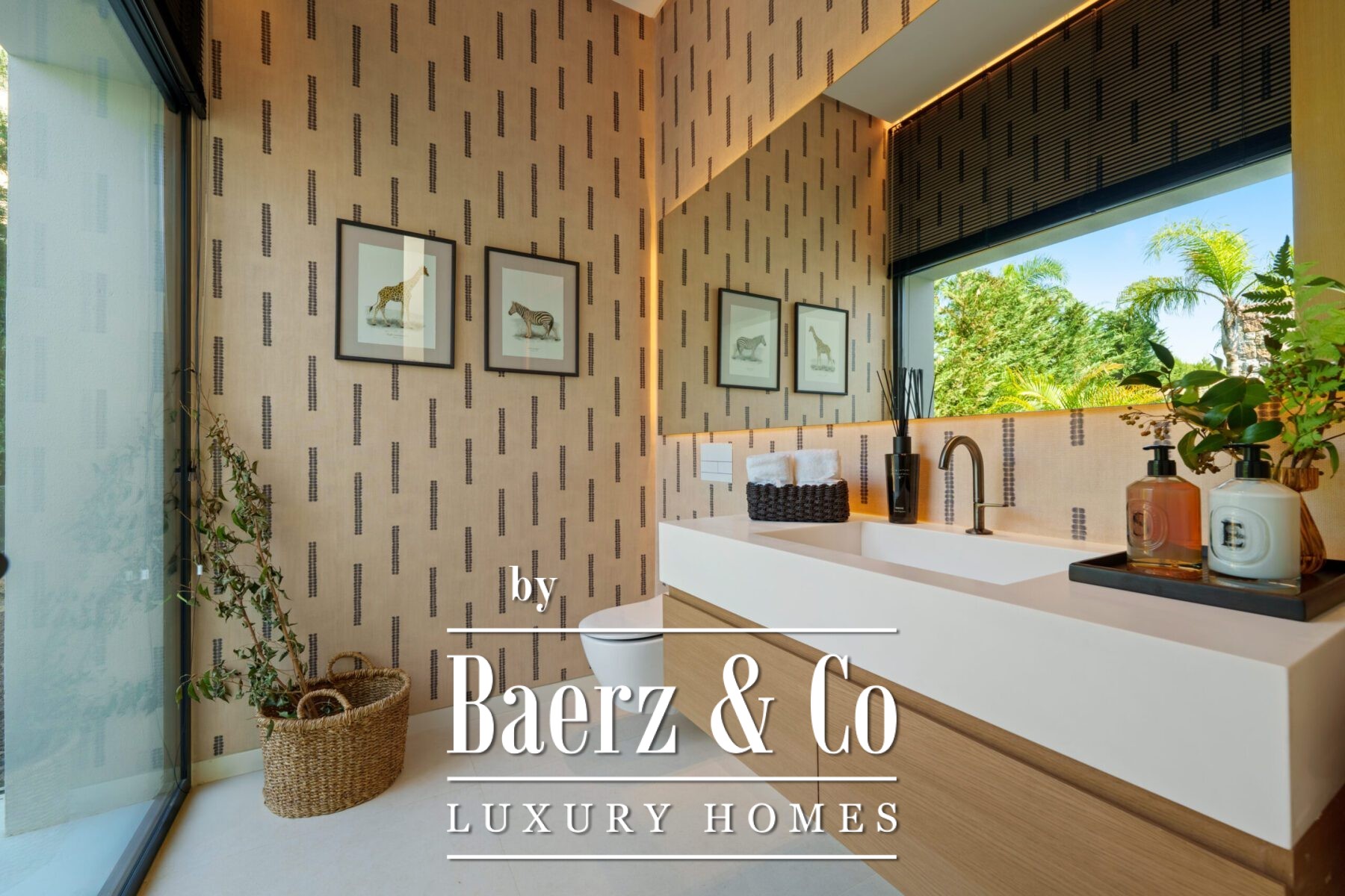 The lower level is dedicated to leisure and lifestyle. It boasts a playroom, TV lounge, bar, gym, and sauna, as well as two additional en-suite bedrooms and a home office.
