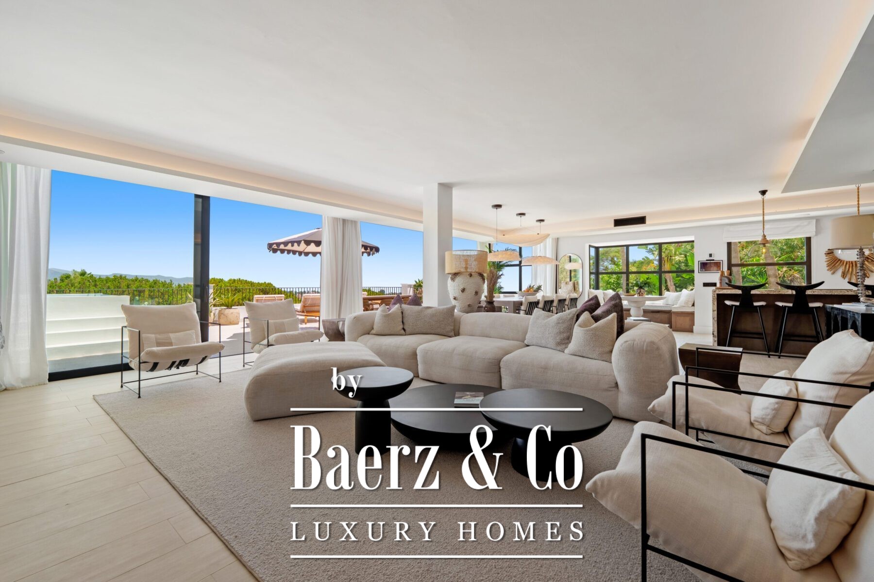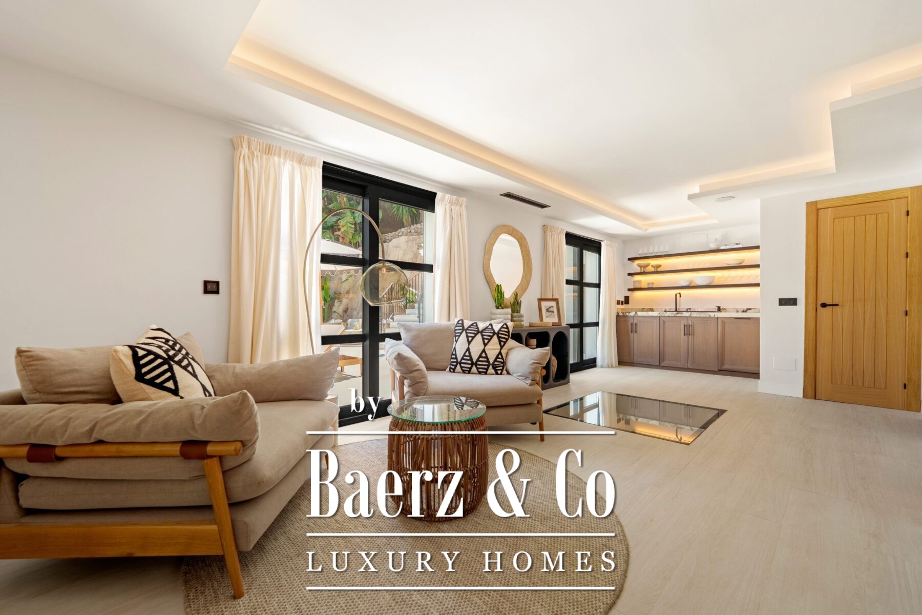 Outside, landscaped gardens embrace a private swimming pool and sunken lounge, adorned with ambient lighting and shaded spaces for tranquil reflection or social occasions. A multi-car garage, security features, and proximity to golf courses, the beach, Puerto Banús, and Marbella’s amenities complete the offering.