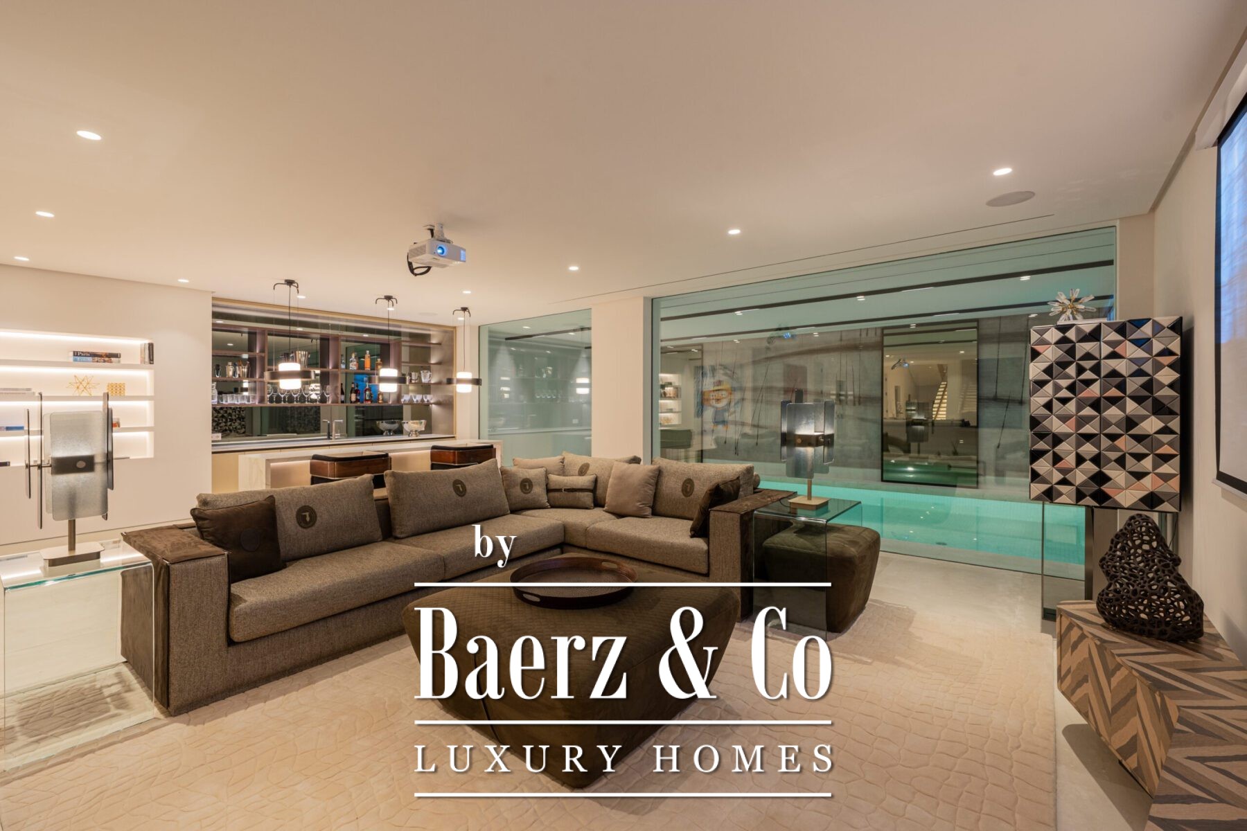 The open plan living area maintains cohesion and spatial clarity, letting natural light move unobstructed. Finer details and considered artwork provide every corner with a sense of distinction, while the kitchen, fitted with state-of-the-art appliances and a wine cooler, serves both daily ritual and social gathering. Five bedrooms and six bathrooms unfold with subtle grandeur, featuring double vanities, custom showers, and stand-alone bathtubs.