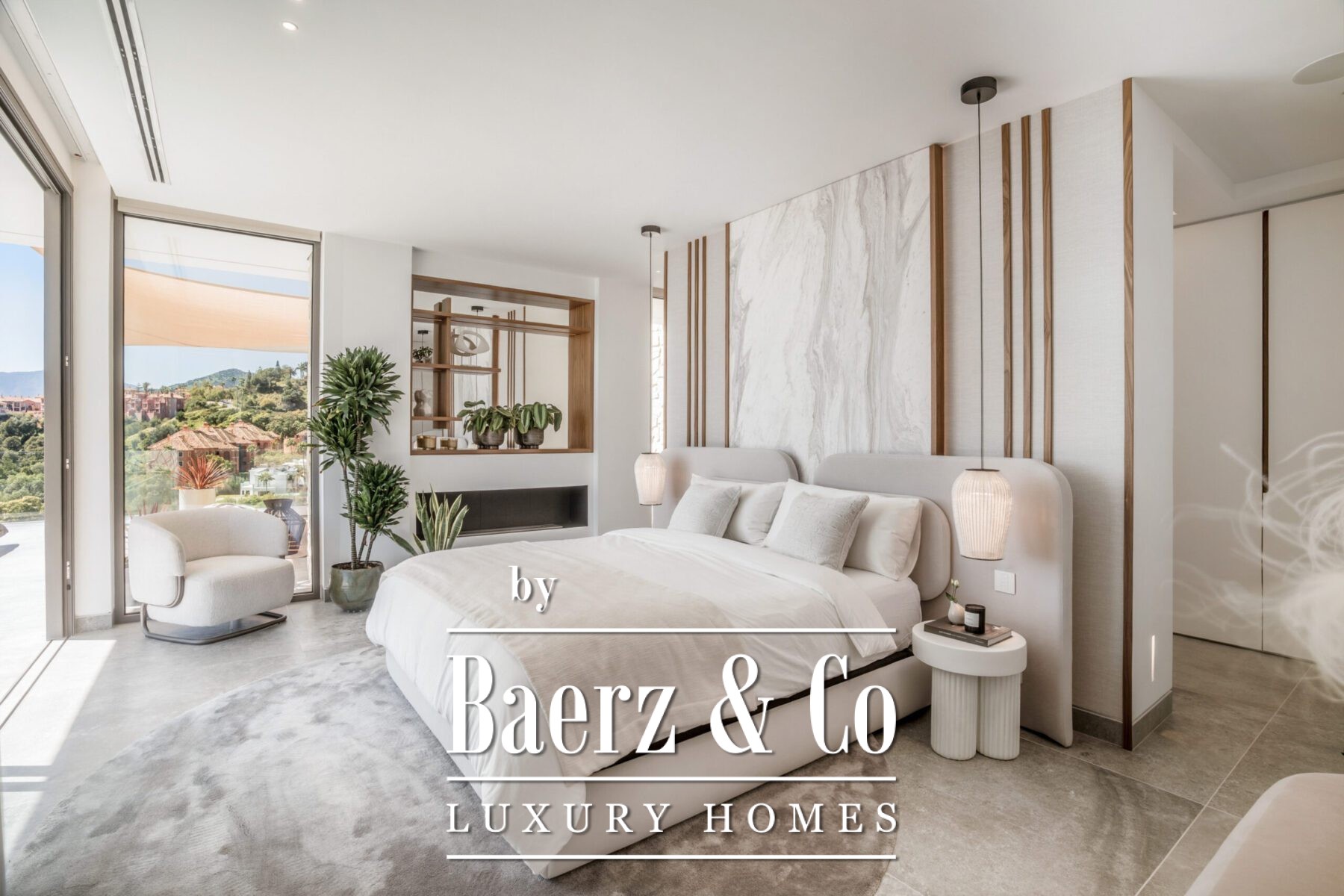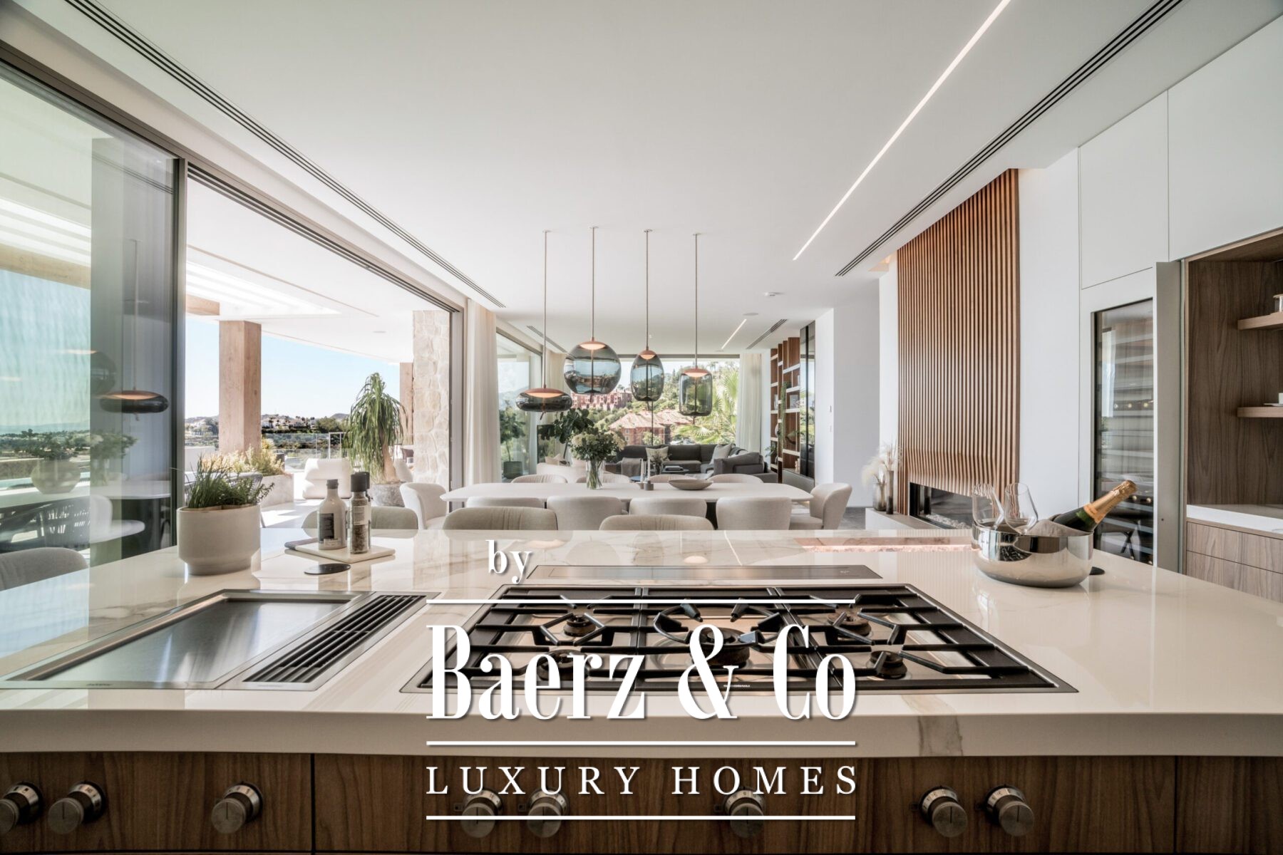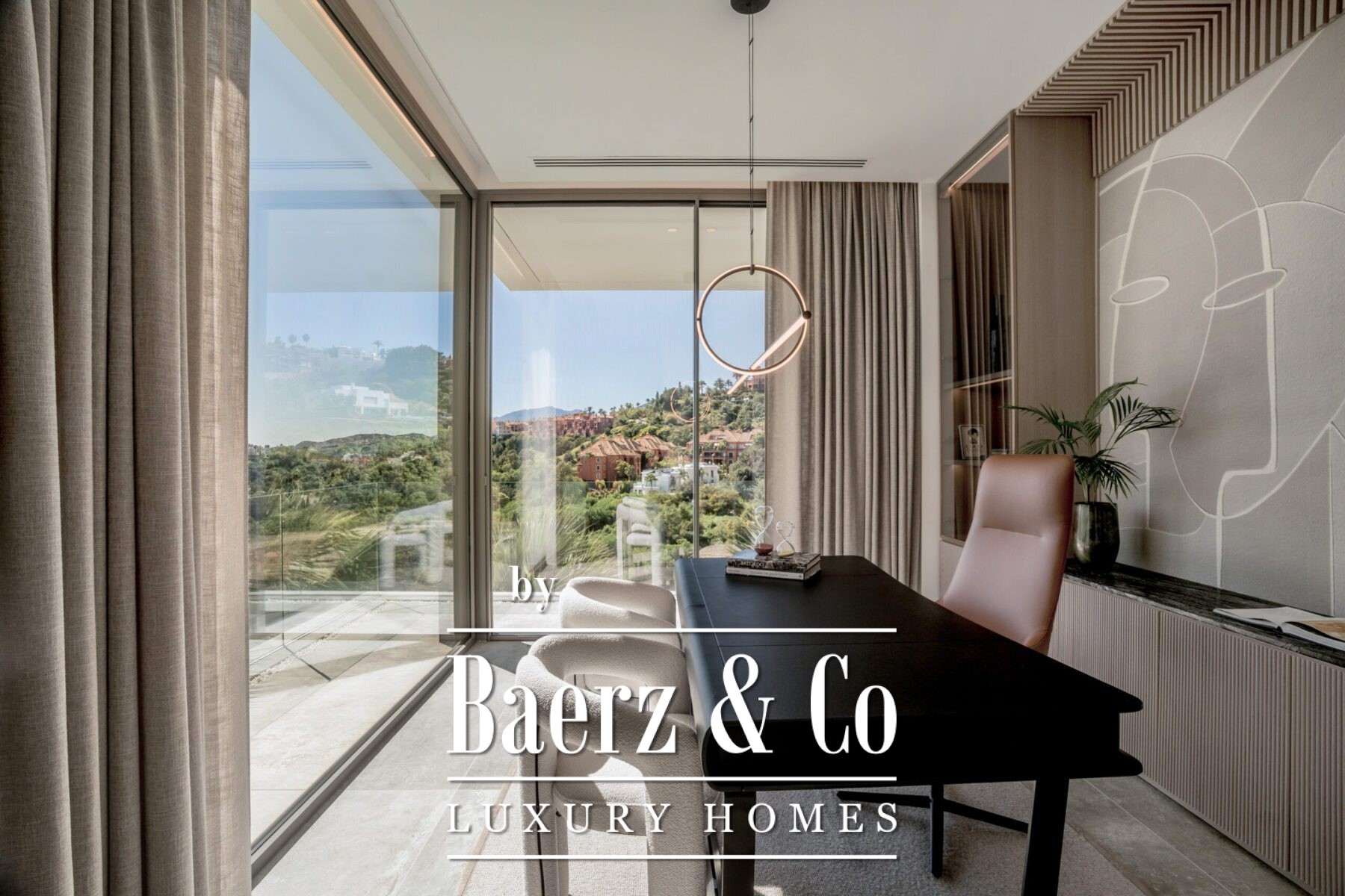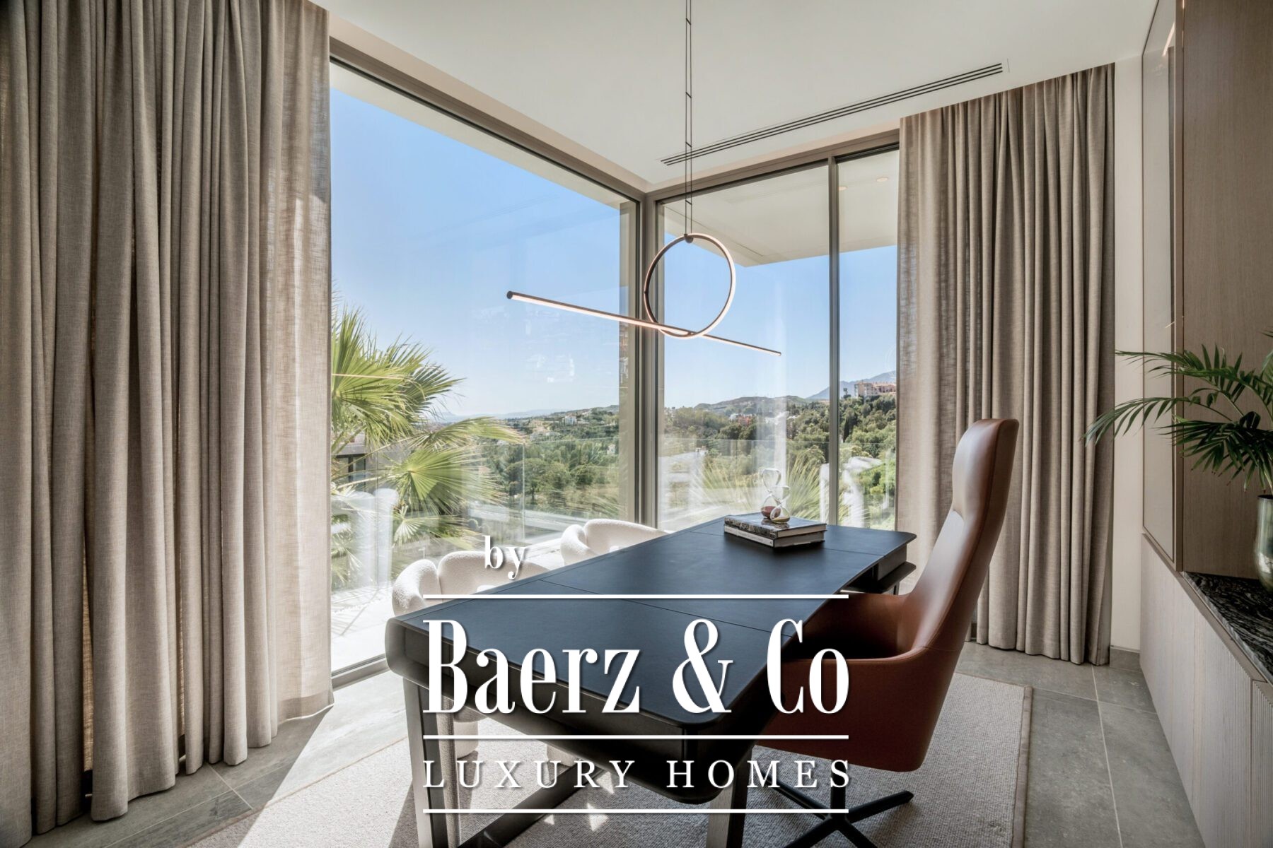 Crafted for contemporary demands, the kitchen features Gaggenau appliances and cabinetry by Danespan, while an adjacent home office ensures space for quiet productivity. The villa is situated within a gated community and benefits from 24-hour security, an alarm, and proximity to golf courses, amenities, and the coast. Every detail conveys understated opulence and an effortless connection to Marbella’s coastal setting.