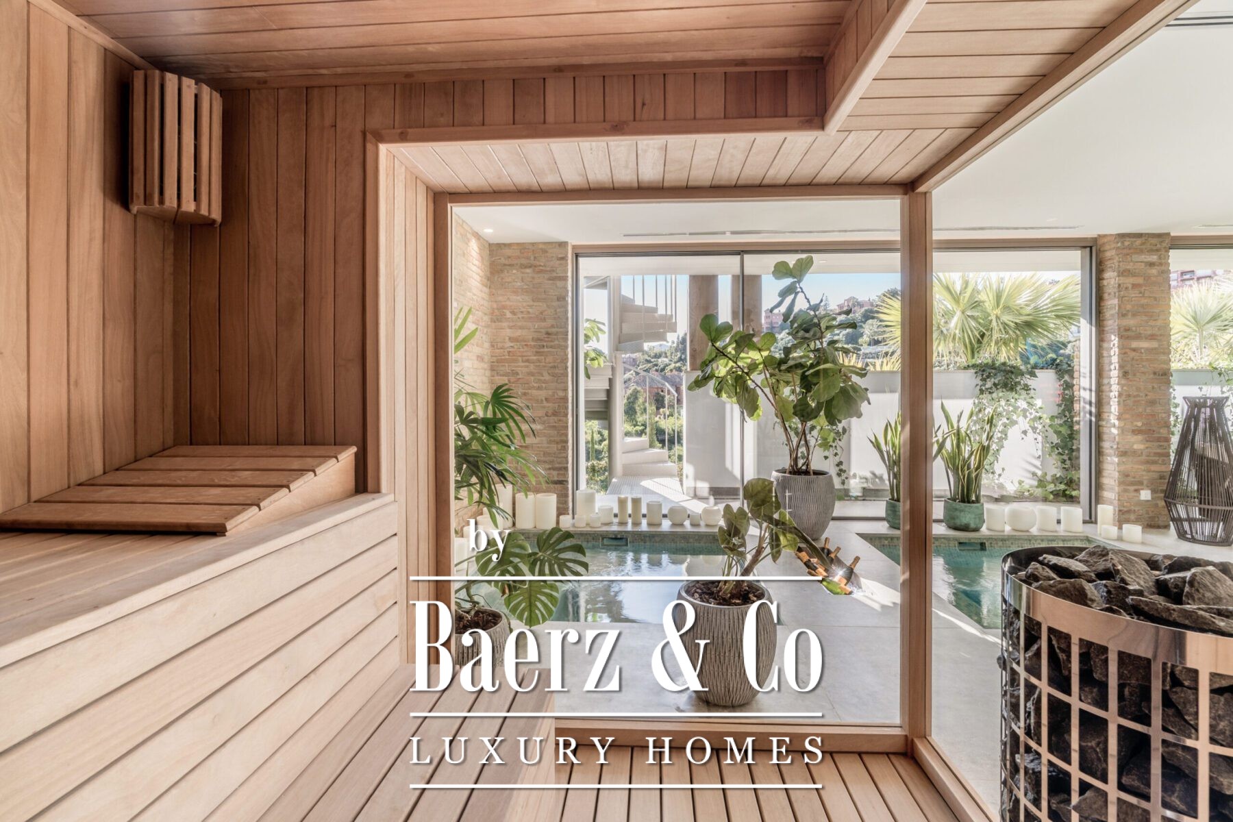 Living here is a study in luxury and wellness. A private spa is equipped with an indoor heated pool, sauna, steam room, Jacuzzi, and a dedicated massage area. The gym, fitted with Eleiko equipment, supports a disciplined lifestyle. There is an entertainment room and a striking outdoor cinema beside the infinity swimming pool, ideal for evenings beneath Marbella’s sky.
