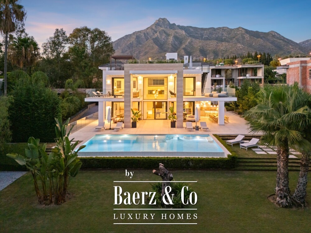 Expansive spaces include a formal dining room, a designer kitchen, and a refined entertainment lounge, each flowing with understated elegance. Private bedroom suites—each with its own bathroom—provide sanctuary, while the master suite introduces a spa-inspired bathroom with a freestanding tub and sweeping views of La Concha mountain. Outdoor living is both private and impressive, featuring multiple terraces, a rooftop lounge with Jacuzzi, and an infinity pool, all framed by landscaped gardens on a 1,556 m² plot.