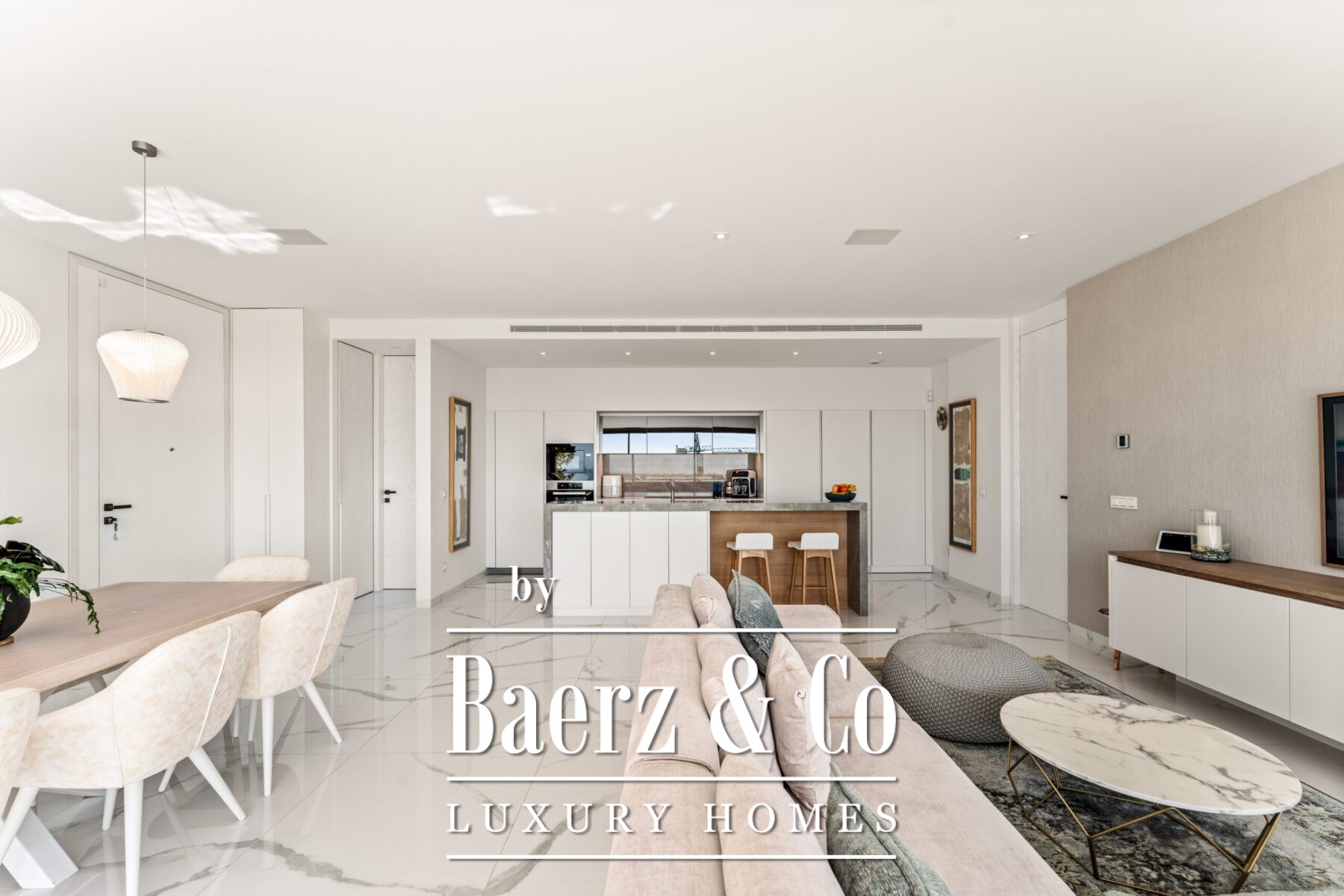 Indoors, open-plan living, dining, and kitchen areas harmonise contemporary Scandinavian tone with functional sophistication. Features such as floor-to-ceiling doors, Miele appliances, stone worktops, electric blinds, underfloor heating, and a guest WC contribute to a cohesive, comfortable atmosphere. Two underground parking spaces and a storage room ensure practical luxury.