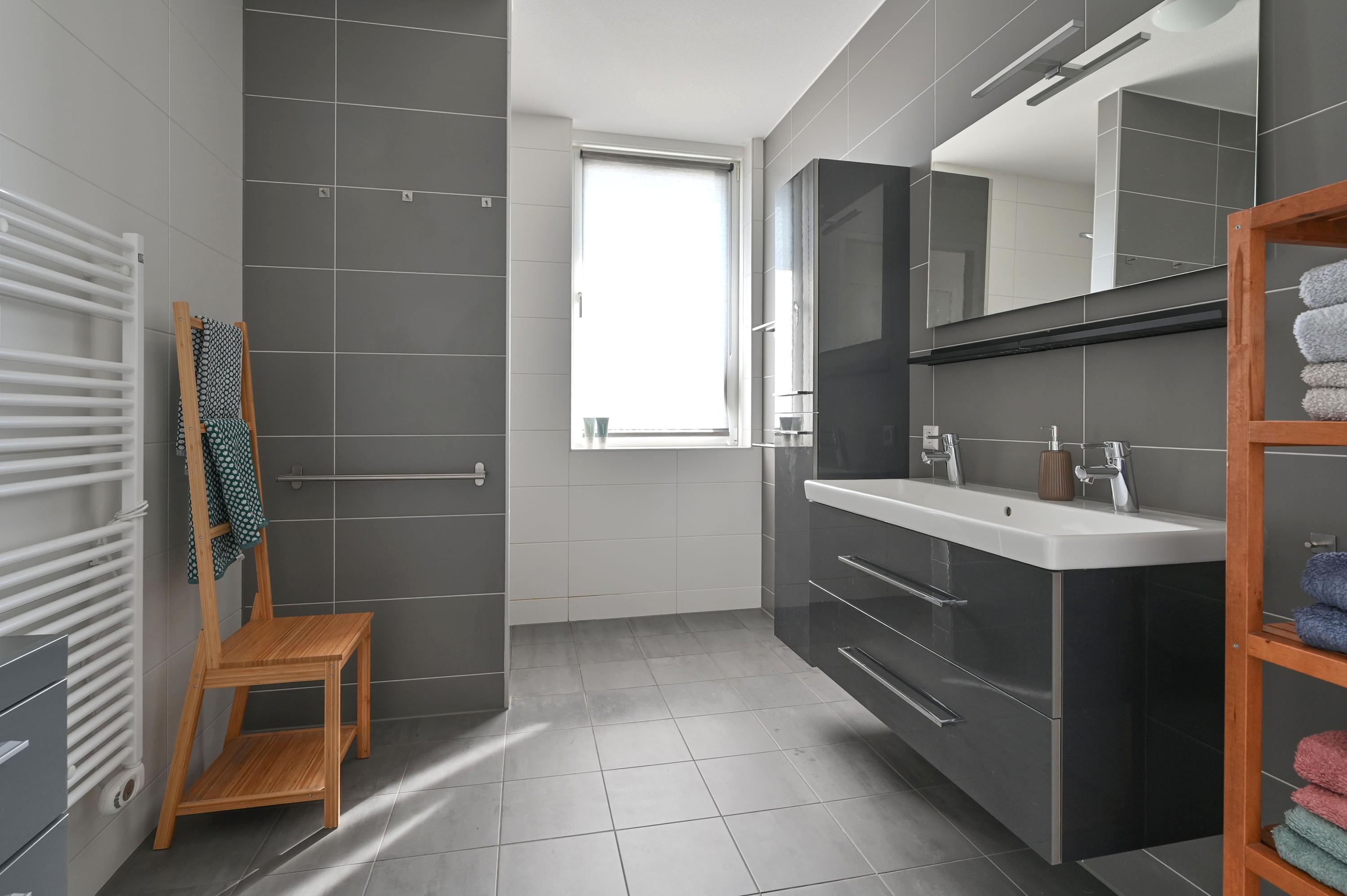 The spacious anthracite gravel driveway offers parking for two cars and includes a private charging station. From here you reach the stylish entrance of the villa. Inside, the generous hall with a large corner window immediately catches the eye, flooding the space with natural light. From the hall, you have access to various rooms and the staircase to the first floor.