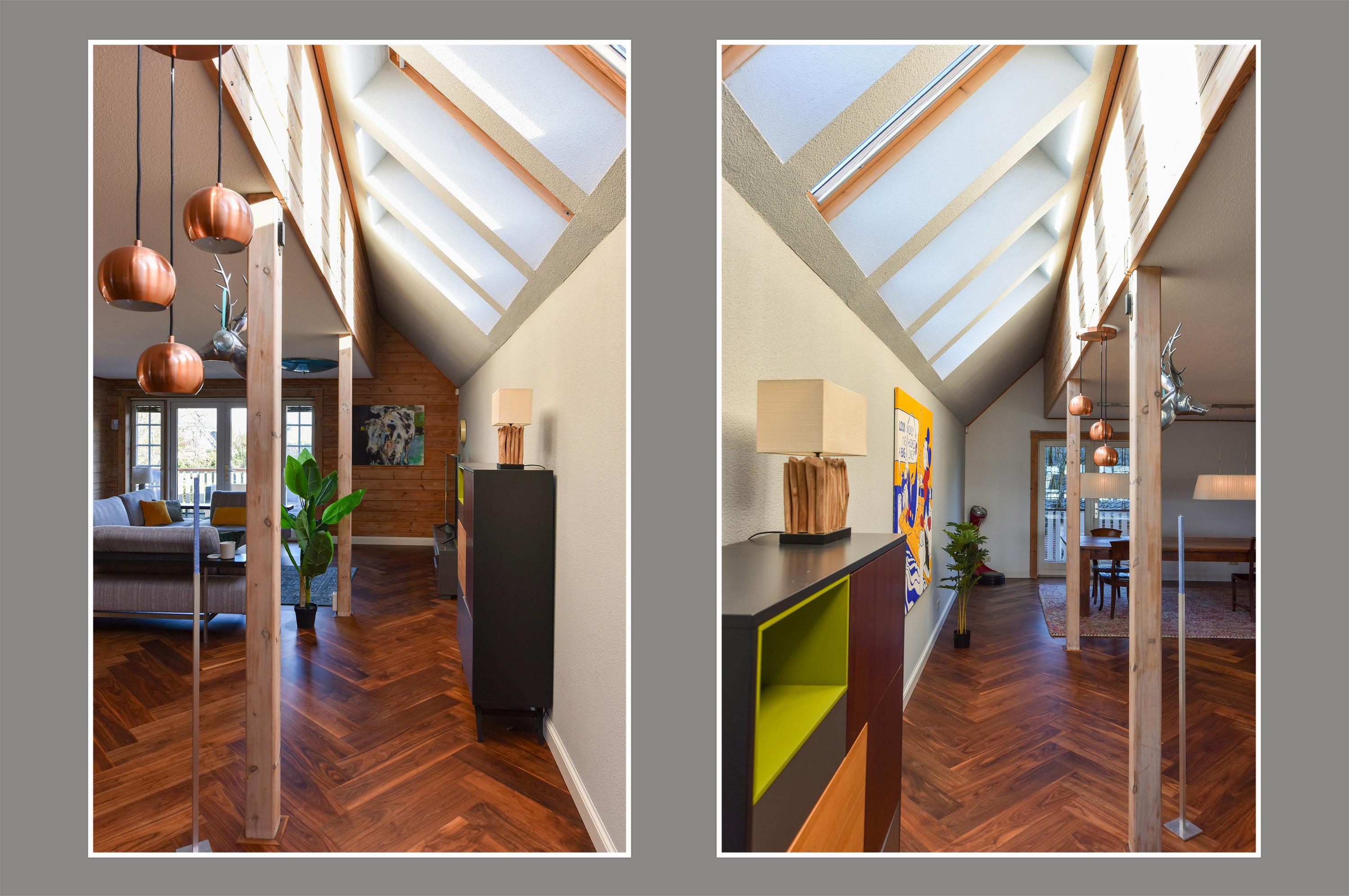 A charming, sheltered courtyard leads to a wooden staircase that takes you to the veranda surrounding the house. Upon entering, you step into the spacious hallway, which features a toilet with a sink and gives access to the living room, library, and utility room. The bright and spacious living room is a true oasis of atmosphere, thanks to the walnut herringbone floor, the stained-glass sliding doors leading to the library, and the French doors opening onto both the veranda and the garden. The many skylights positioned southward allow ample natural daylight into the living room.