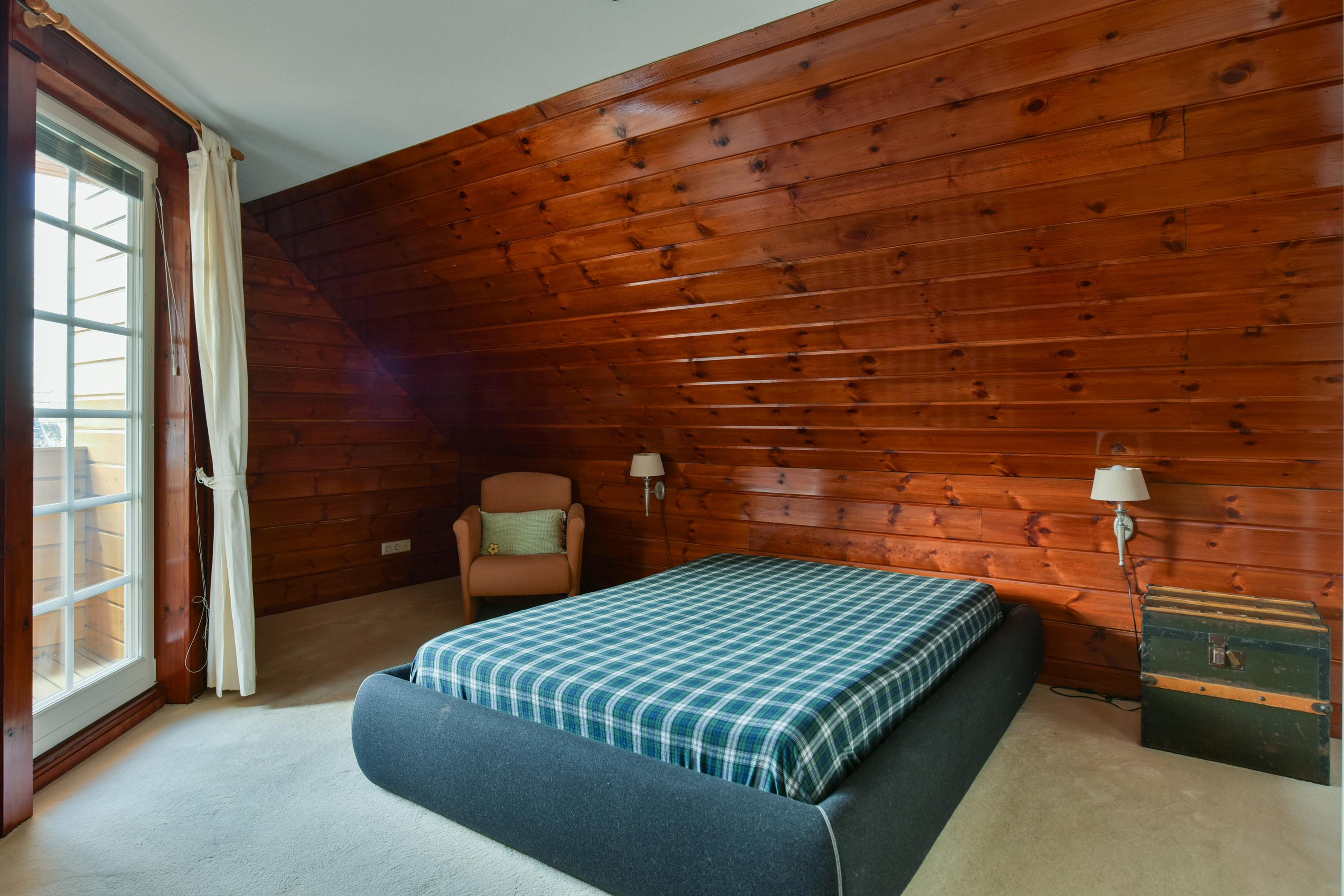 The open wooden staircase in the central hallway takes you to the first floor. The spacious landing, with skylights, makes this floor wonderfully bright. Here, you'll find four truly large bedrooms, all with access to outdoor spaces. At the front is a playful loggia, and the rear bedrooms open onto a wide balcony. The light-filled bathroom, with a skylight, is equipped with a luxurious round whirlpool bathtub, a large walk-in shower, and space for a sauna. A separate toilet with a sink and a storage closet are accessible from the landing.