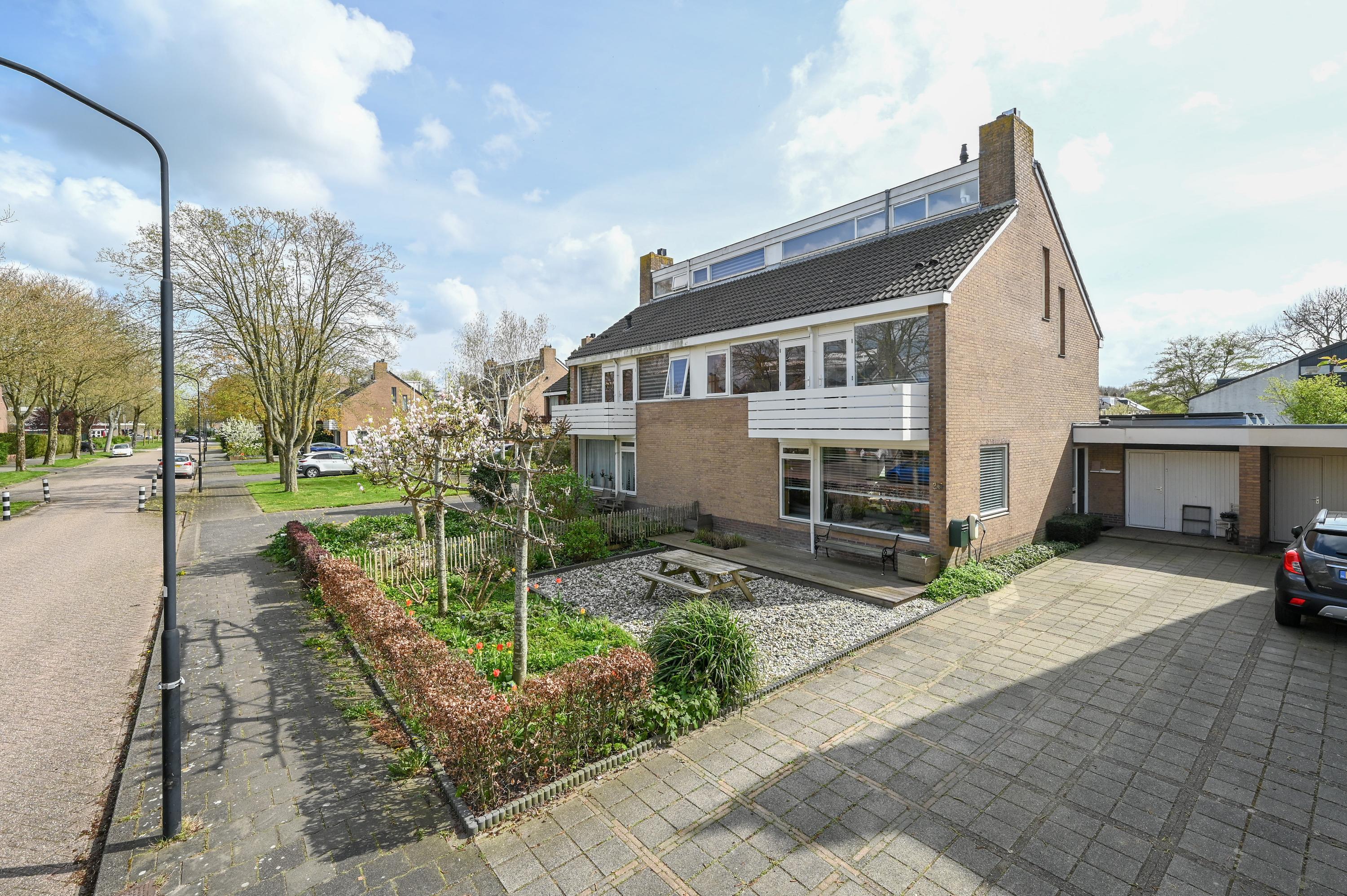 The garage is practically laid out and divided into two sections: at the front, there is a convenient storage area with connections for a washing machine and dryer, while the rear is currently used as an atmospheric lounge area — a versatile extra living space. The house is also well-equipped: a spacious driveway with room for at least three cars, a charging point for an electric vehicle, and 14 solar panels contribute to comfortable and future-proof living. The generous 400 m² plot completes the picture and enhances the sense of space around the property.