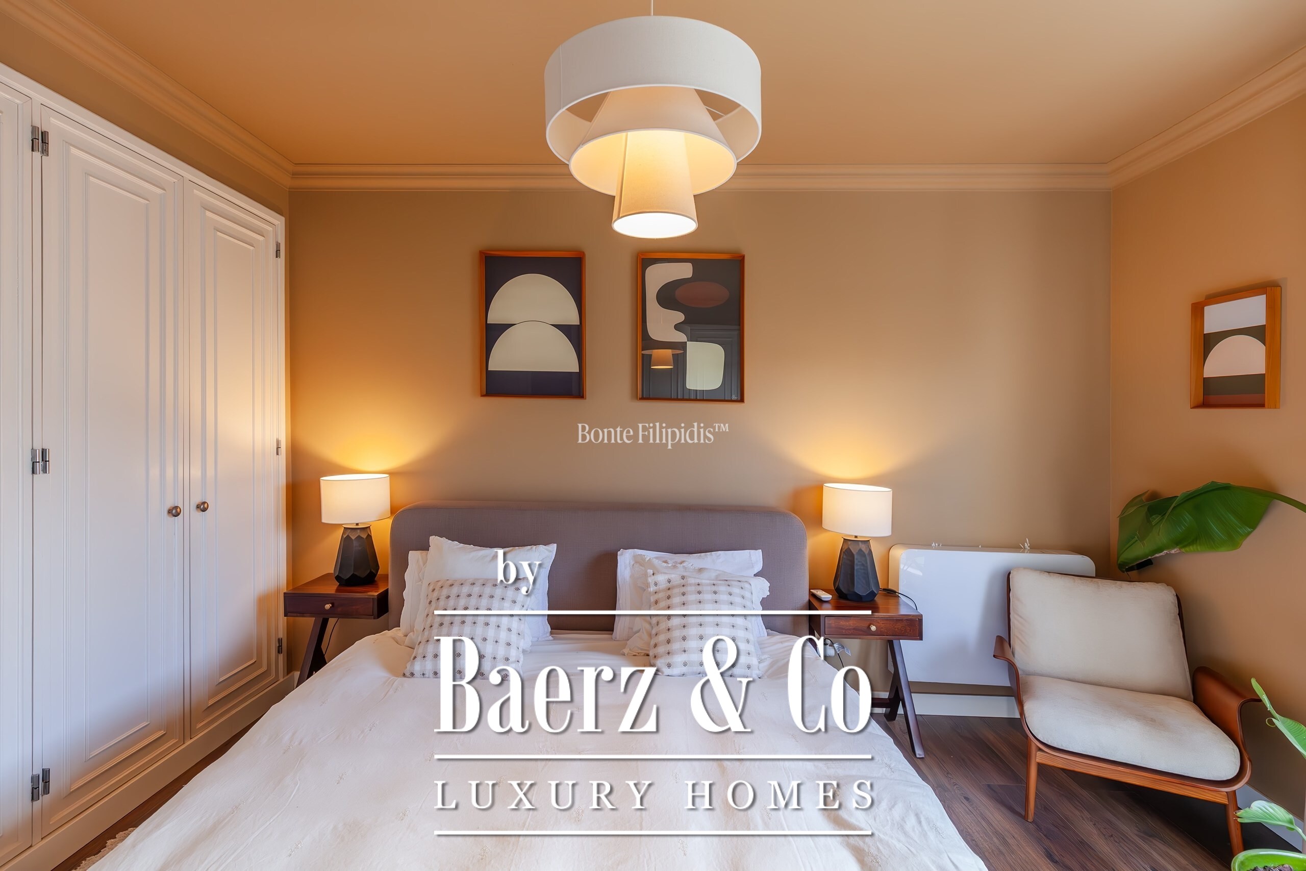 Wide windows in the living and dining room invite serene river views and lead to a spacious balcony, creating a seamless connection between interior and exterior space. A fireplace anchors the room, offering warmth and a gathering point during Lisbon’s cooler evenings. The kitchen is fully equipped with contemporary appliances and an integrated laundry, delivering both function and discretion.