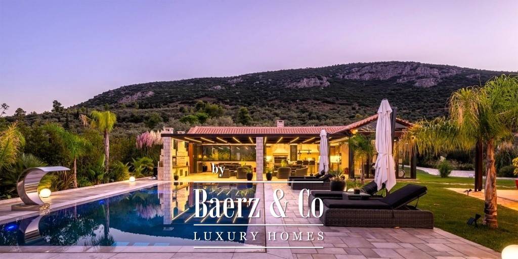 One of the magical elements in the design of a residence is the harmony between the large courtyards and the interior layout, which the owners implemented with their vision of living in a sophisticated residence, the layout of which will combine the older glamour with a modern aesthetic approach. The residence is built on an area of 14 acres on a hill with panoramic views, offering the necessary privacy. The total building square meters is 471 and is distributed in 4 different buildings. It has been completely renovated in 2020. The main residence is located in the most ideal point of the area, extends over 2 levels, has a separate kitchen area, high-ceilinged living room with oak ceiling, 3 very large master bedrooms, one of which has a fireplace and one with its own dressing room. On the lower level of the house there is a second living room, a space with a shaped jacuzzi and utility rooms and even the Laundry room with the oil boiler. In a close area with the house, luxury is combined with relaxation since there is a 60 sq.m. swimming pool with a beautiful view and a covered area of 88 sq.m., which is converted into a winter home