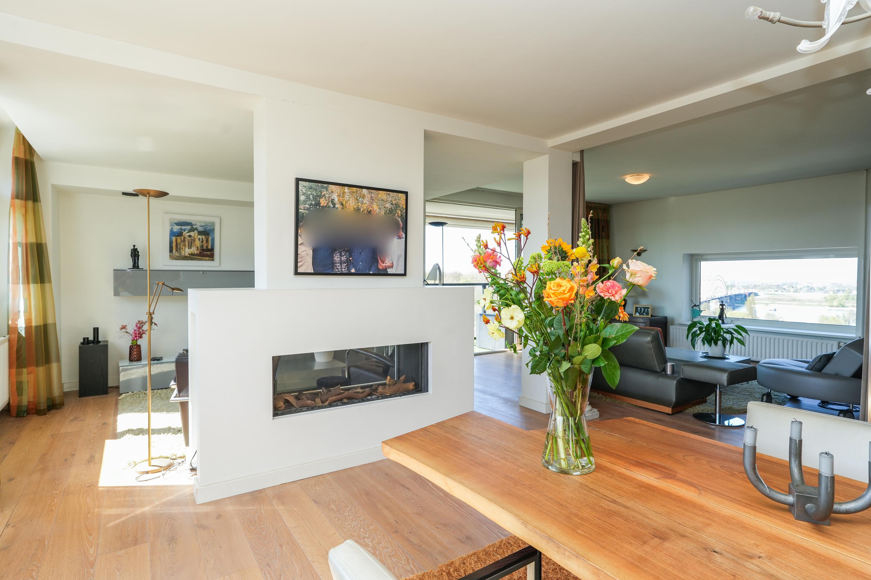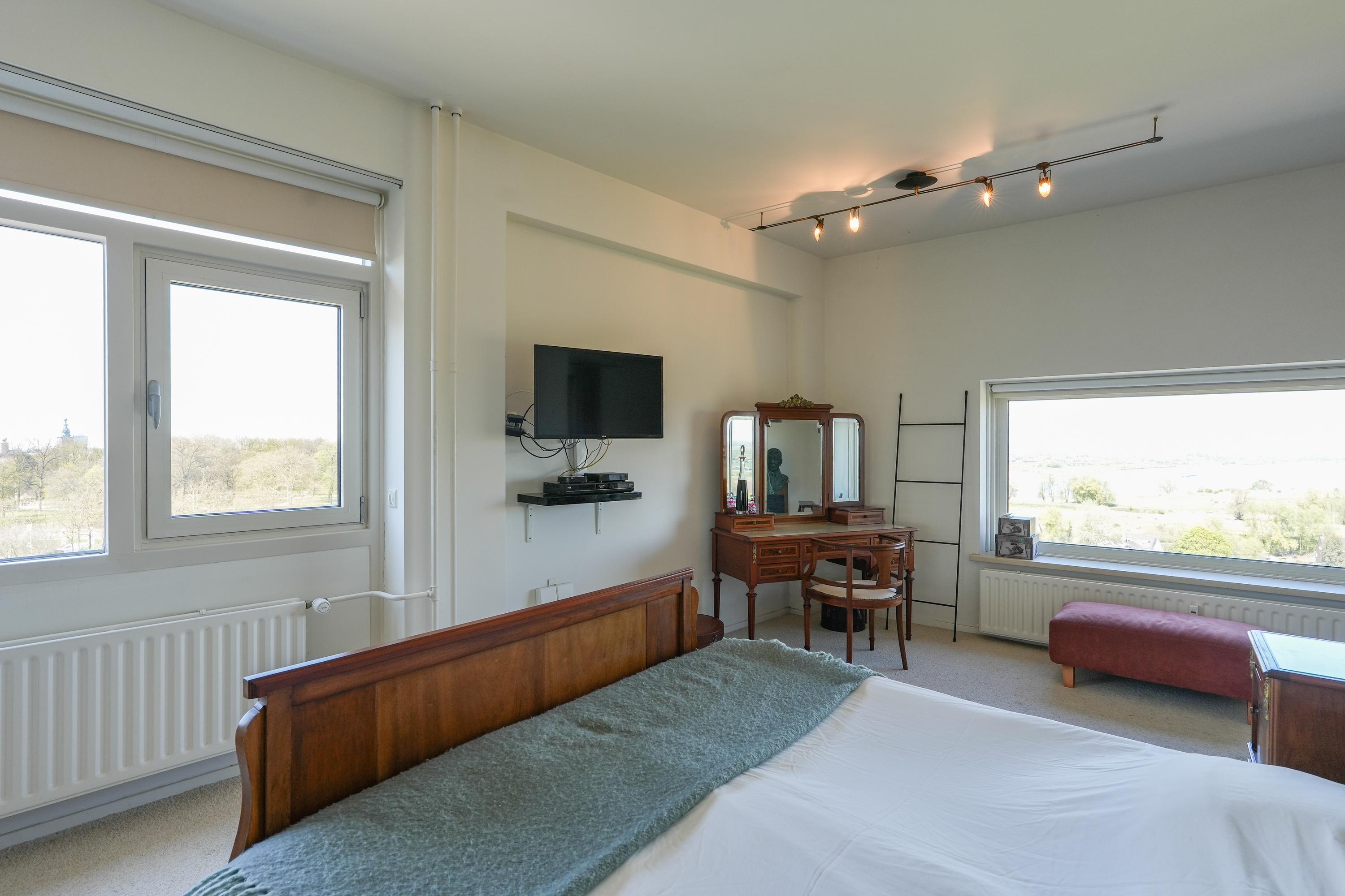 The apartment was created in 2009 by combining two separate units (numbers 44 and 46), resulting in an exceptionally spacious and well-organised home with a clear separation between the living area (44) and the sleeping wing (46). During this process, the apartment was fully and high-quality renovated. A solid oak floor in the living room and hallway, combined with clean finishes and abundant natural light, creates a warm and luxurious atmosphere. Large windows on all sides provide impressive sightlines and panoramic views over the Waal Bridge, the Ooijpolder and the city. Privacy, comfort and refined finishes come together here in a truly unique living experience.