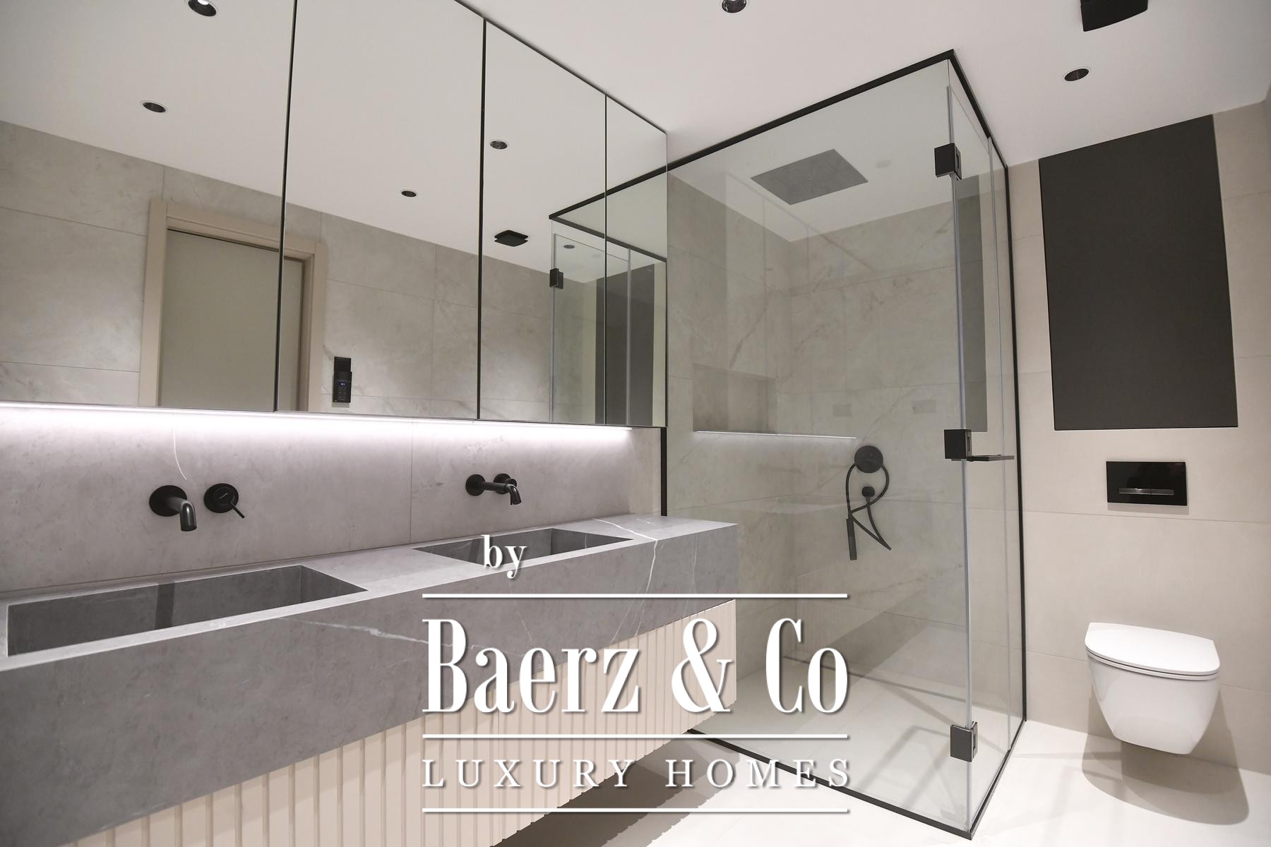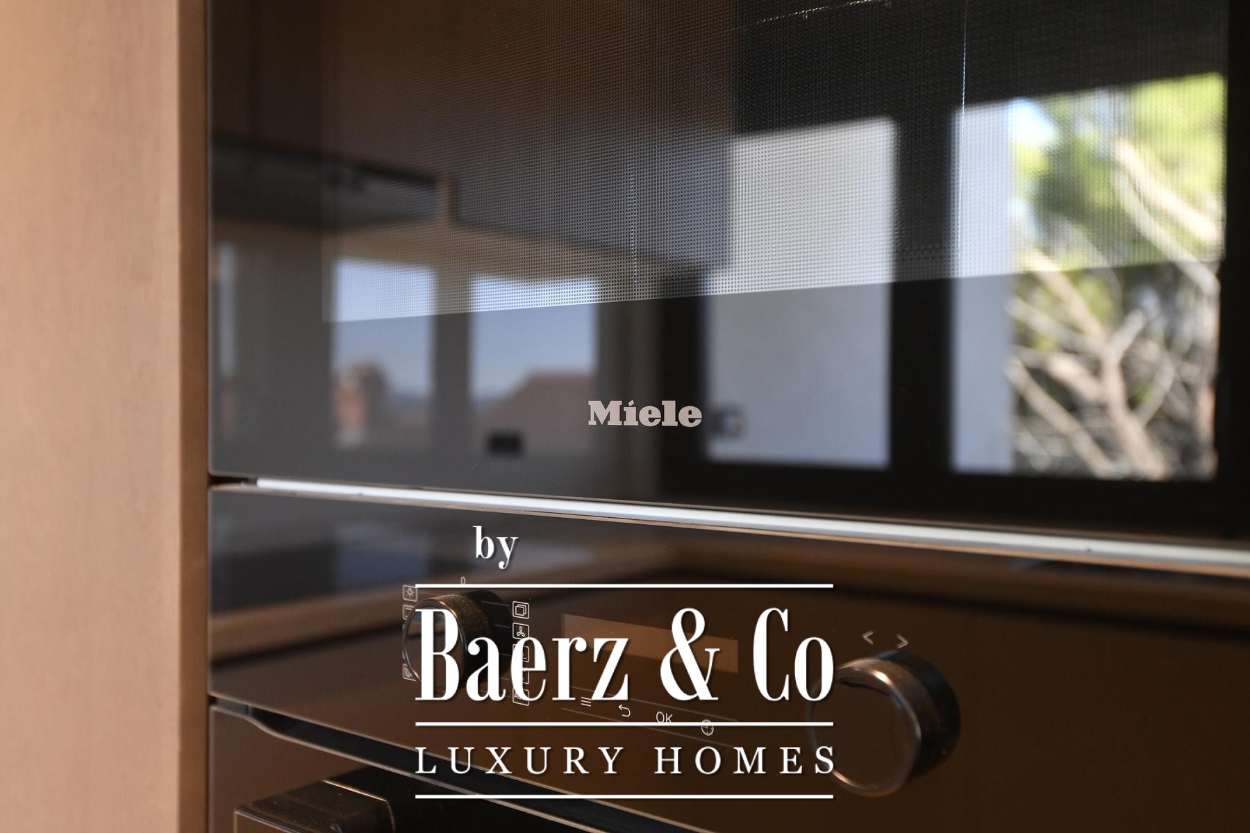 Each of the three bedrooms privileges privacy and sea views, with the master suite offering an en-suite bathroom and tailored wardrobes. Bathrooms feature Hansgrohe fixtures, walk-in showers, underfloor heating and precise finishes that recall a private spa. Practical living is ensured by a dedicated laundry room, storage space and an additional guest toilet.