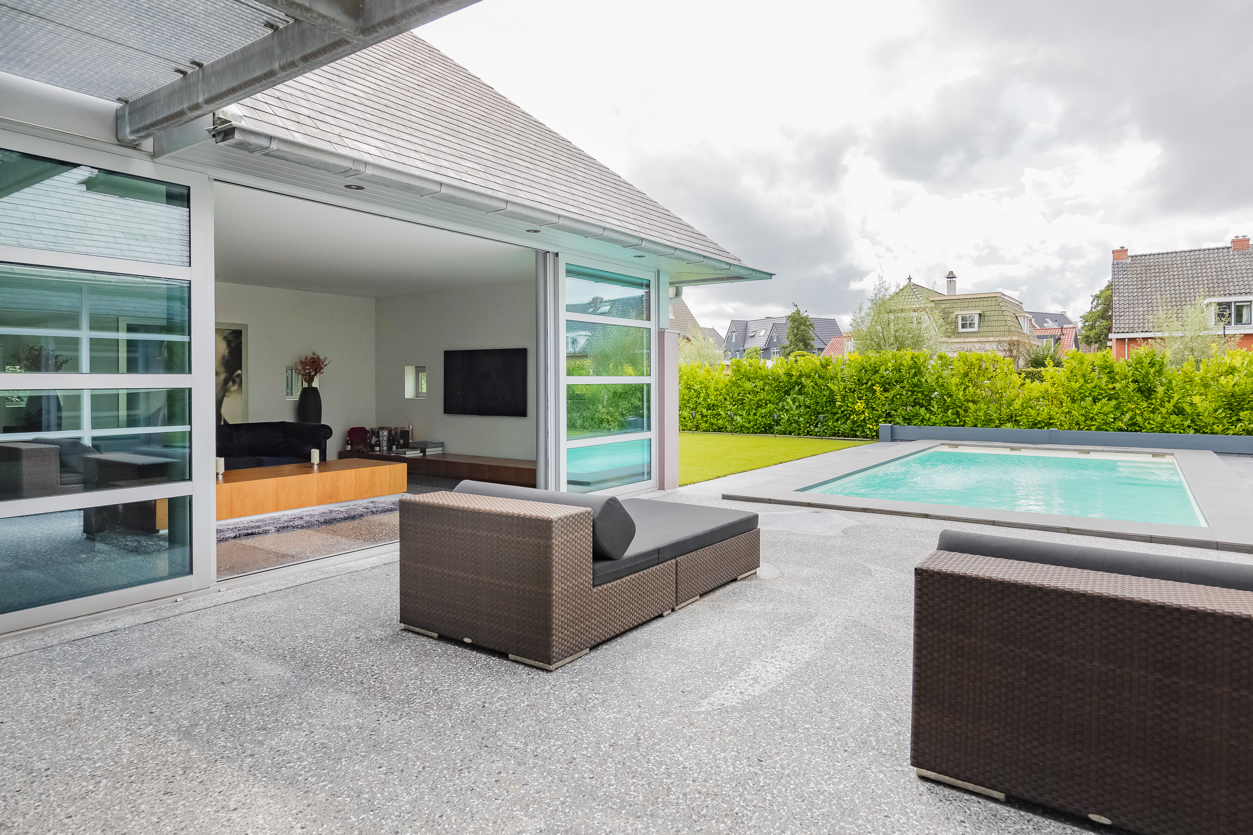 The entire ground floor has a terrazzo floor with underfloor heating. To enhance the indoor/outdoor experience, large sliding doors give access to the garden and the terrazzo floor has been extended to the outside.