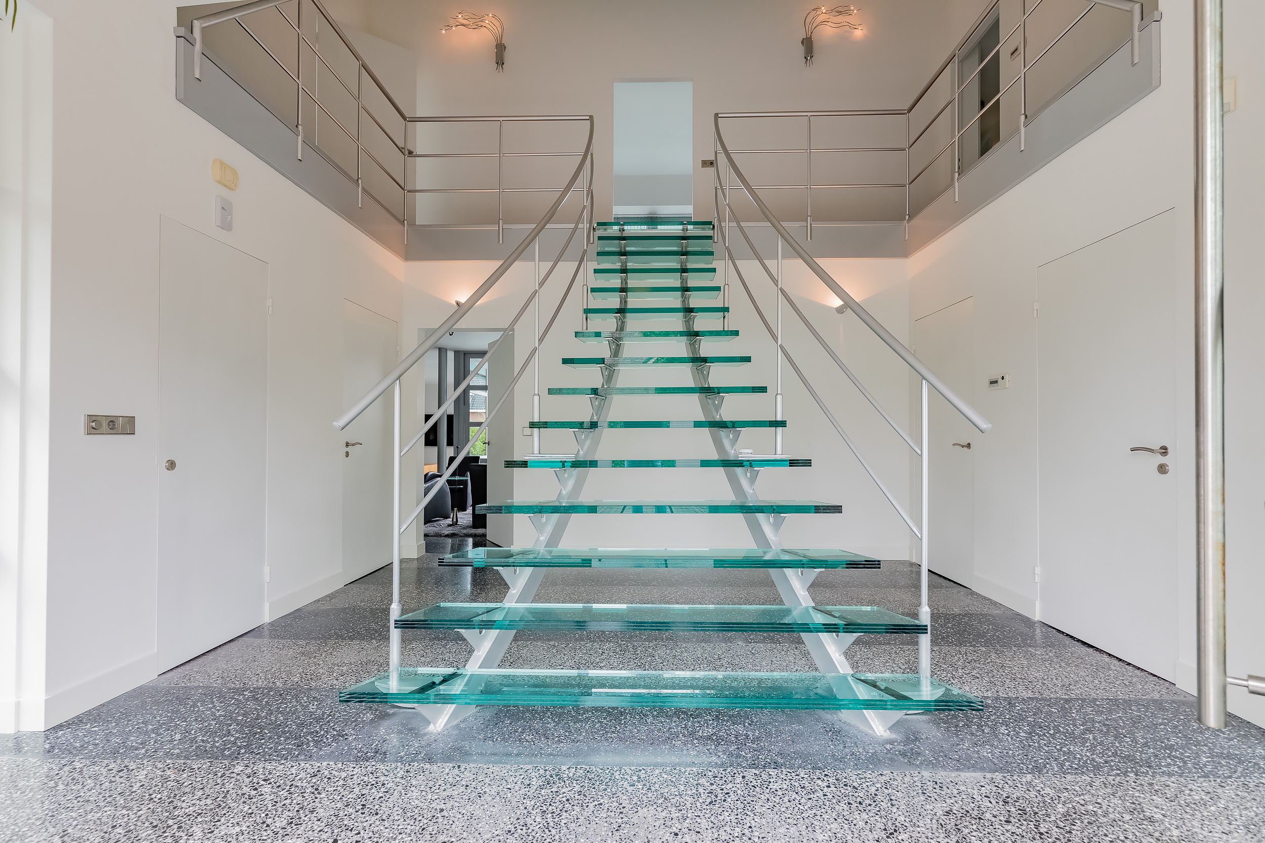 Large bright hall with loft and the impressive glass staircase to the top. The hall has tinted glass so there is no view from outside to the inside.