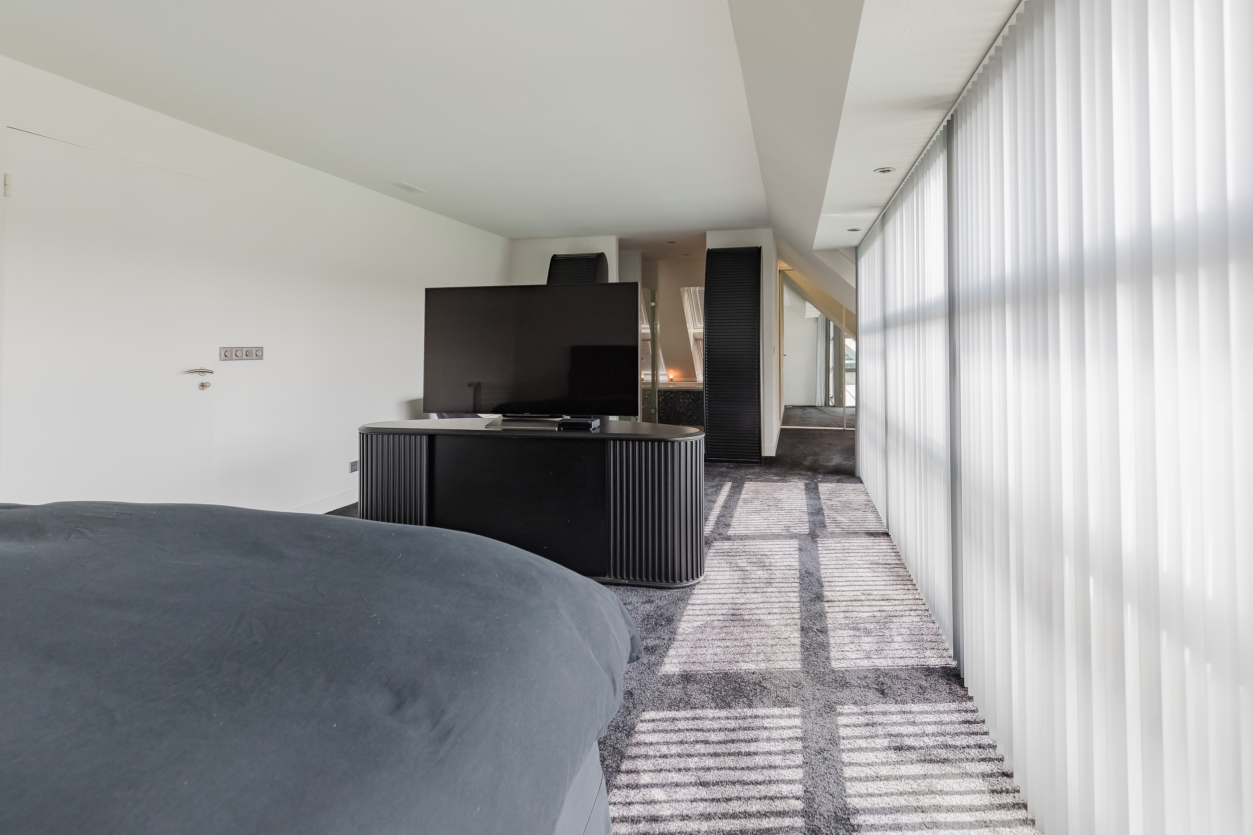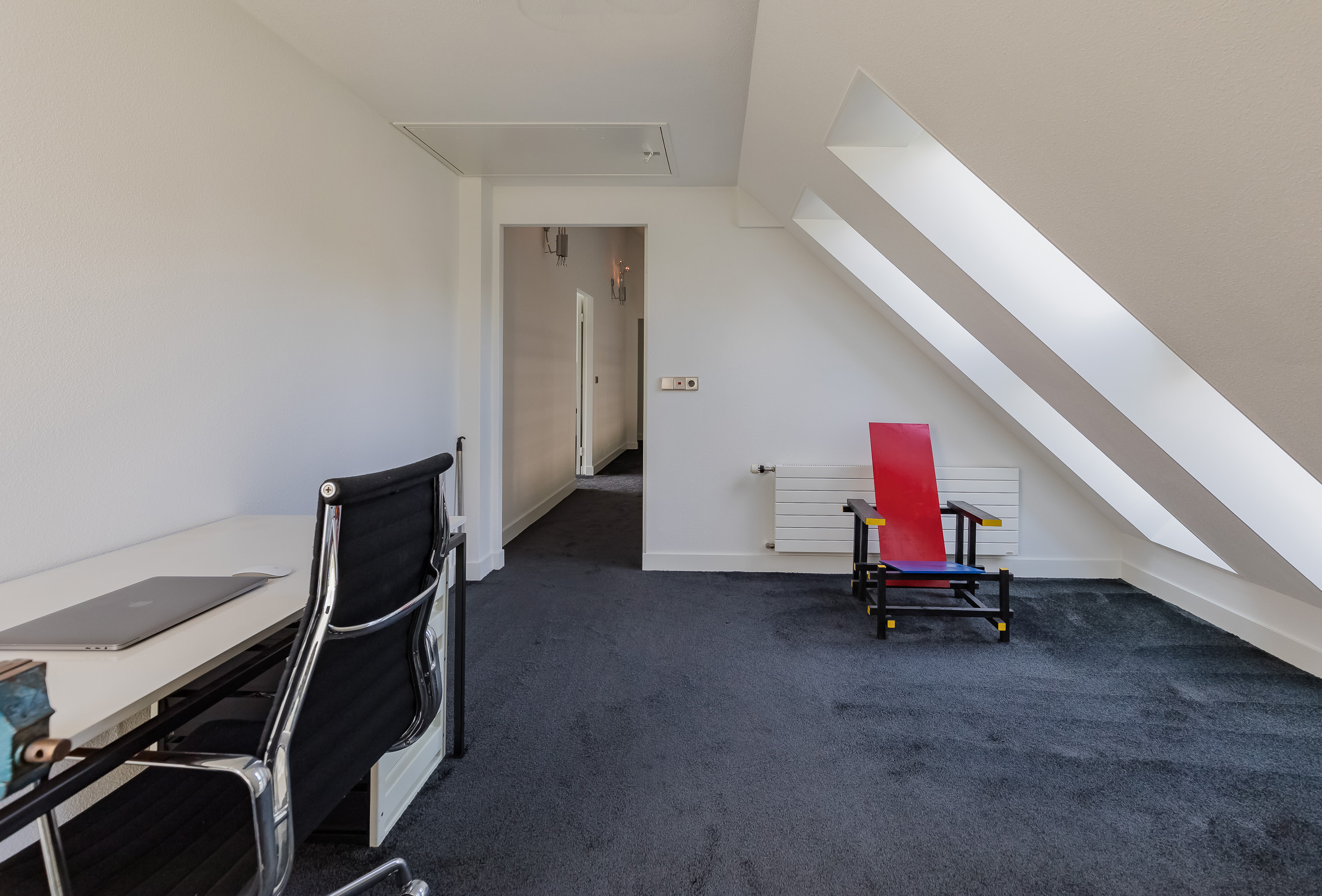 On this floor are 3 bedrooms, 2 bathrooms and a large storage room. The very generous master bedroom has its own luxurious bathroom and a spacious dressing room. The balcony can only be accessed from this room. 20 Skylights provide extra light and also here the symmetry is continued.