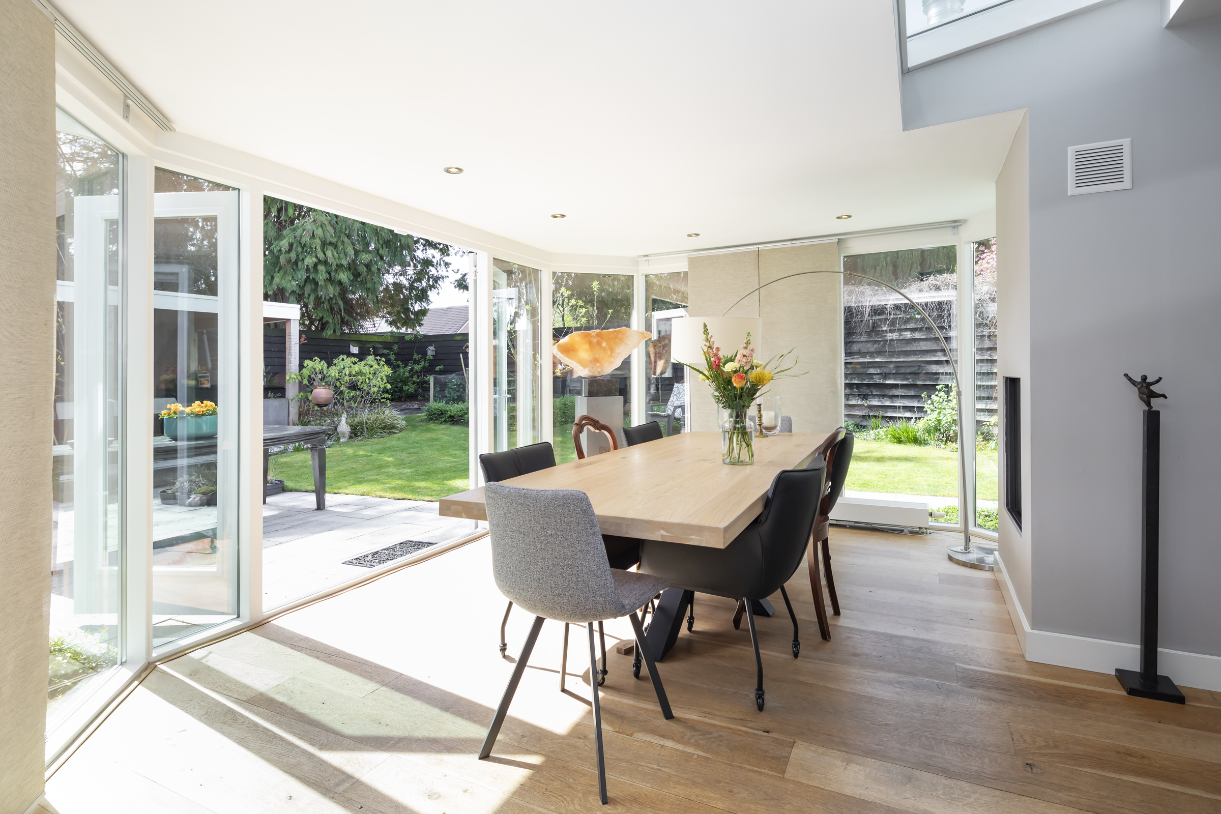 Renovated in 2021, the ground floor flows from a light filled living room with a glass front and garden views, into a spacious kitchen with a striking island, composite surfaces, and high quality appliances. Multiple garden doors open to the southwest facing landscaped garden, framed by an inviting veranda for year round enjoyment. A separate ground floor wing features a bedroom and bathroom suite with direct garden connection, while upstairs, three further bedrooms and a second bathroom enhance flexibility.