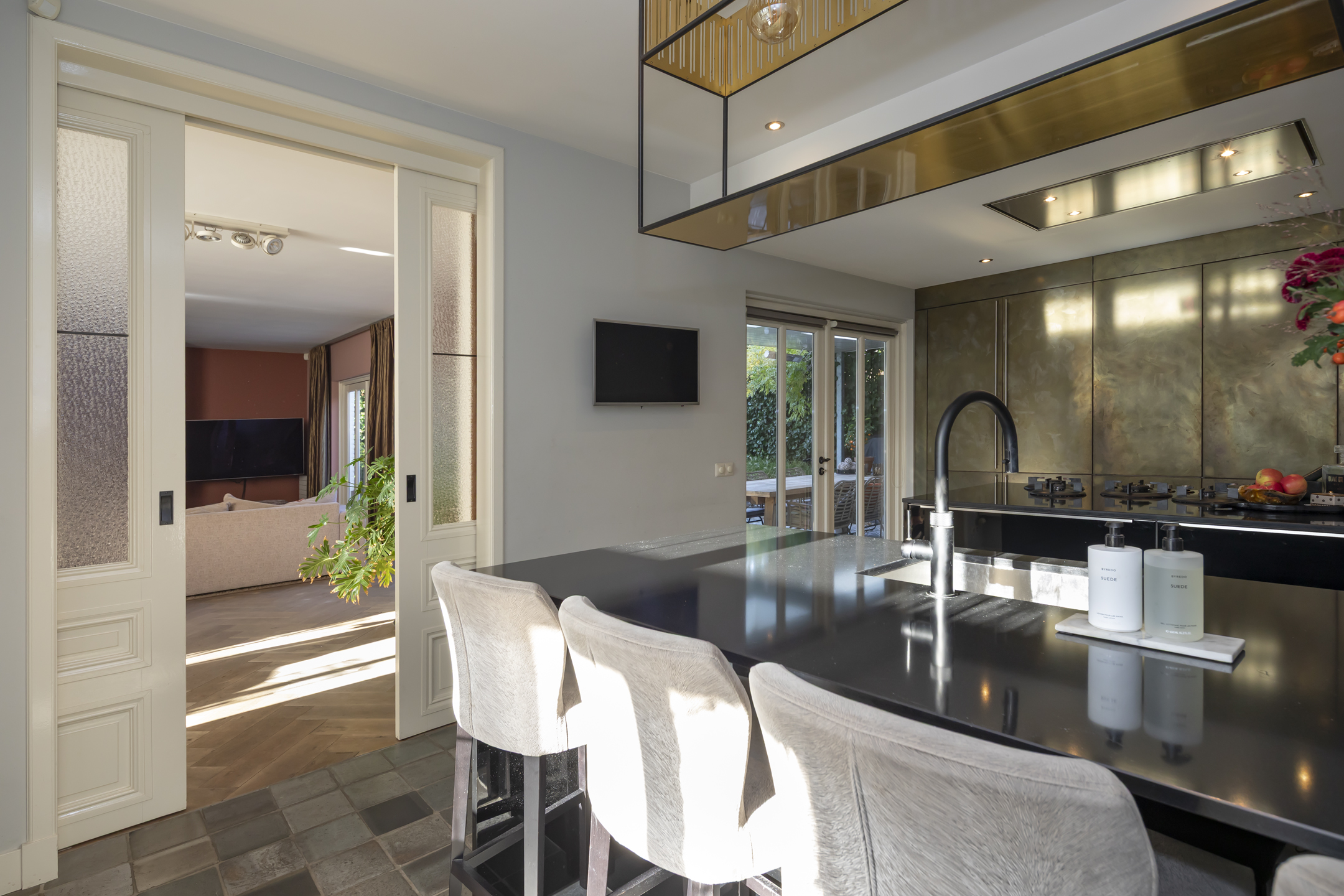 The residence showcases a refined entrance hall with high ceilings, authentic details, and a vibrant floor, setting a tone of understated luxury. The living room is defined by a rich ambiance and a classic fireplace, seamlessly connecting via French doors to a sheltered patio garden. Light flows through beautiful stained-glass en suite doors into the elegant dining room, while an additional multifunctional room offers flexibility for work or play, each with garden access. The contemporary kitchen is equipped with premium appliances, creating a space ideal for both culinary pursuits and informal gathering.