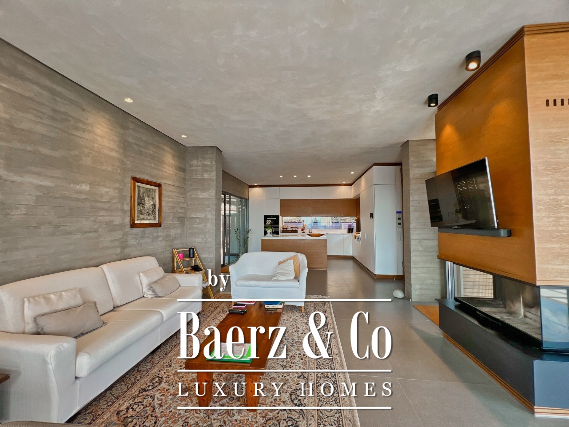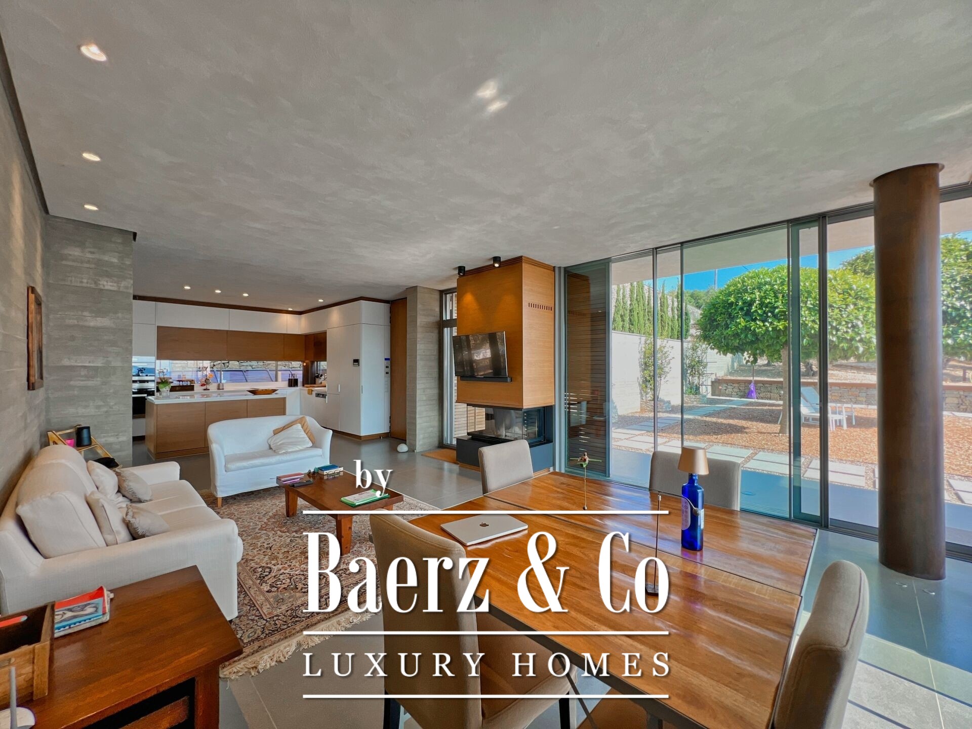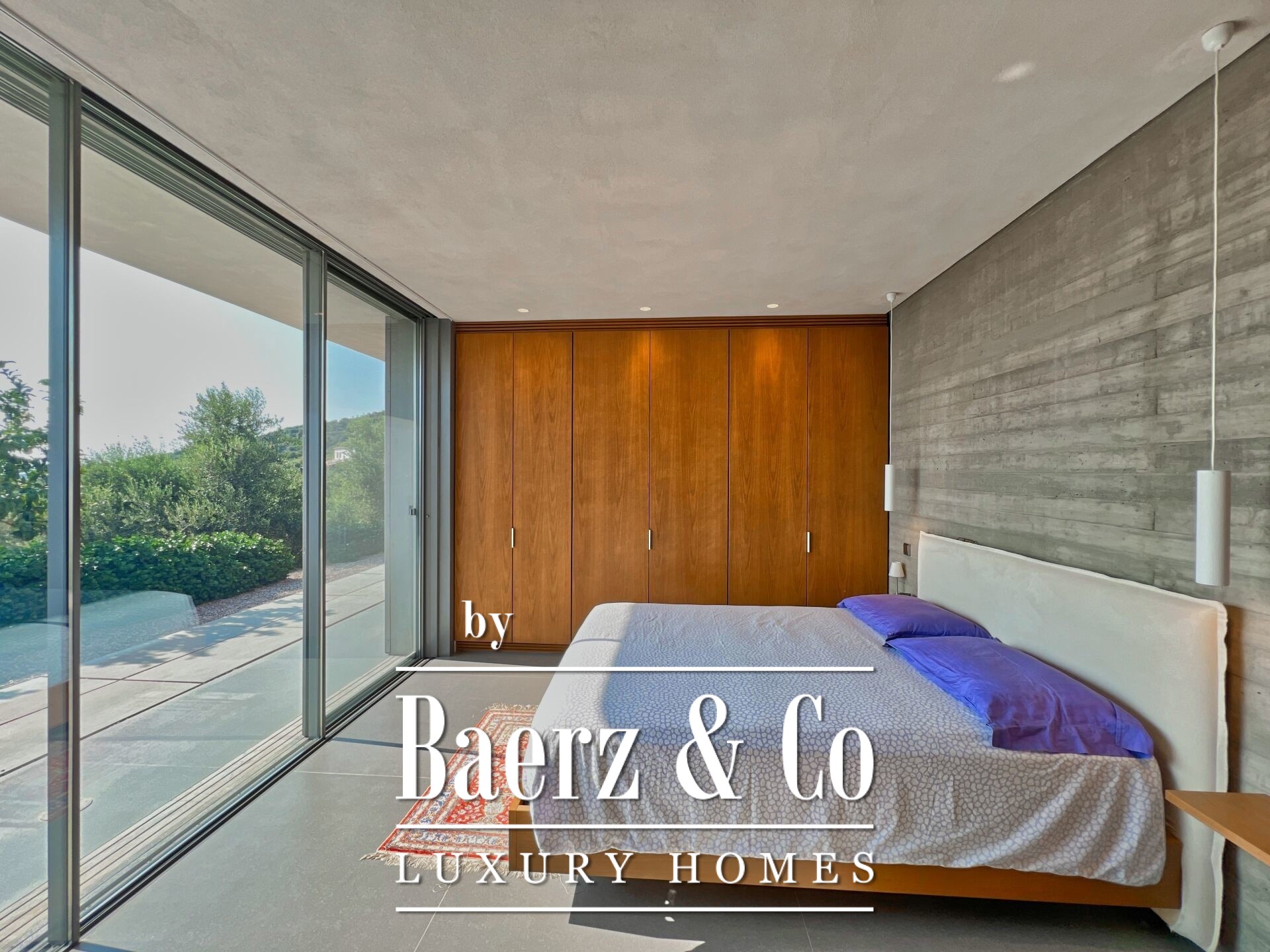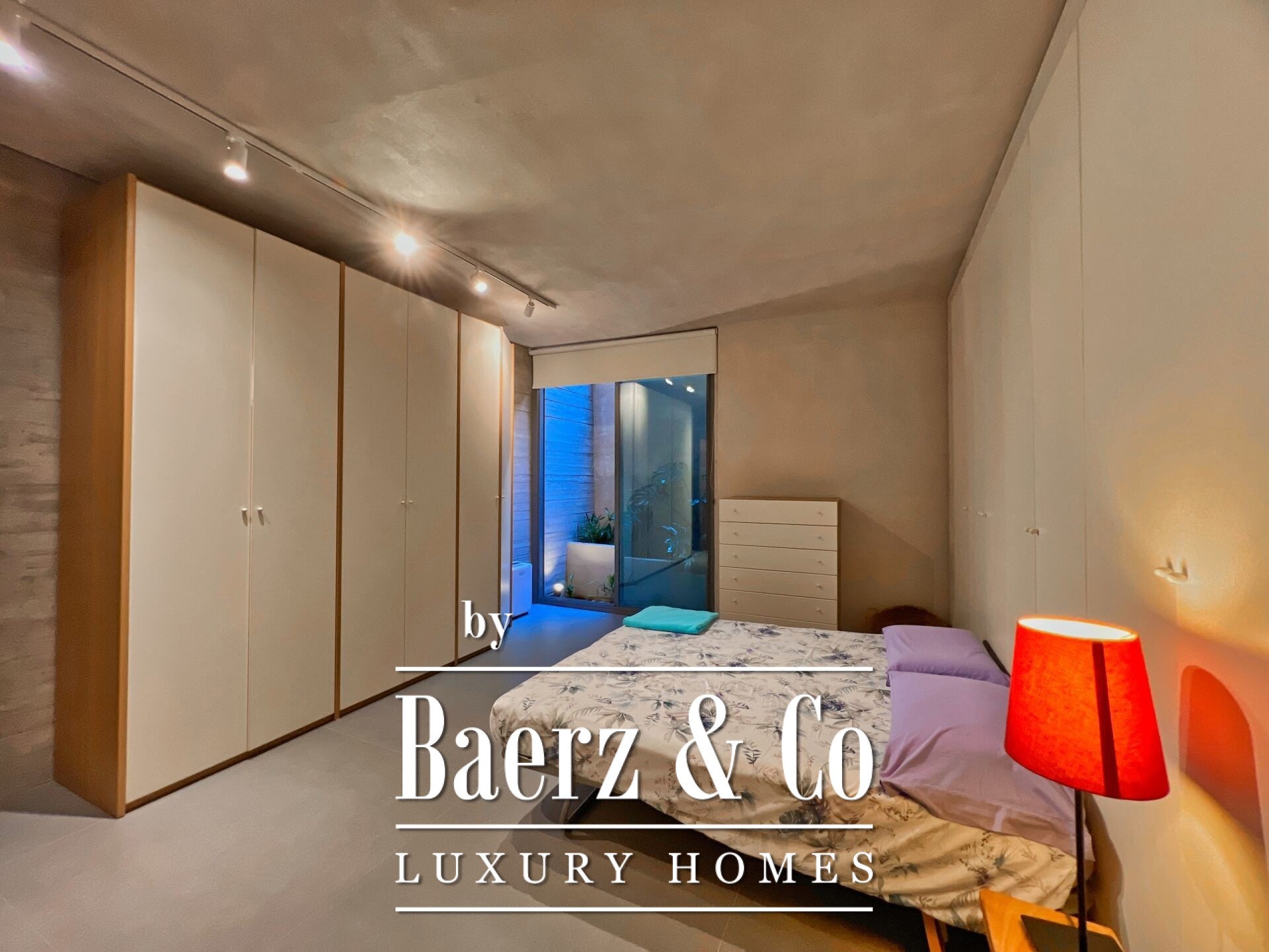 The residence unfolds over three levels and includes three bedrooms, offering both comfort and functionality. Two of the bedrooms are located on the ground floor, with direct access to the garden and pool, while the third, on the lower level, benefits from a smartly designed atrium that floods the space with natural light and creates a sense of absolute tranquility. The meticulous attention to detail is evident in every corner of the villa — from custom lighting fixtures to refined material finishes — resulting in a space that exudes timeless elegance.