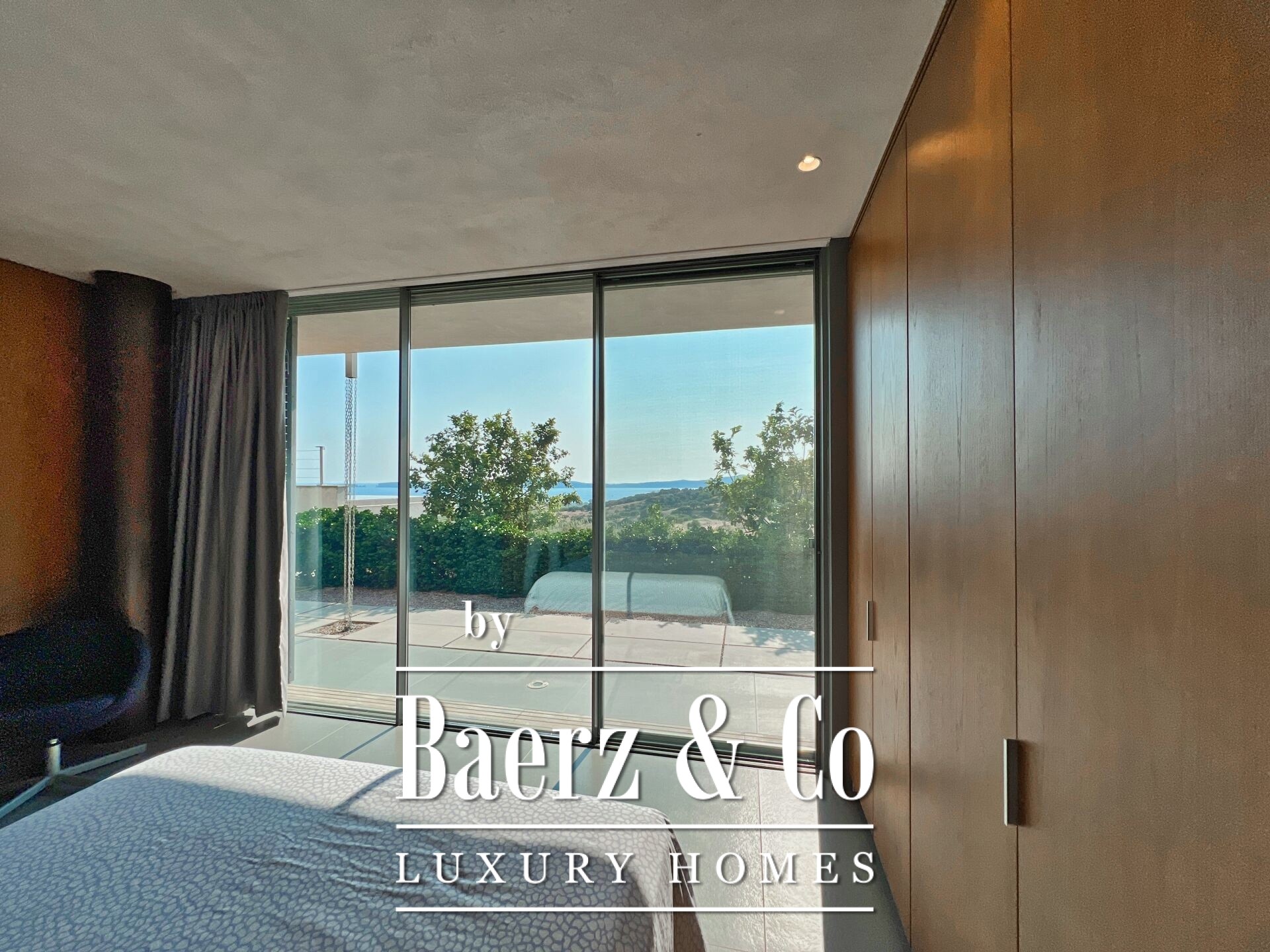 The interior layout is highly adaptable, with large retractable glass panels that transform the main living areas into an open courtyard-like space, ideal for year-round enjoyment. The view of the bay, the Gialova lagoon, and the Pylos coastline dominates every part of the property, creating a constant dialogue between the home and its surroundings.