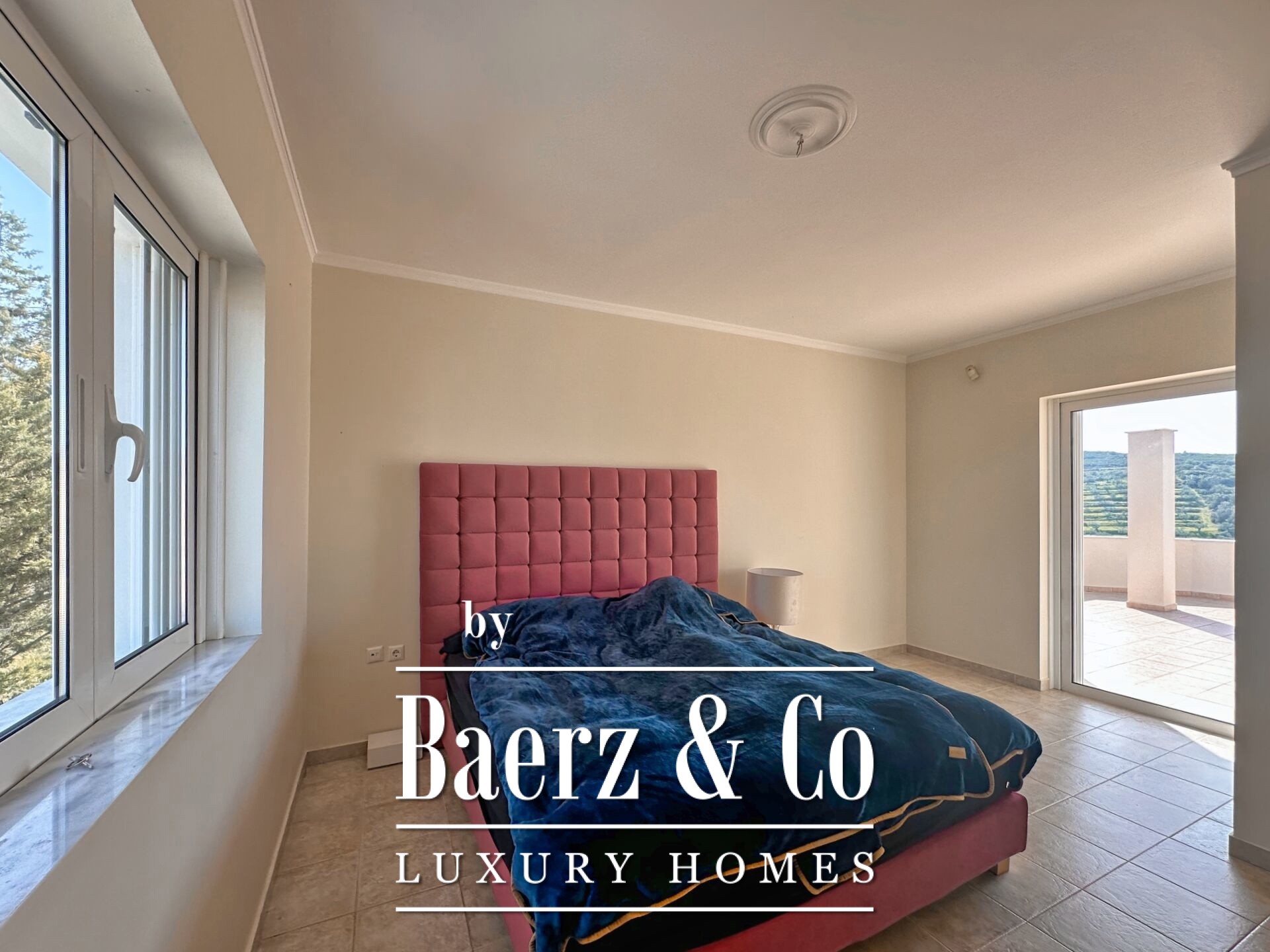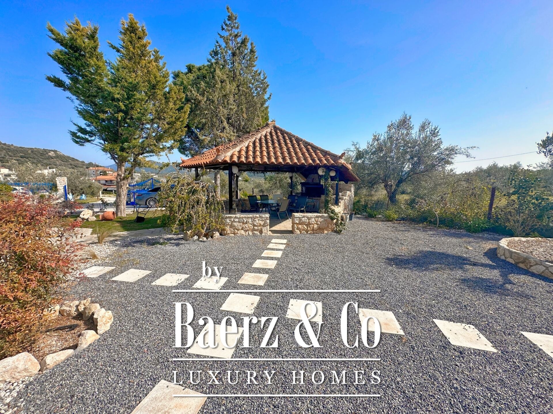Heating is provided by an autonomous oil system with radiators, enhanced by a fireplace, air conditioning, a boiler, and a jacuzzi. Outdoors, approximately 1,600 m² of beautifully landscaped garden, with 30 olive trees and dedicated relaxation areas, form an inviting context. A BBQ area and 30 m² of balconies with panoramic, unobstructed views further emphasize the openness of this detached house Pyrgiotika Nafplio.