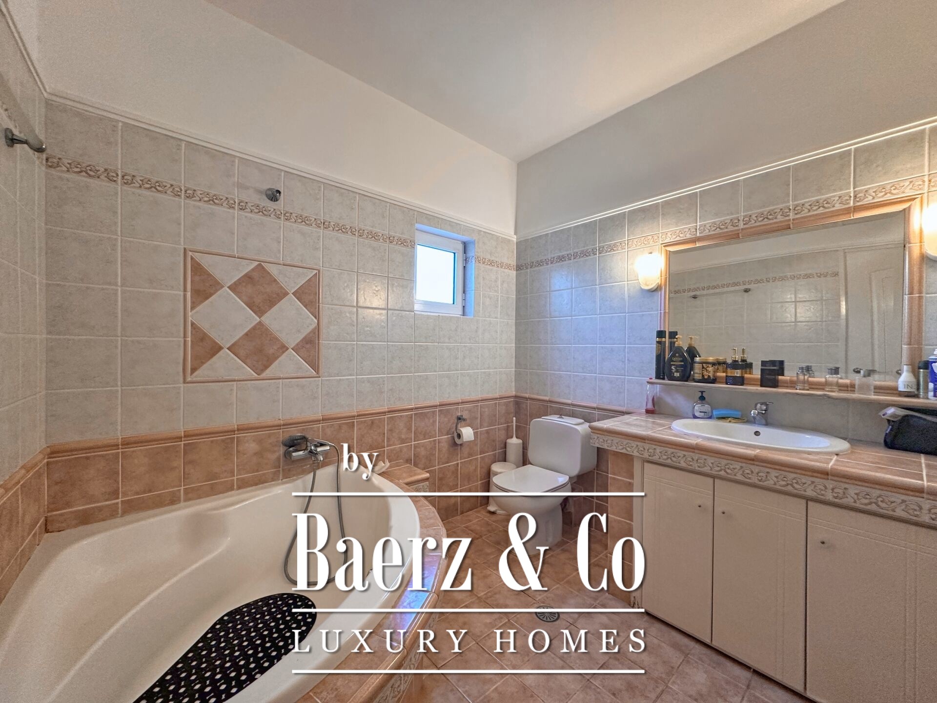 Arranged over two levels, the house features spacious and luminous living areas, reflecting a considered layout. There are four bedrooms and two bathrooms, complemented by two living rooms, a fully equipped kitchen, a playroom, dressing room, and a guest WC. Materials include quality tiling and aluminum window frames with double glazing and insect screens. Features extend to built-in wardrobes and a security door.