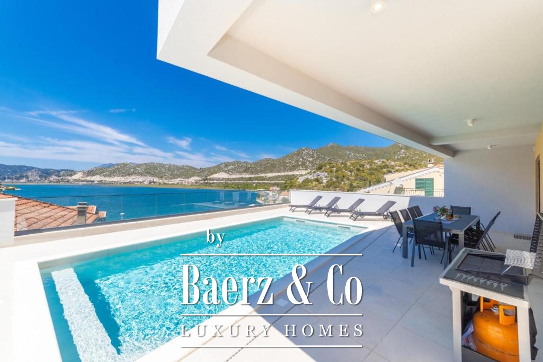 Ploče, Rogotin, modern urban villa with pool and sea view In a quiet part of Ploče, in the settlement of Rogotin, a luxurious urban villa with a total gross area of 311 m² is for sale, located on a spacious plot of land of 1,200 m². The property is modernly designed, with excellent facilities and a beautiful view of the sea and the bay. Basic information: The total area of the villa is 311 m² BRP, spread over three floors. There is also an outdoor parking lot on the property and a swimming pool that provides additional pleasure and privacy. Floor plan: The basement (60 m² of net usable area) consists of an entrance area, a machine room and an internal staircase. The ground floor (156 m² net usable area) includes