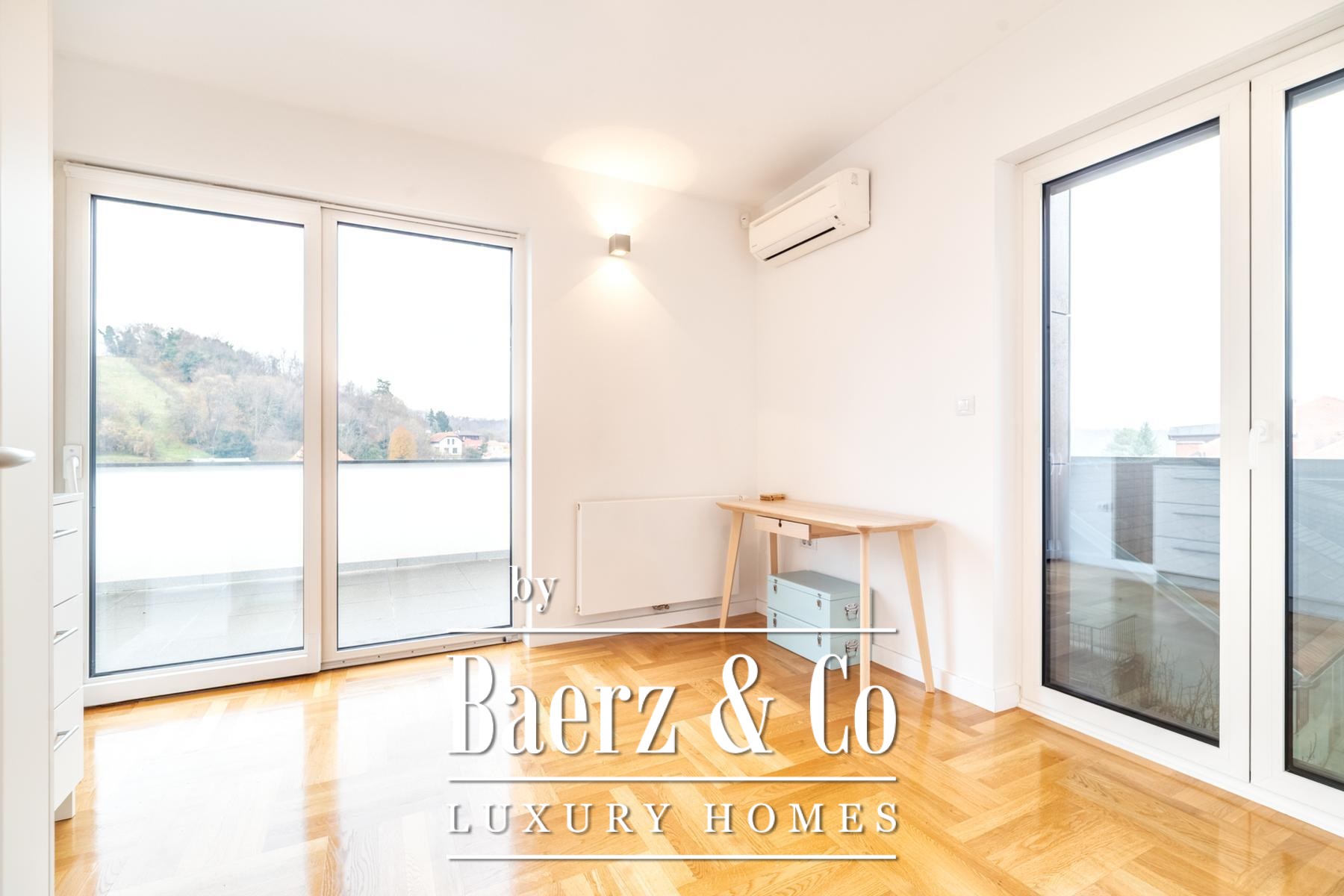 The ground floor introduces a garage for two cars, a laundry room, wine cellar, boiler room, and an indoor pool with a shower, setting a discreet tone of comfort and convenience. The upper ground floor features the main entrance, a fluid living and dining area, a kitchen with pantry, guest conveniences, and immediate access to a terrace and garden. One bedroom and bathroom complete this level. On the first floor, three bedrooms open to private terraces and balconies, complemented by two bathrooms. The uppermost floor offers two further bedrooms, a bathroom, and terraces with wide views of Medvednica and the eastern skyline.