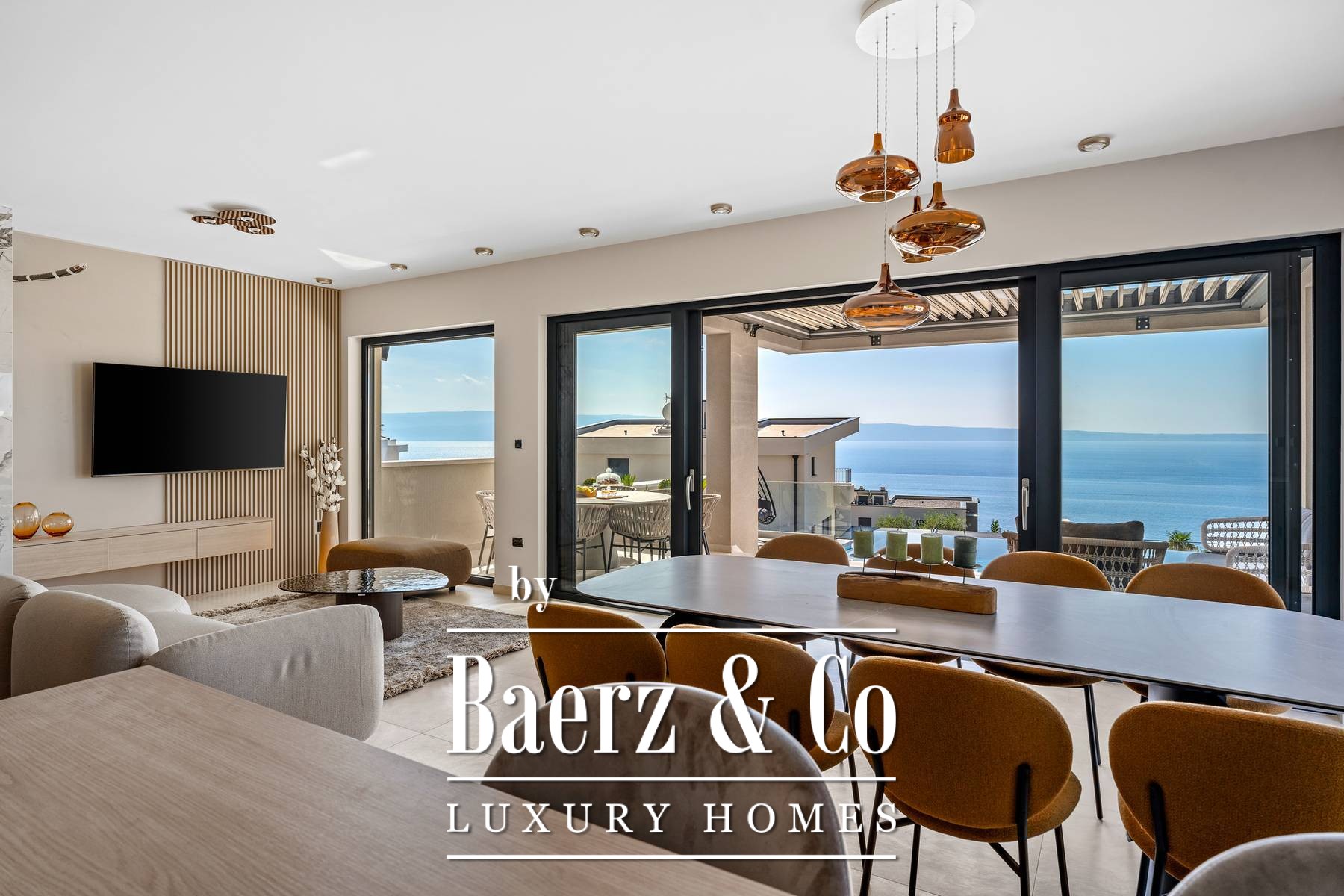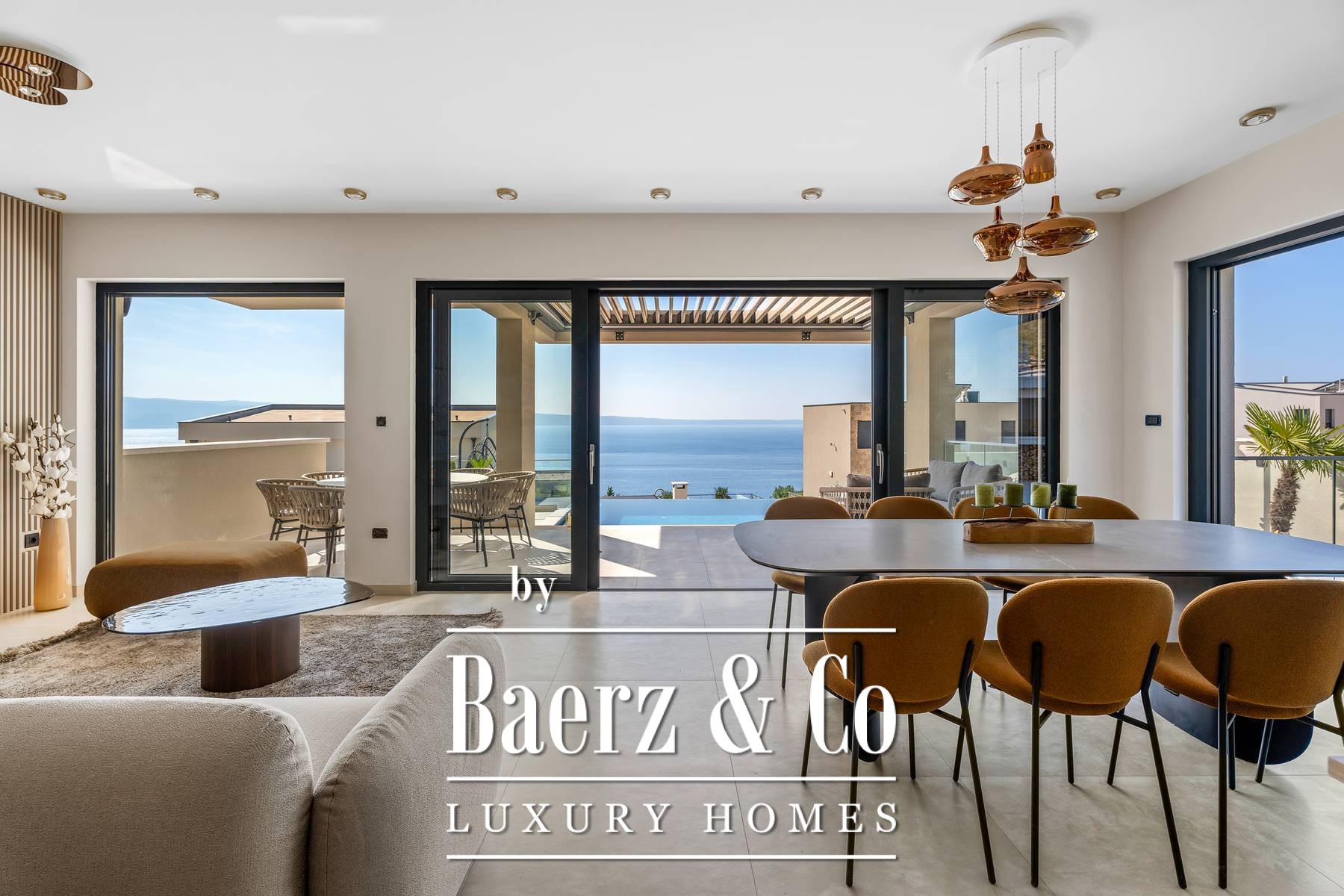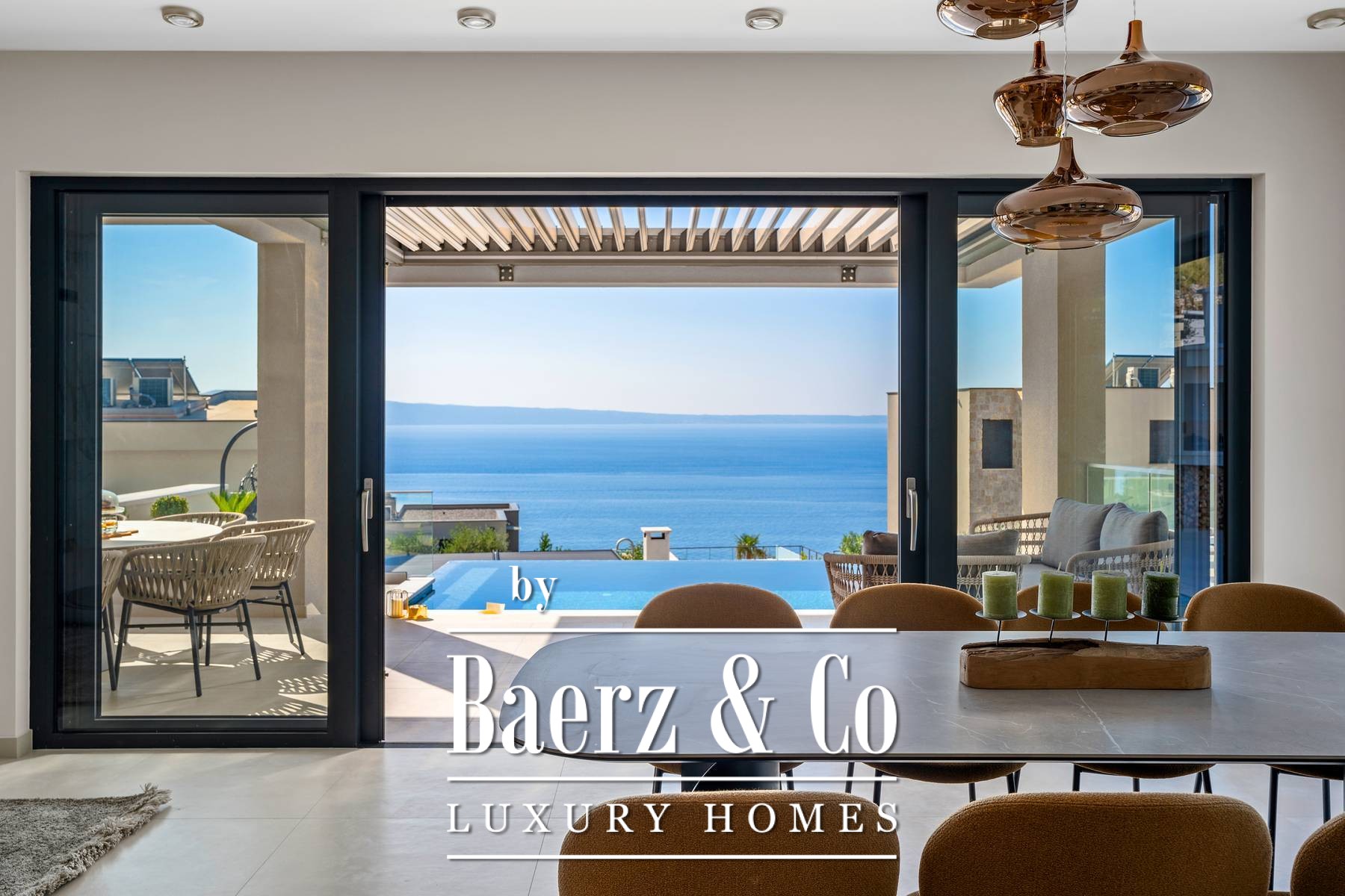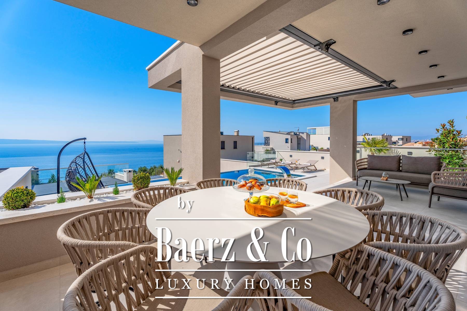 to the south with a beautiful panoramic view of the sea and the bay, on the middle floor there is also a third comfortable bedroom with a private bathroom and a spacious loggia to the east. with a view of the sea.All rooms and premises are air-conditioned with inverter air conditioners, underfloor heating has been installed in the entire building (including the basement part) and a central vacuum cleaner has been installed in all rooms.In front of the living room is a spacious terrace with a view of the sea, and in front of the house is a swimming pool with a sunbathing area.High energy efficiency is ensured by a 10 cm thick styrofoam facade on the outside and 6 cm stone wool on the inside, partition walls inside the building are Knauf panels and acoustic wool, which ensures excellent sound insulation.A solar system for hot water is located on the roof, the staircase inside the building is made of stone with integrated LED lighting and a glass railing that emphasizes elegance and luxury. Outdoor swimming pool measuring 32 m2, 1.6 m deep with heated water, heat pump system and water filtration by electrolysis.All shutters are anthracite aluminum shutters, three-layer glass, automated shutters, high-quality stone inside and outside the building, fence around the building, gutters in the facade,...The villa is located in a quiet location, ideal for anyone who wants peace and privacy in a beautiful and natural environment. A great atmosphere and a luxuriously equipped vacation home are the ideal combination for a pleasant vacation. The swimming pool, the common lounge for gatherings are excellent for relaxation and all this in the private atmosphere of the fenced plot - simply perfect.Podstrana is a tourist town 5 km from the capital of Dalmatia, Split, and 28 km from Split airport. Podstrana has all the facilities needed for a pleasant vacation, but also for everyday life: shops, restaurants, pharmacy, school, playground,... Sandy and pebble beaches stretch from Stobreč all the way to Omiš, which is connected by a promenade along the sea.New built house, fully furnished and equipped, ready to move into.For any additional information, I am at your disposal at the mentioned contacts.