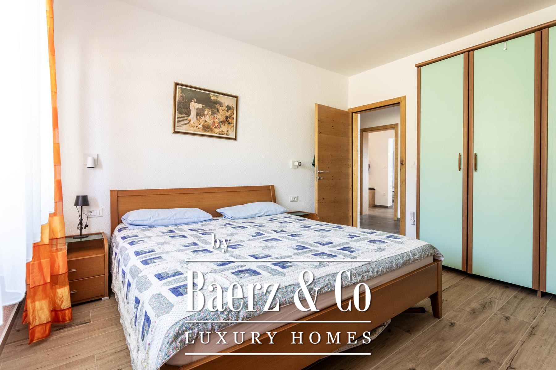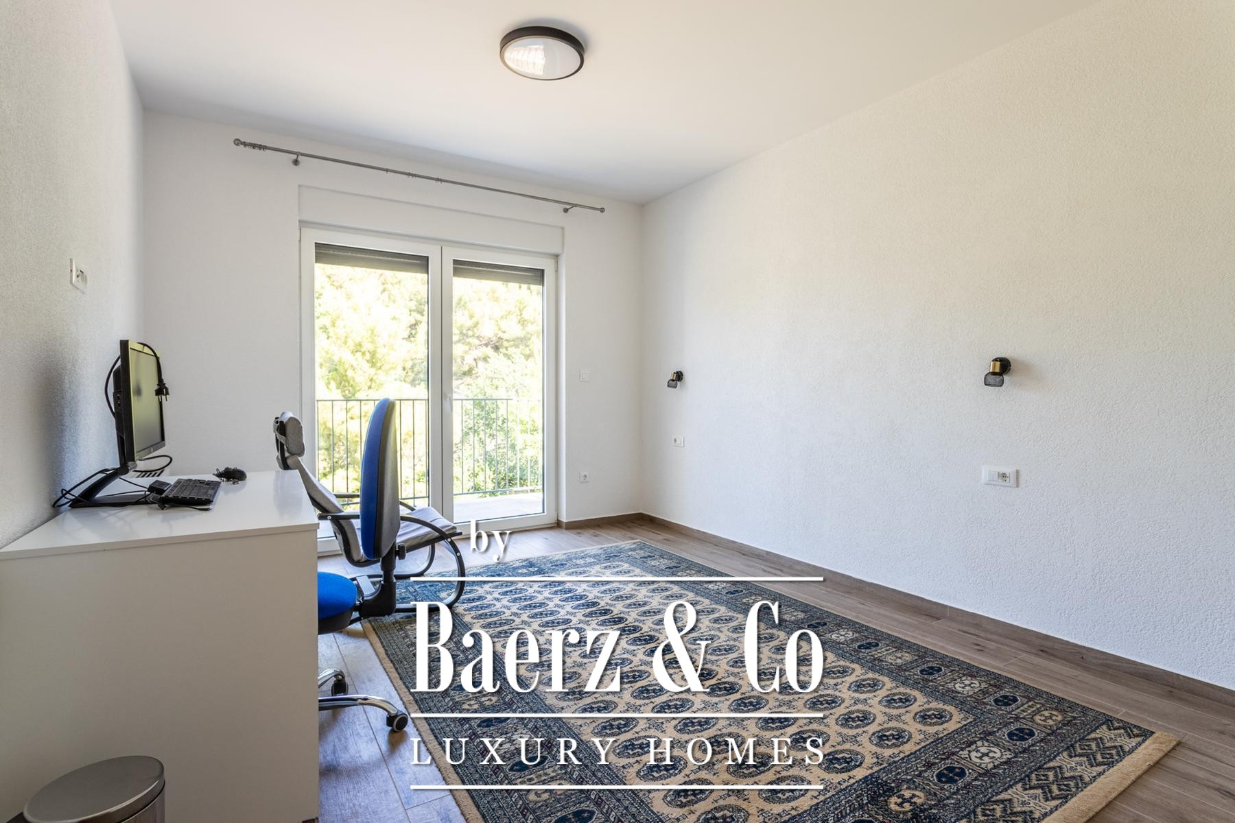 On the ground level, the main apartment stretches across 119 m², unfolding into a considered layout with two bedrooms, two bathrooms, a kitchen with pantry, and a living and dining area that extends to a covered terrace of 23 m². Upstairs, two separate one-bedroom apartments open to private balconies that capture unobstructed views of the Adriatic. An internal staircase links the levels, ensuring a harmonious flow between communal and private spaces.