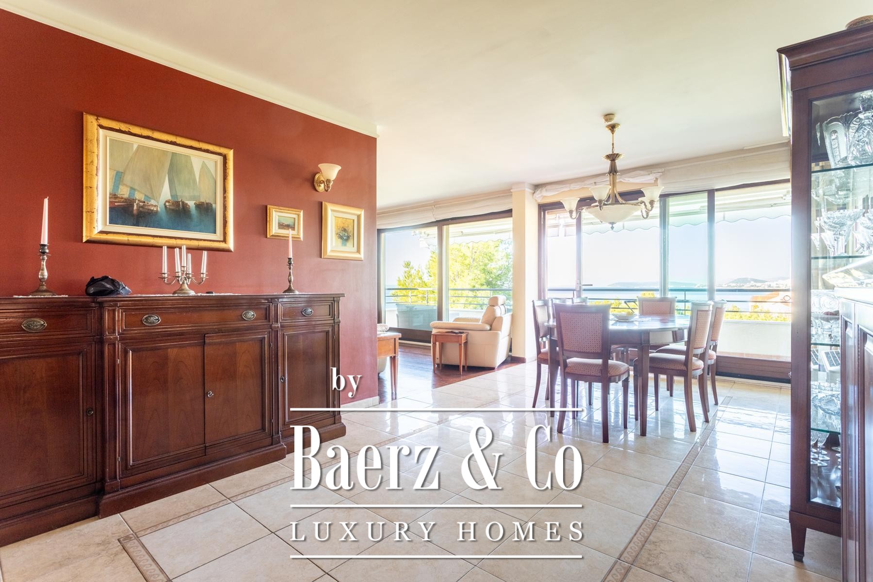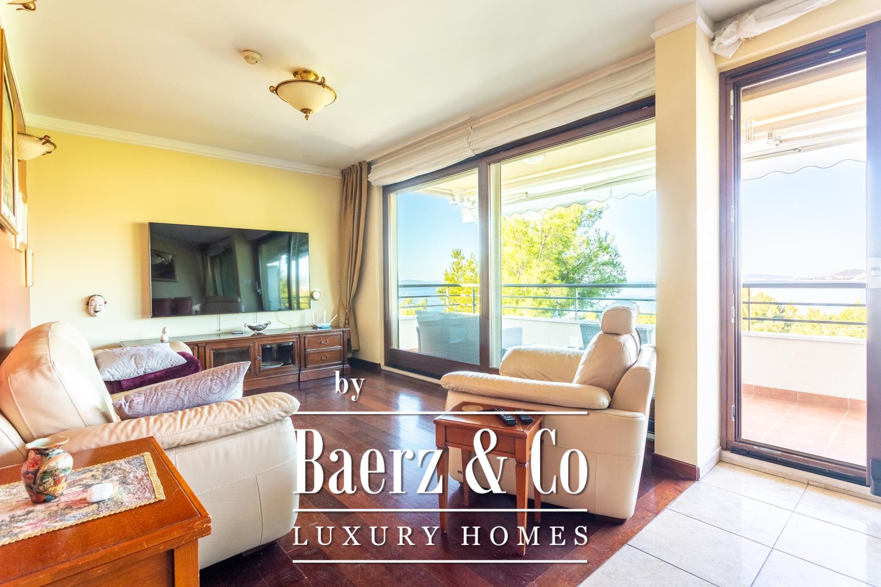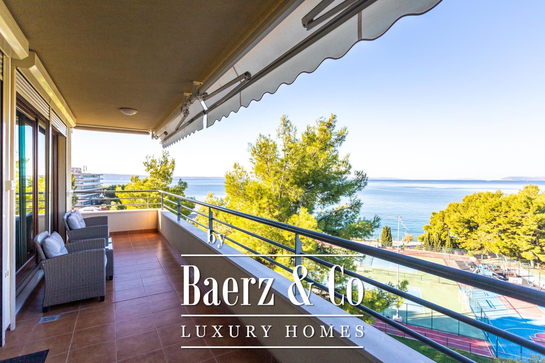 The experience extends outdoors onto two loggias, measuring 3.85 m² and 14.74 m². These terraces provide space for quiet mornings or evening gatherings, with the larger loggia offering a sheltered retreat above the sea.