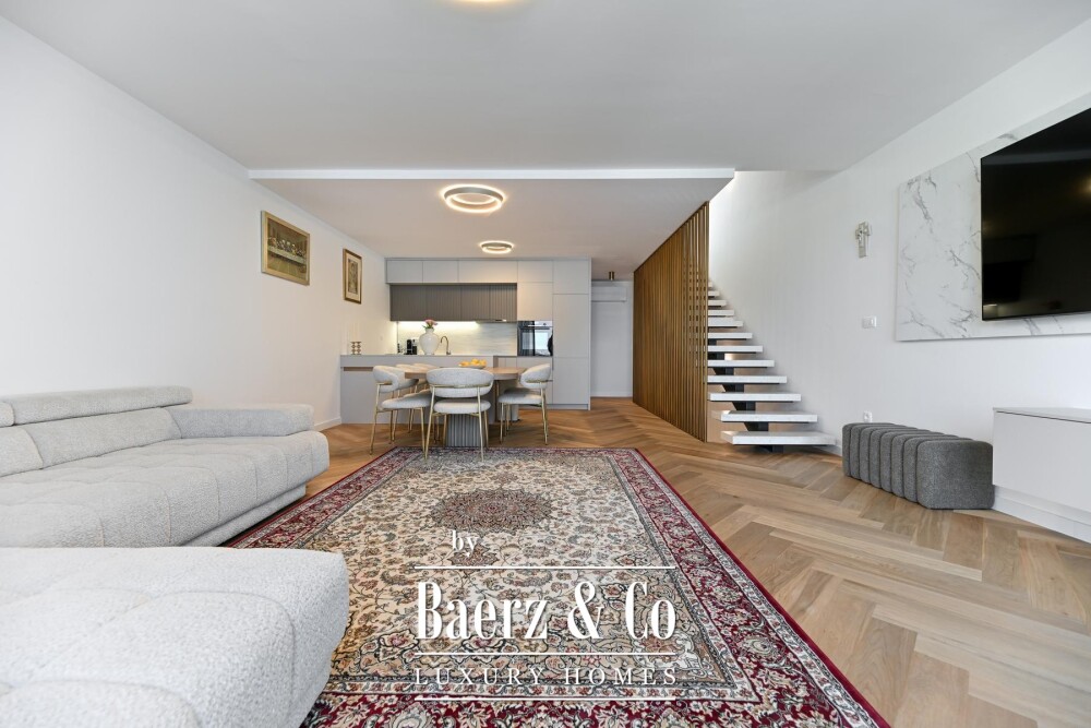 The top floor reveals a spacious, partially covered roof terrace with open sea panoramas. The ground floor extends to a terrace and garden space, ideal for a jacuzzi, sunbathing, or children’s activities, with several cascading gardens offering a sense of enclosure and privacy. The two bedroom apartment Podstrana enjoys a quiet microlocation, just minutes’ walk from the beach and a new promenade, providing access to the heart of the local community.