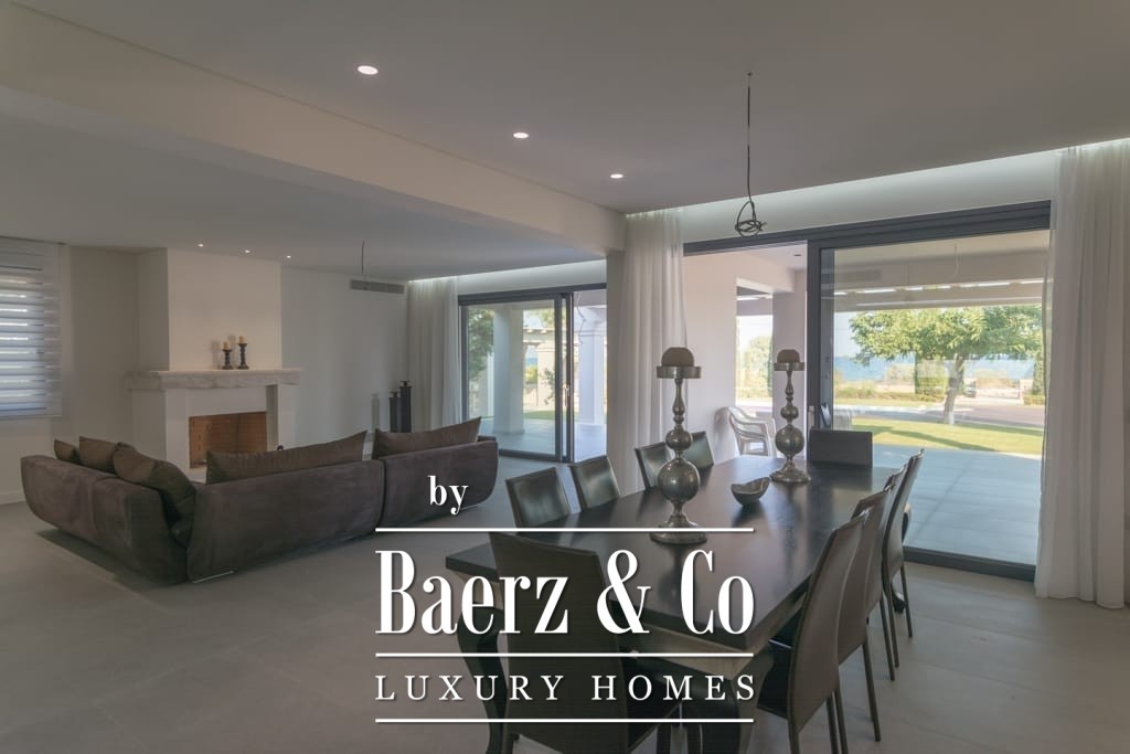 Throughout, interiors are shaped by understated luxury, merging timeless Mediterranean character with contemporary comfort. Striking wooden roof details and expansive aged marble floors create a tactile sense of elegance, while generous openings allow light to move freely across spacious reception areas. The living and dining areas flow out to broad terraces and wide balconies, perfectly framing panoramic sea views toward Spetses, Hydra, and the horizon beyond.