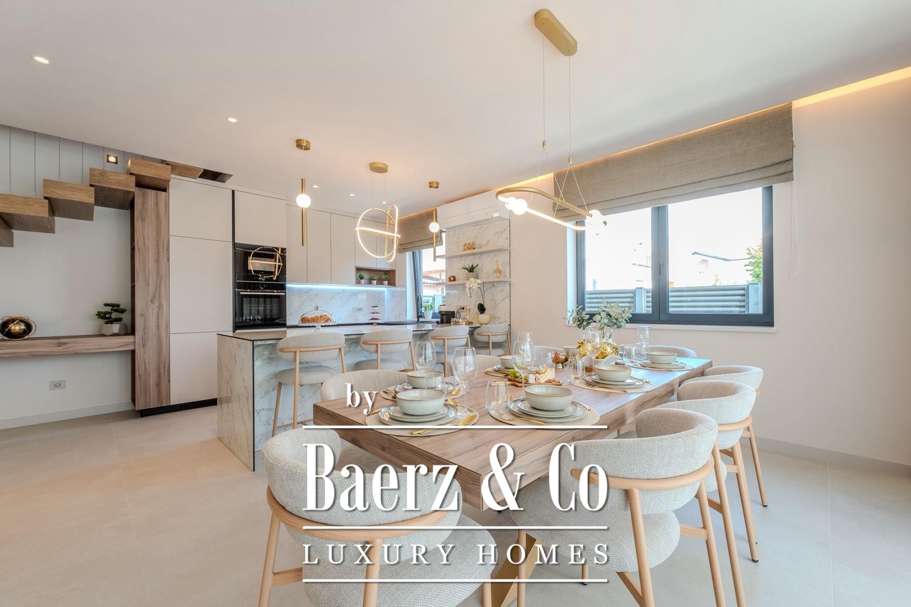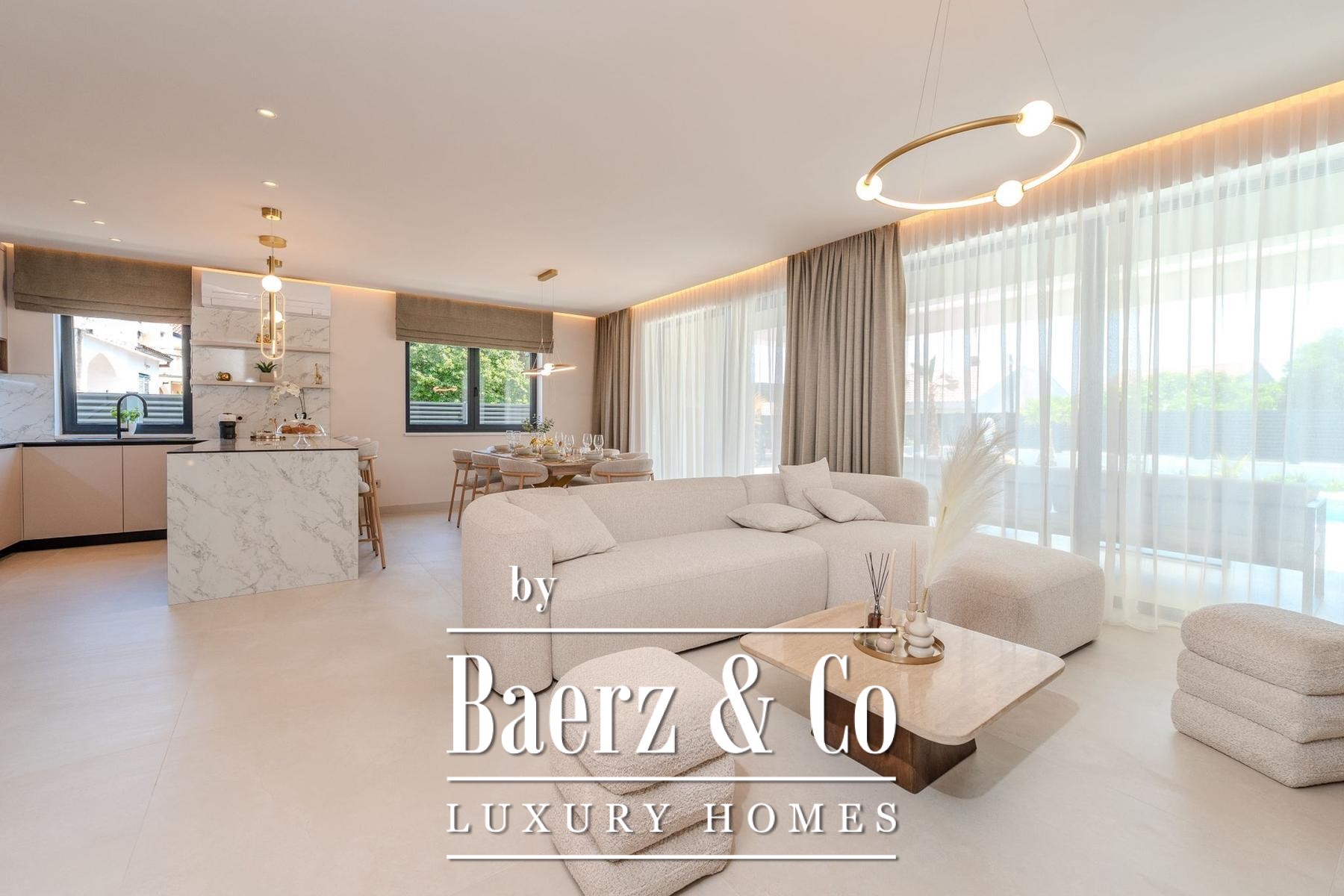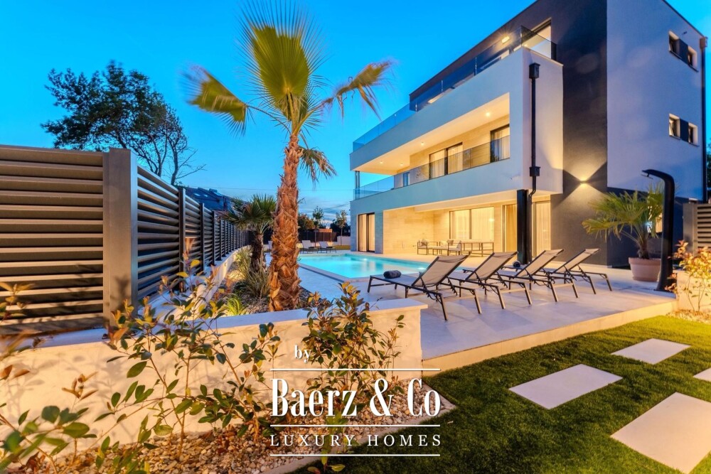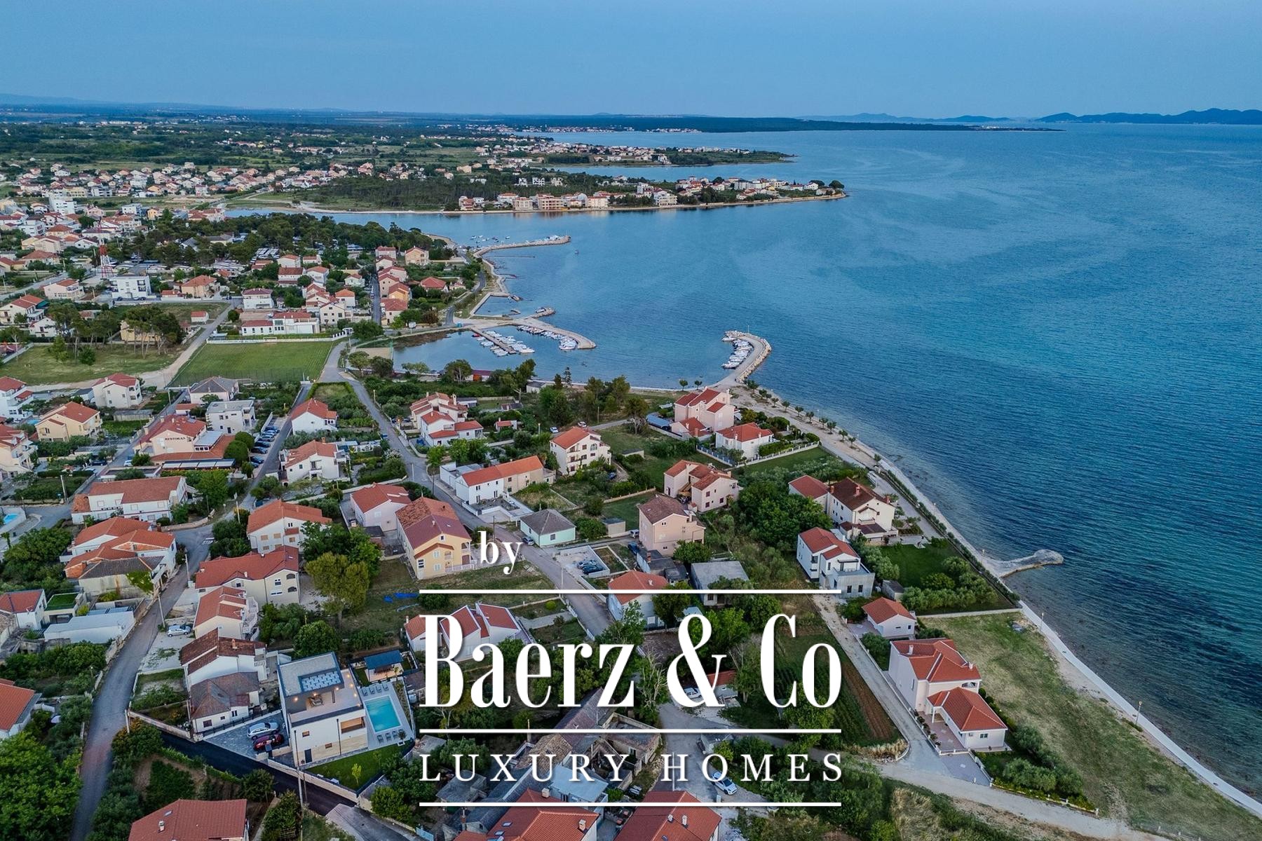 Covered and uncovered terraces extend the living spaces, combining Mediterranean sun with sheltered relaxation. The landscaped garden and sunbathing area convey privacy, while secure parking with video surveillance further enhances peace of mind. Mere steps from well-maintained beaches, this villa for sale in Privlaka aligns architectural elegance with Mediterranean leisure, equally suited for discreet family residence or luxury tourist rental. Each architectural detail reflects functionality and enduring quality, cultivating a setting of restraint, comfort, and light.