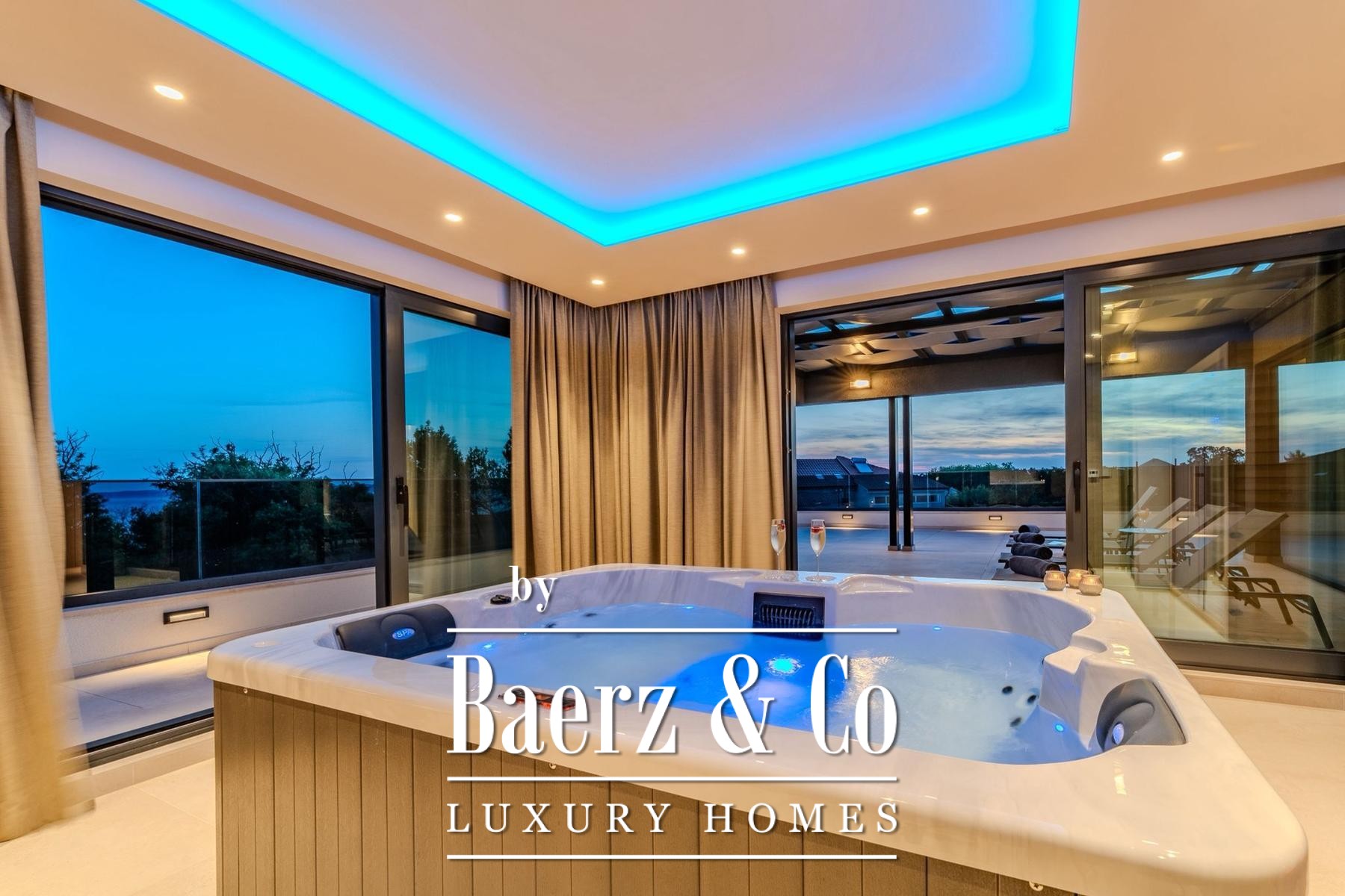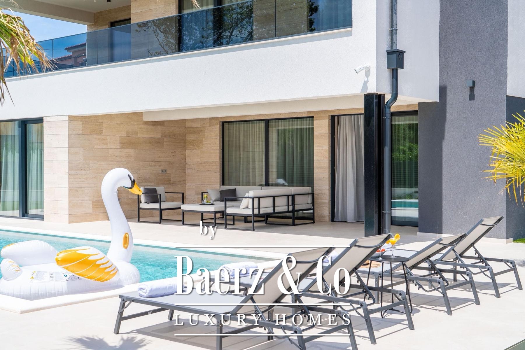 Villa Privlaka in Croatia presents a modern architectural statement in a quiet, exclusive enclave just moments from the Adriatic Sea. This villa offers 412.80 m² total floor area including terraces, set on a 591 m² plot, integrating open-plan living with a sense of seamless indoor-outdoor flow. The main living area of 52.66 m² connects to a 28.95 m² covered terrace and leads directly to the private 36 m² swimming pool, creating a social core ideal for relaxed gatherings or tranquil retreat. Four bedrooms all feature private en-suite bathrooms, with thoughtful allocation across the first and ground floors for both privacy and comfort. The top level is dedicated to a versatile wellness area of 23.60 m² with two expansive terraces designed for quiet contemplation beneath the Mediterranean sky.