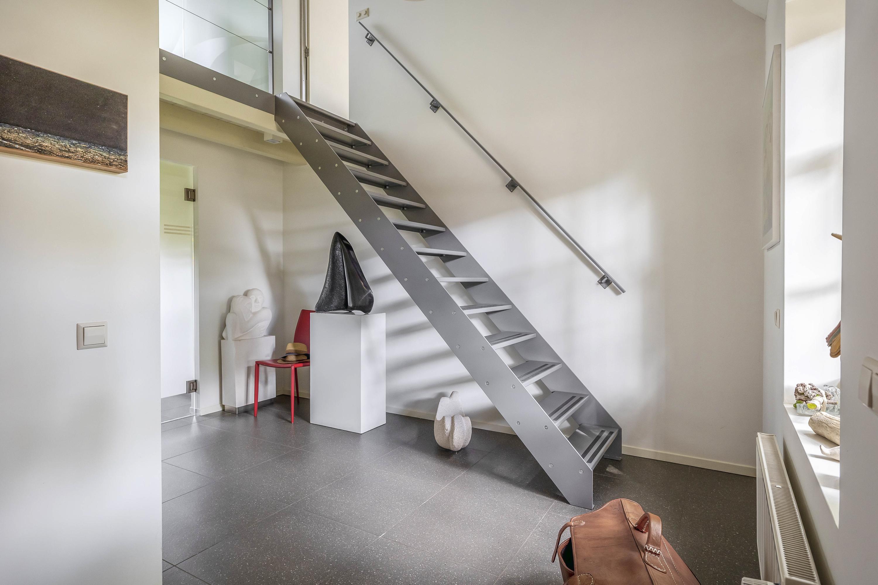 Upon entering the entrance hall, you will immediately notice the tiled floor with underfloor heating in combination with the sleek plastered walls and plastered ceiling. The beautiful view of the first floor through the loft and staircase to the upper floor is particularly striking. In the hall, you will also find the meter cupboard with a completely renovated interior, equipped with an extensive group layout and three-phase power. The hall also contains a fully tiled toilet with wall-mounted toilet, washbasin, urinal, and mechanical ventilation.