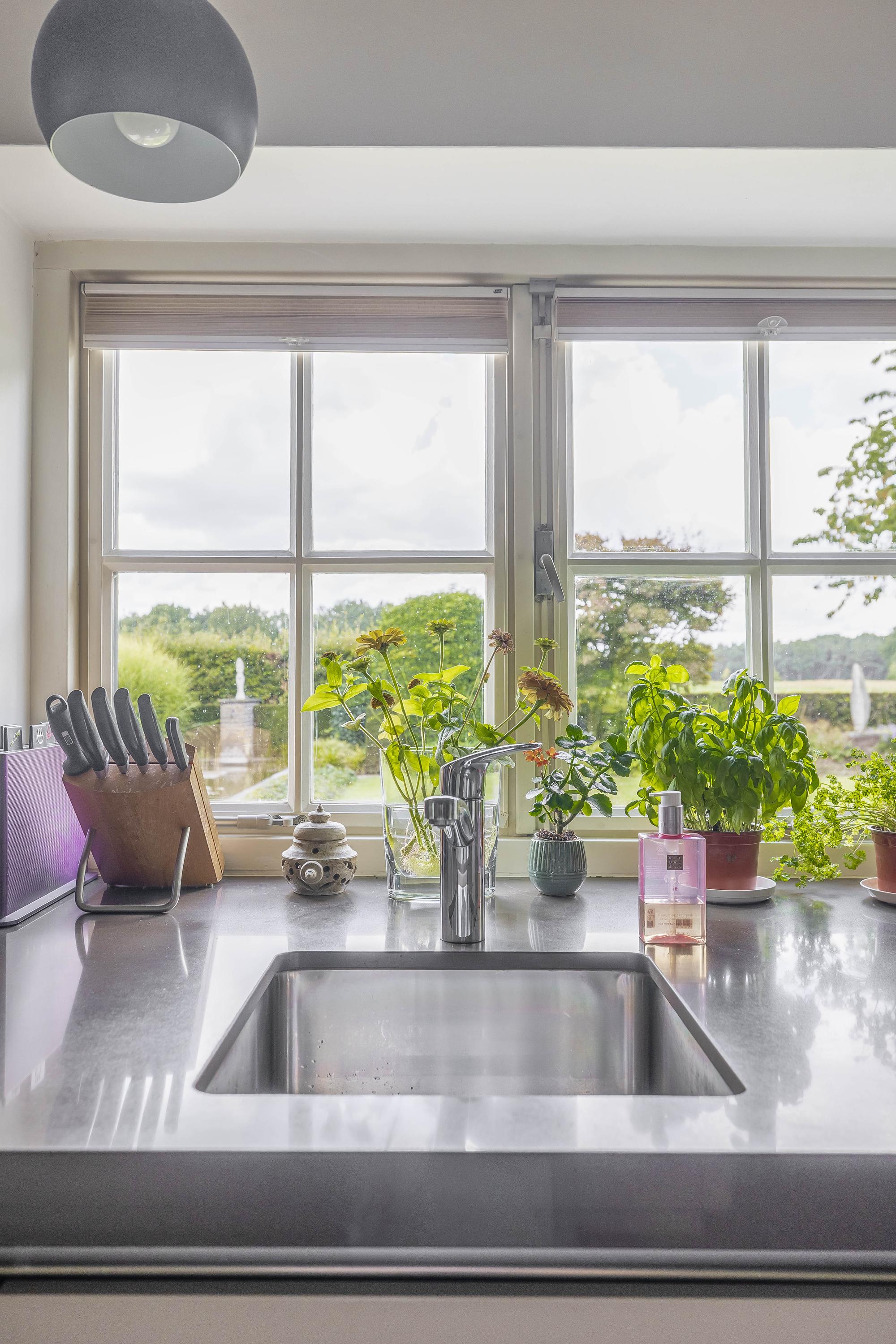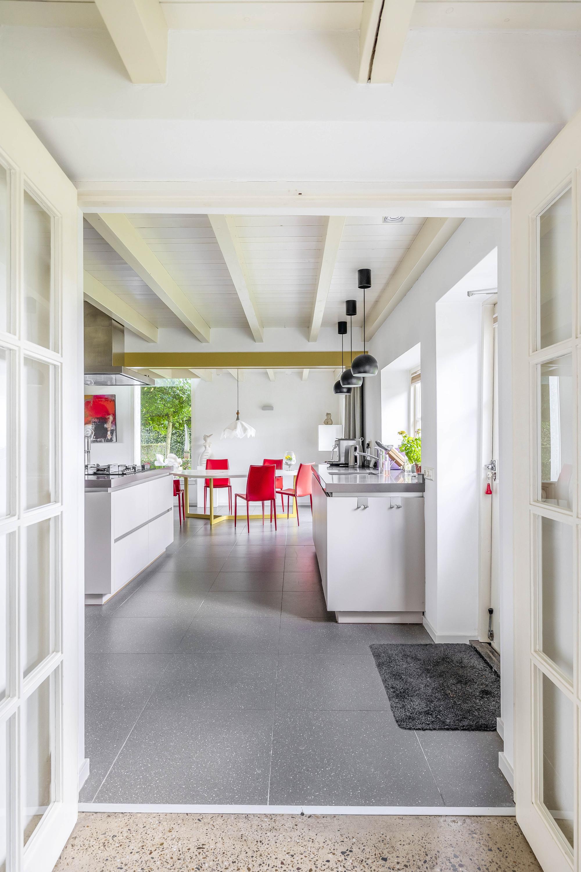 From the hall, you enter the spacious kitchen on the left side of the house. The kitchen also has a tiled floor with underfloor heating, stucco walls, and a beautiful wooden beam ceiling. In 2011, the kitchen was completely renovated. It features a cooking/island with a composite countertop, a 5-burner gas hob including a wok burner, extractor hood, and ample storage space. A wall unit with a composite countertop is equipped with a large sink, dishwasher, and a close-in boiler. Another wall unit contains a freezer, refrigerator, oven, and steam oven. From the kitchen, you have access to the backyard through a door and double French doors. The atmosphere is enhanced by the wood-burning stove and a beautiful high window on the side wall with a view through a glass panel in the bedroom on the first floor. There is also a built-in cupboard with the underfloor heating distributor.