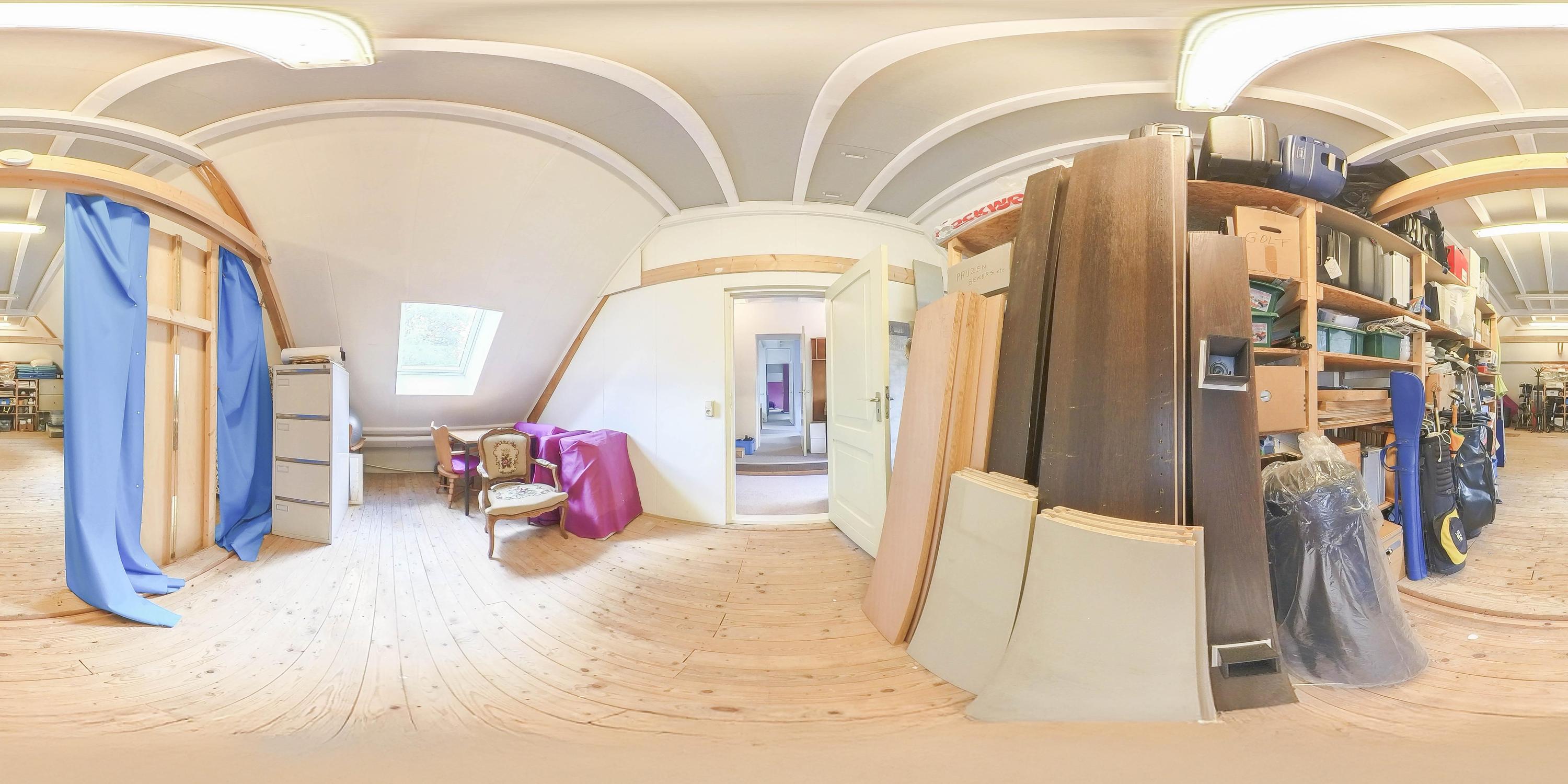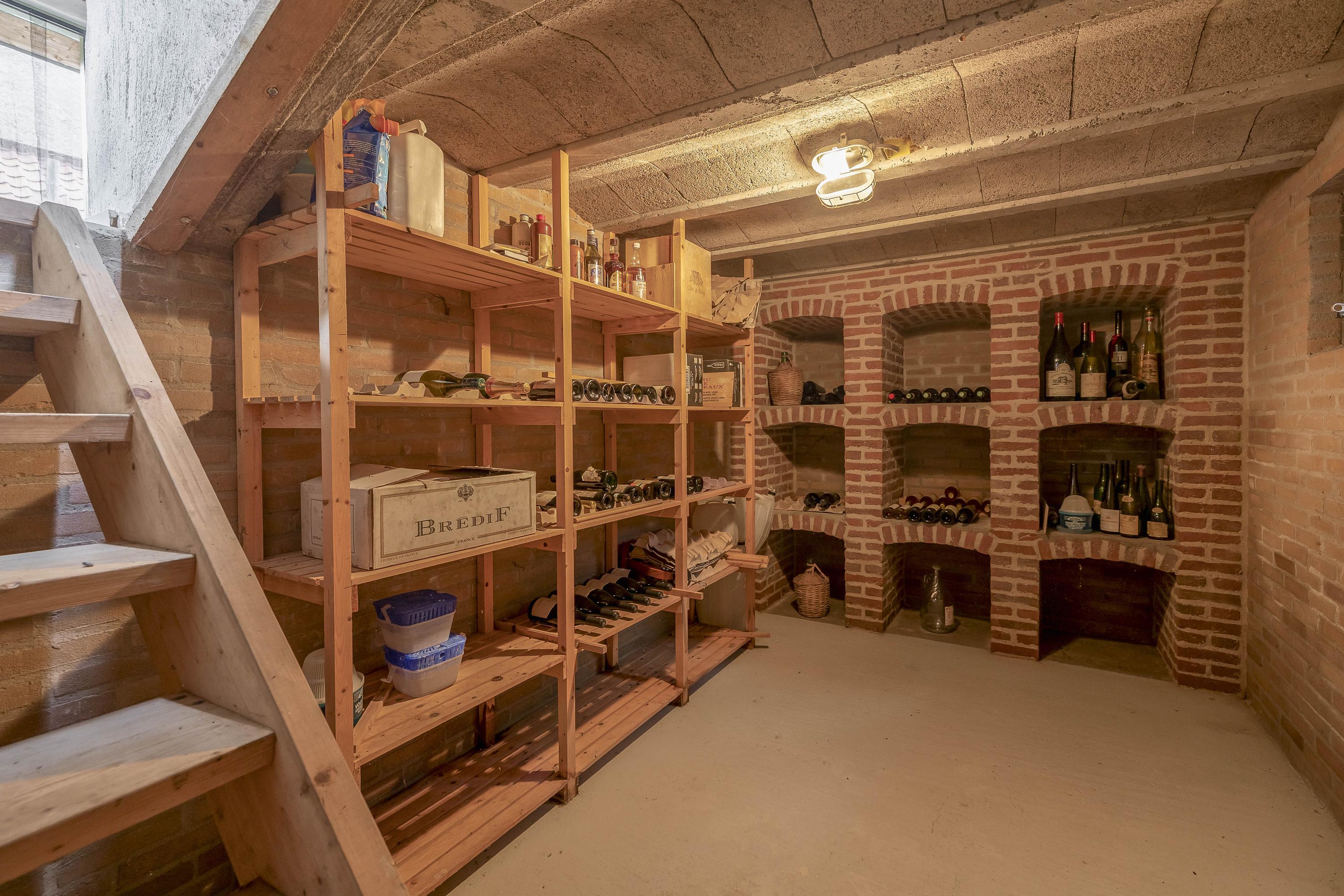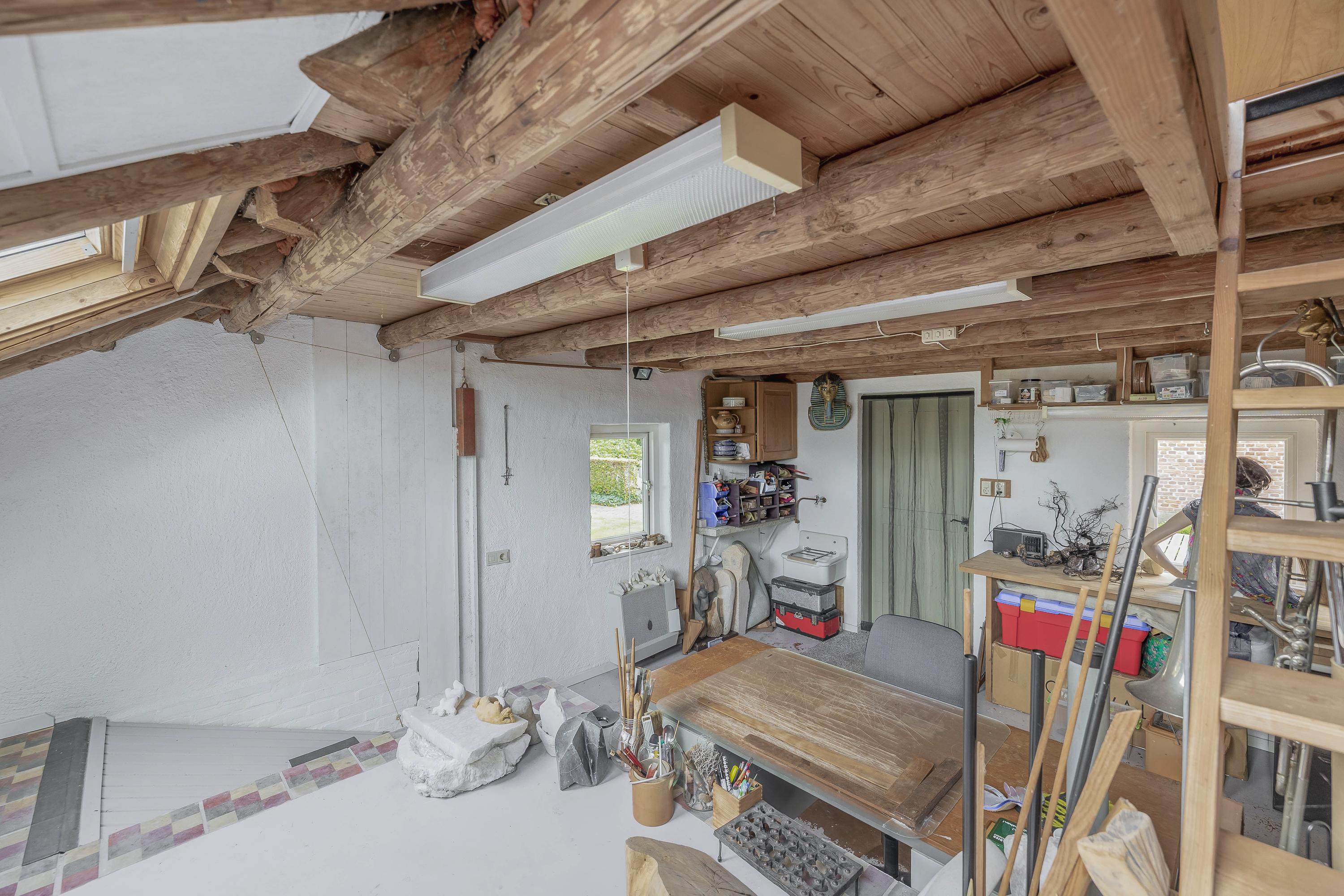 The part of this annex that is used as a studio has a concrete floor, two skylights at the rear, windows on three sides, and a sink with cold water connection. From here, a fixed staircase provides access to an attic space with a large Velux skylight and ample storage space. The studio space also has a man-sized wine cellar, accessible via a hatch with a fixed staircase. The studio space is also equipped with a gas wall heater.