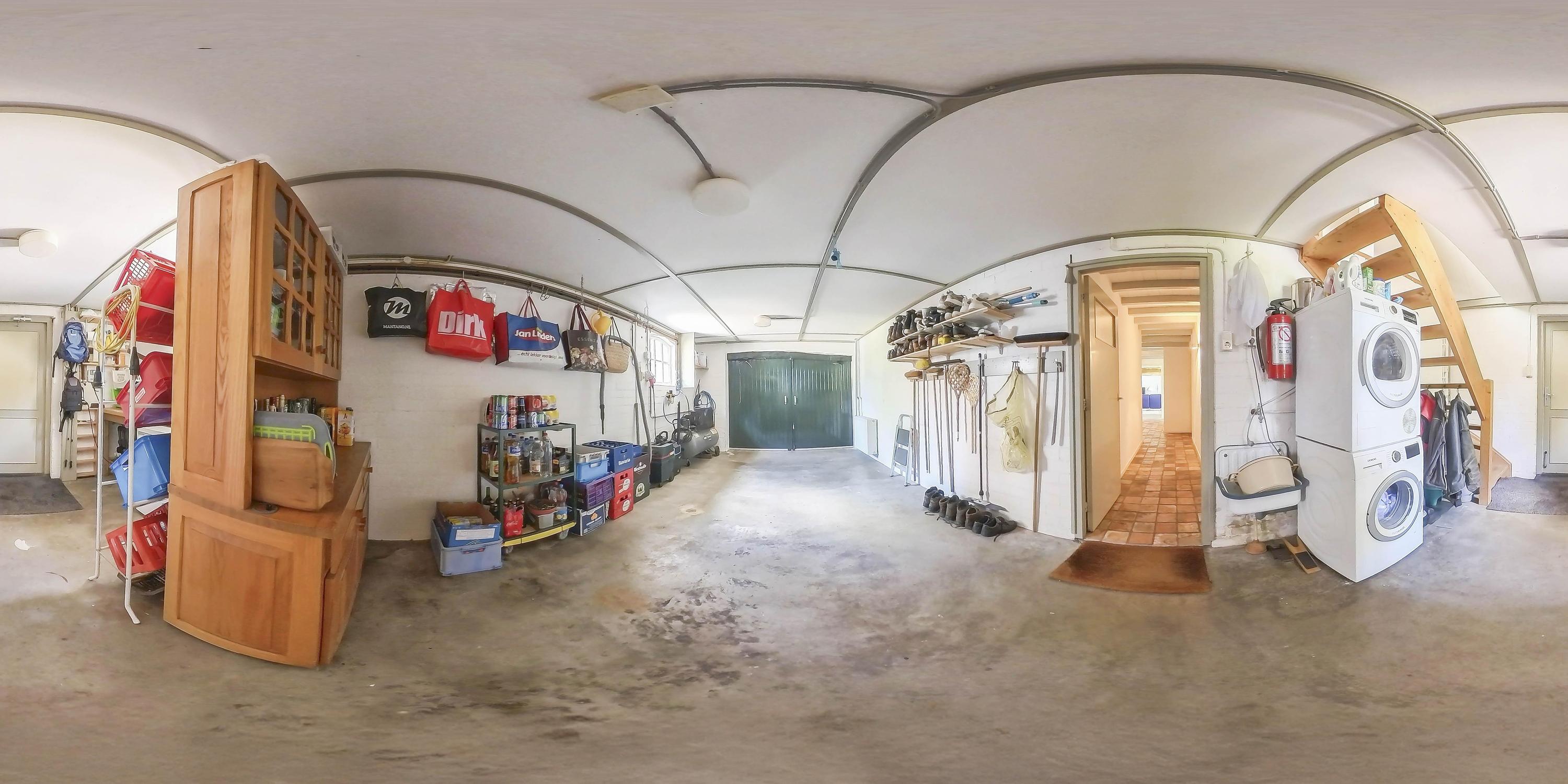 From the hallway on the ground floor, you walk through to the indoor garage. This garage is accessible at the front via double wooden doors and is equipped with heating, a sink, and connections for washing equipment. You will also find the groundwater pump and the garden irrigation system here. The garage has a high-voltage power connection and various pressure pipes for a compressor and has a fixed staircase to the first floor. A back door provides access to the backyard.