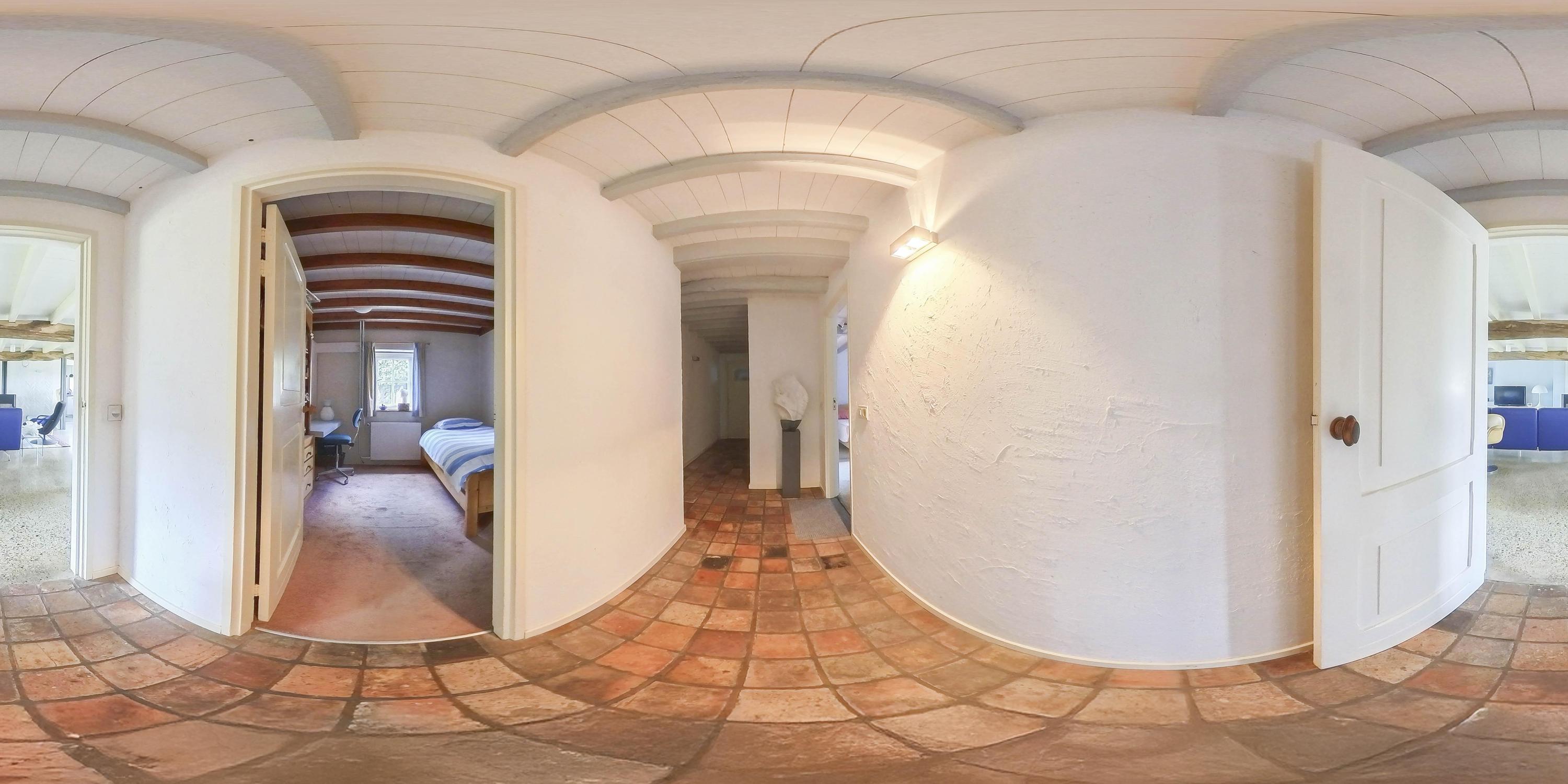 From the fixed staircase in the entrance hall, you reach the first floor of the main house. Here you will find a spacious landing with carpeted floors, stucco walls, and a beamed ceiling, with a view into the hall on the ground floor. From here, you have access to two bedrooms and the second bathroom.