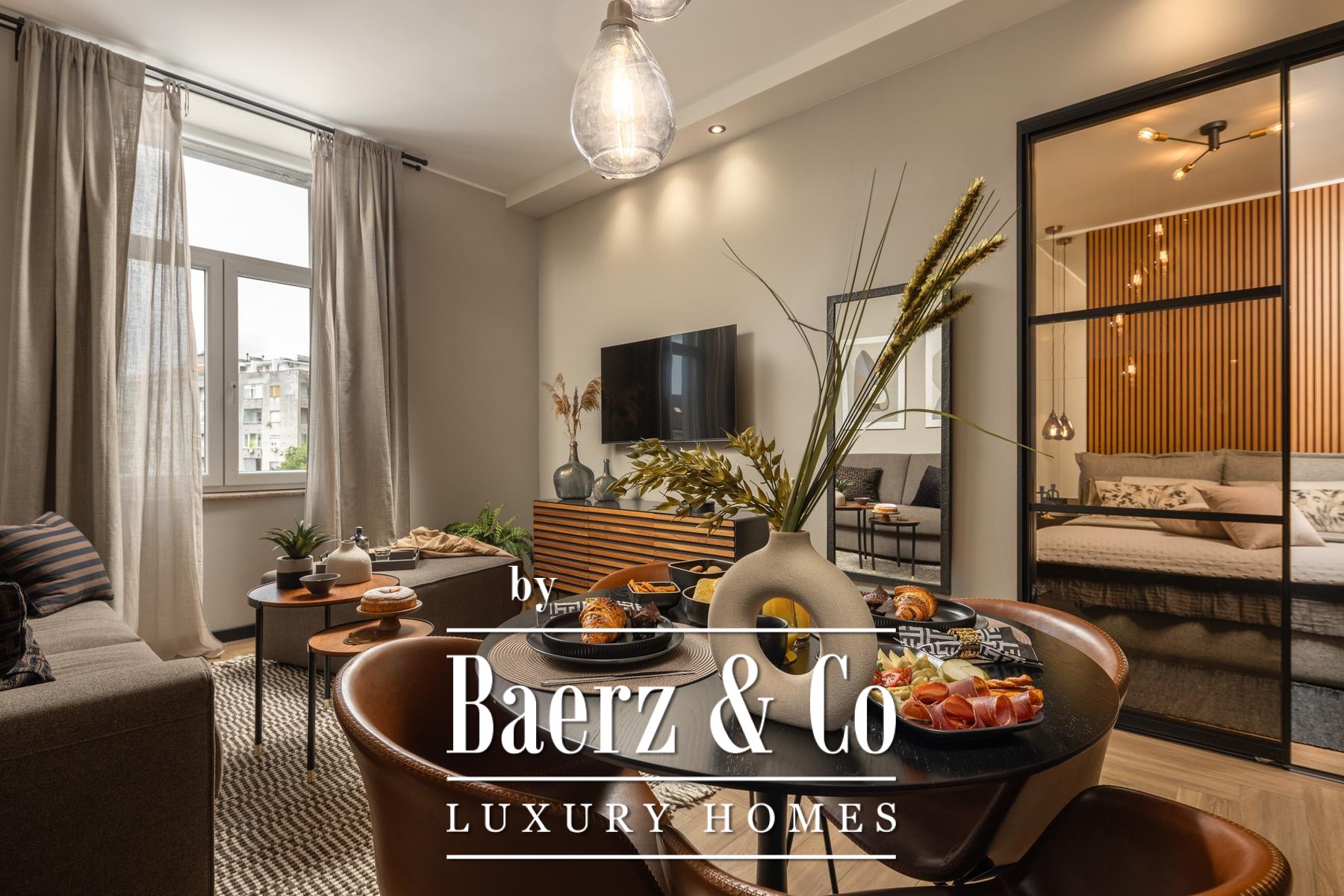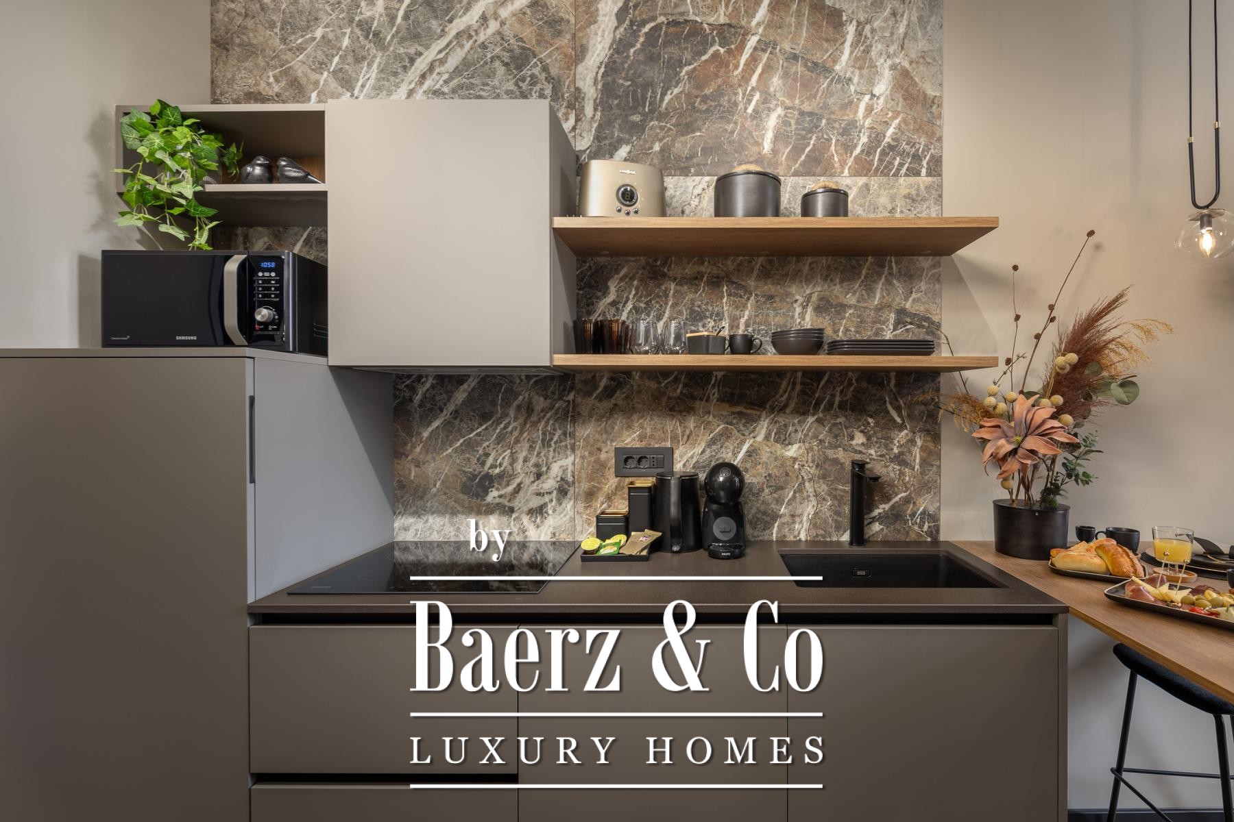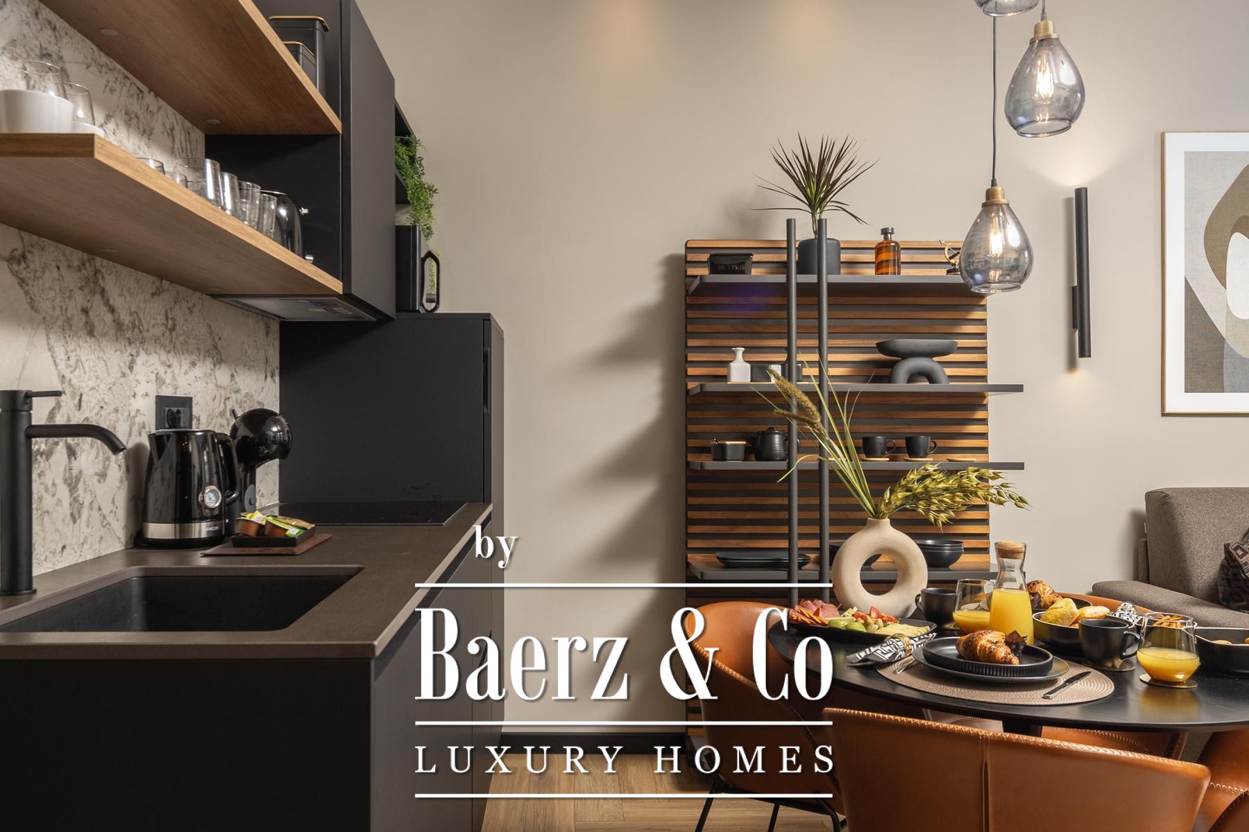 The interiors are shaped by a refined use of warm beige and anthracite, highlighted by gold details and custom lighting. Italian furnishings, large-format porcelain tiles, and matte black Veneta Cucine kitchens with sophisticated stone-marble backsplashes set an elevated tone. Frosted glass partitions, wooden wall slats with LED accents, and designer brass lighting complete the ambience.