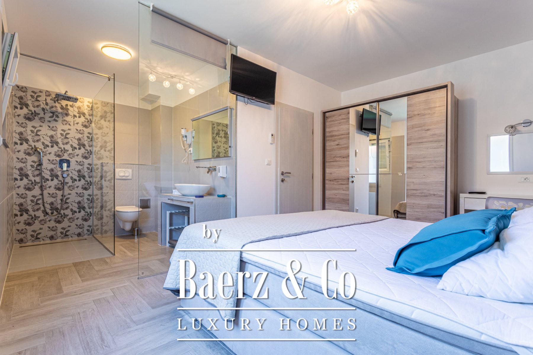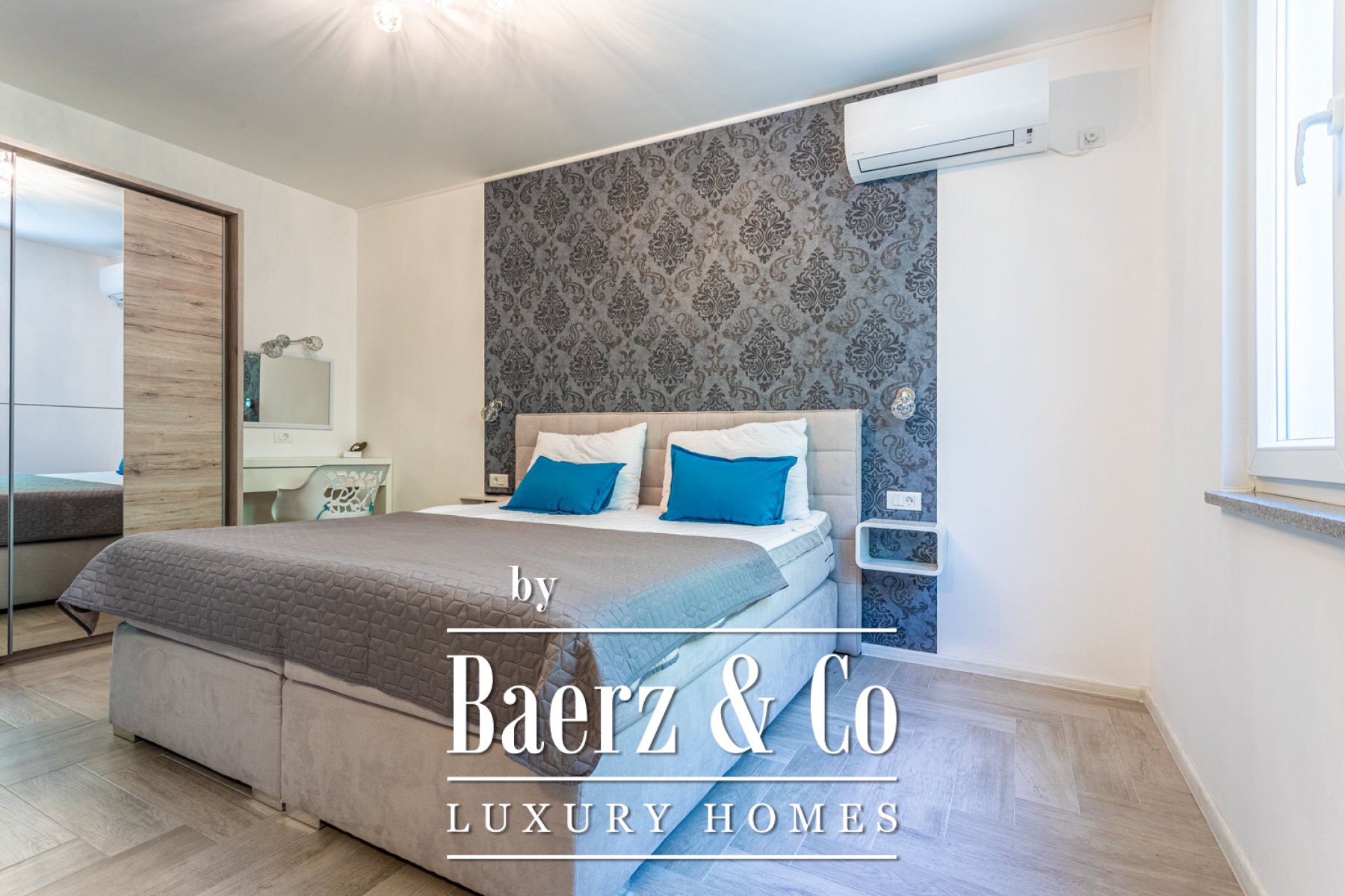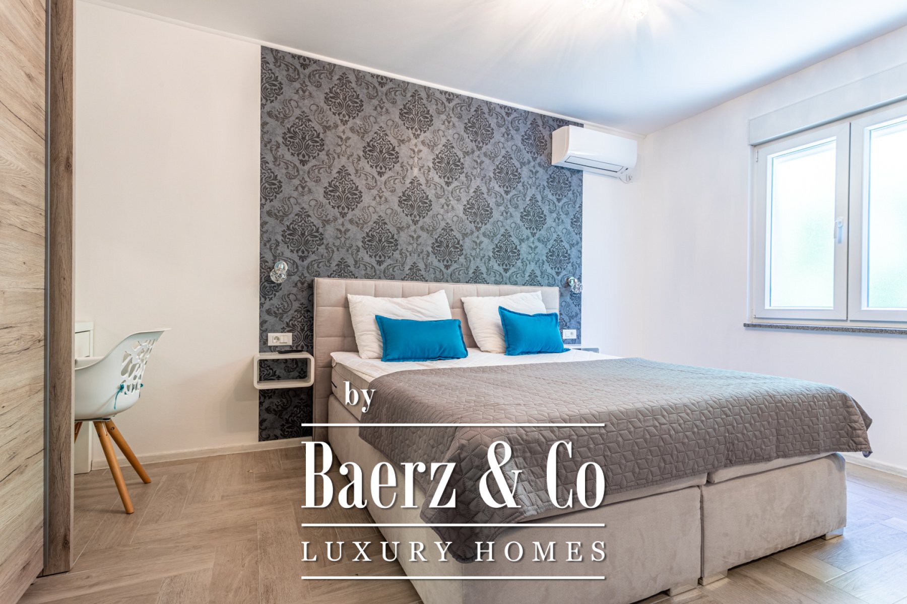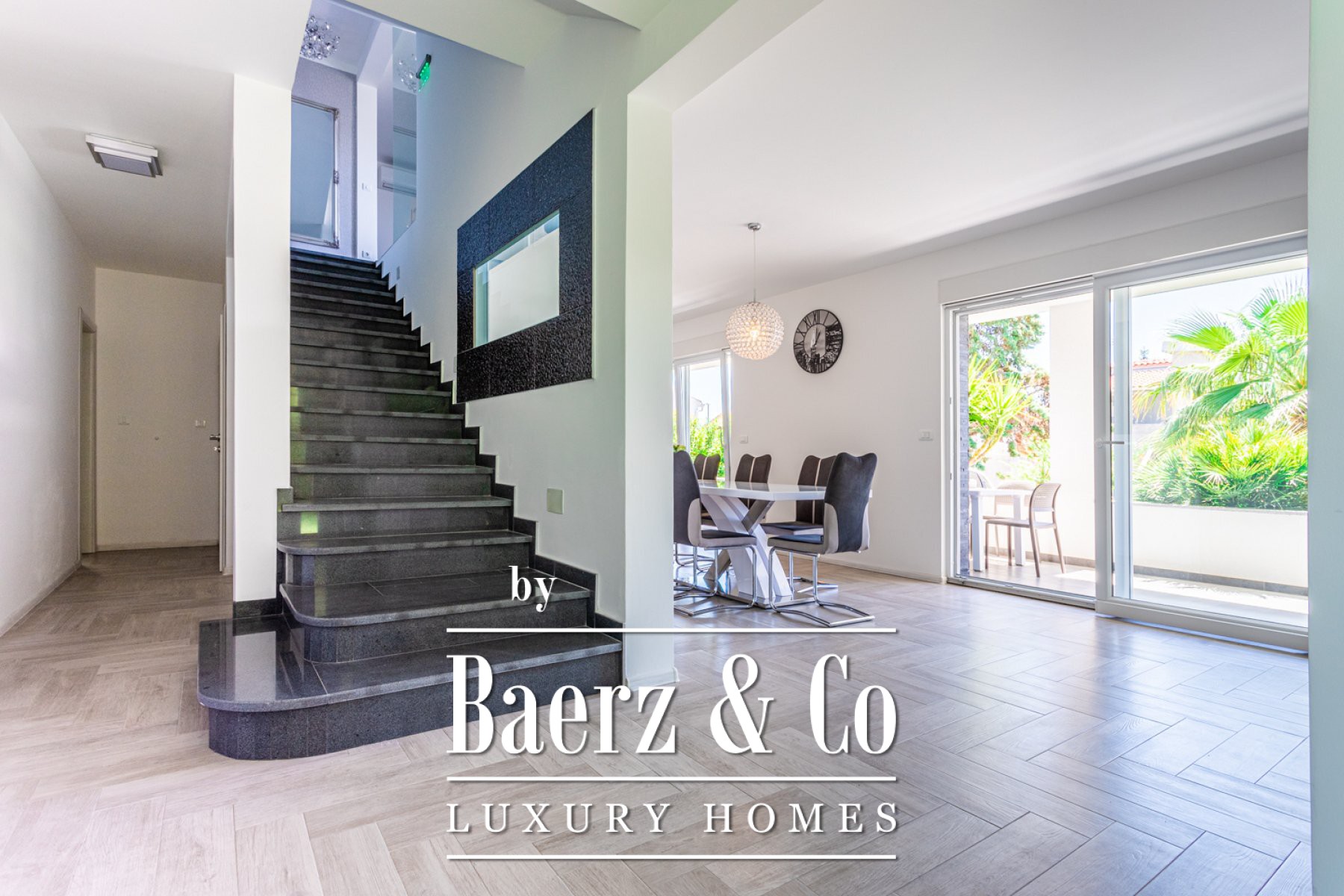 Modern, completely renovated family villa located in a beautiful small bay in Rogoznica in an ideal micro location with very little traffic, in the second row to the sea, with landscaped garden and parking. It is divided into three floors; ground floor with living area that includes kitchen with dining area, two en suite bedrooms, guest toilet and laundry room. The ground floor leads to a spacious outdoor terrace