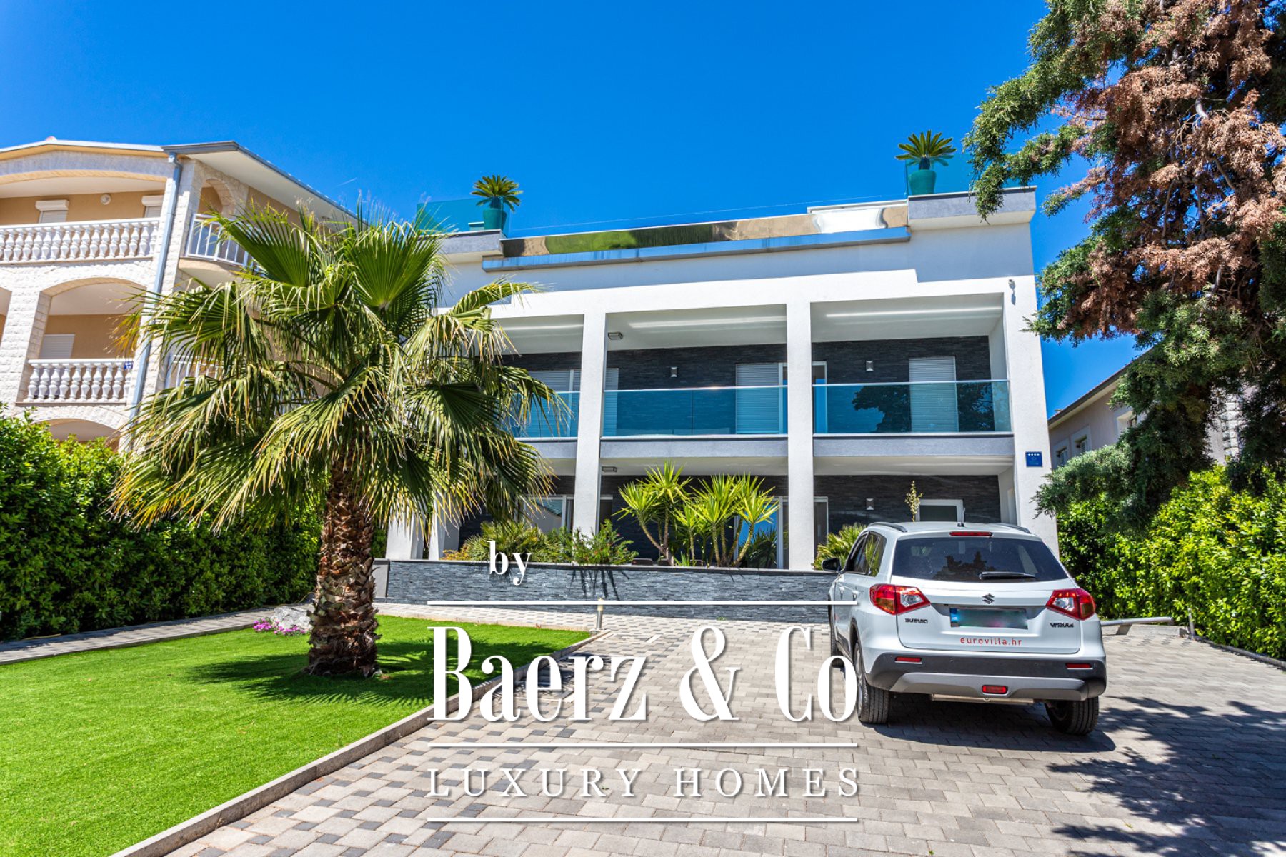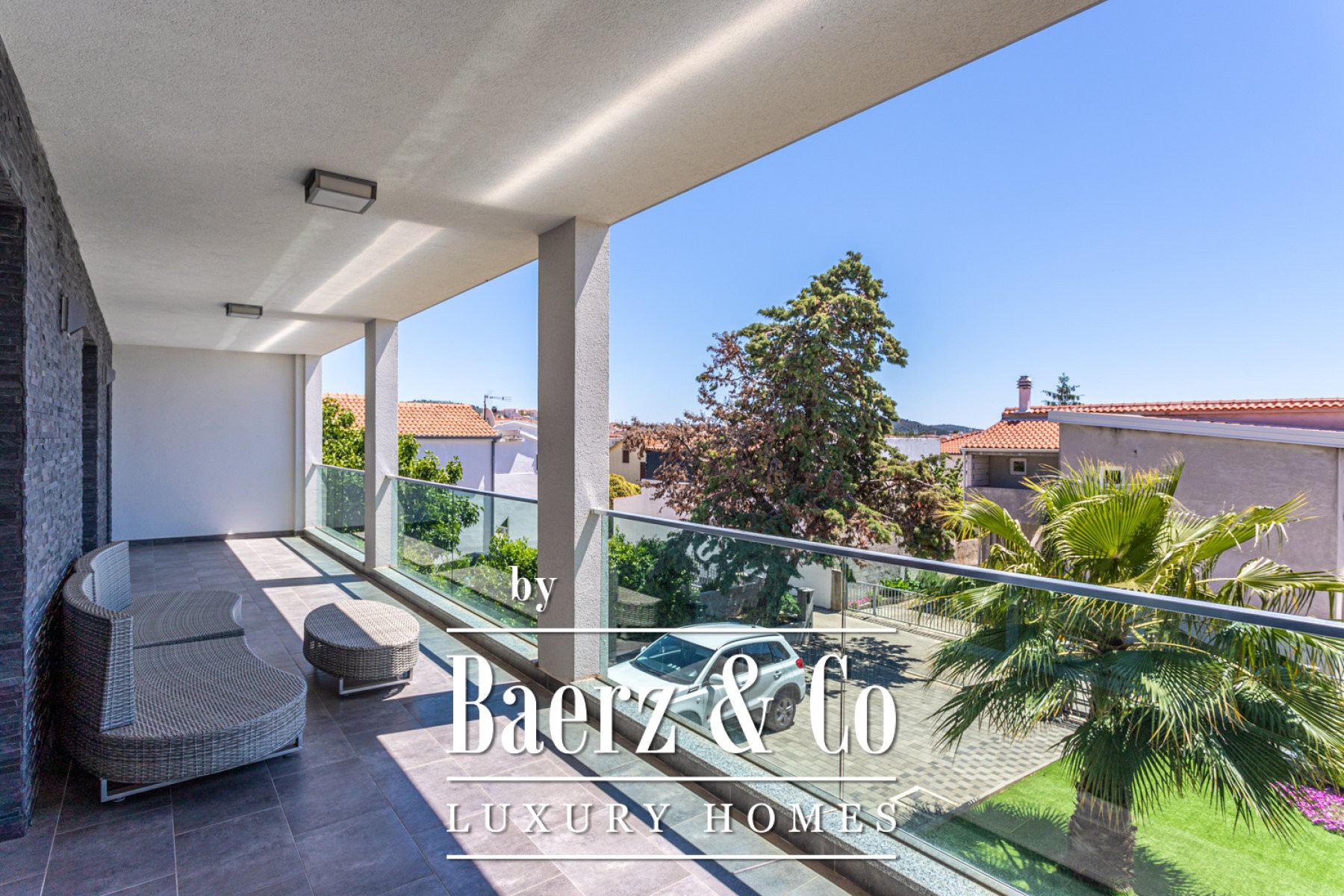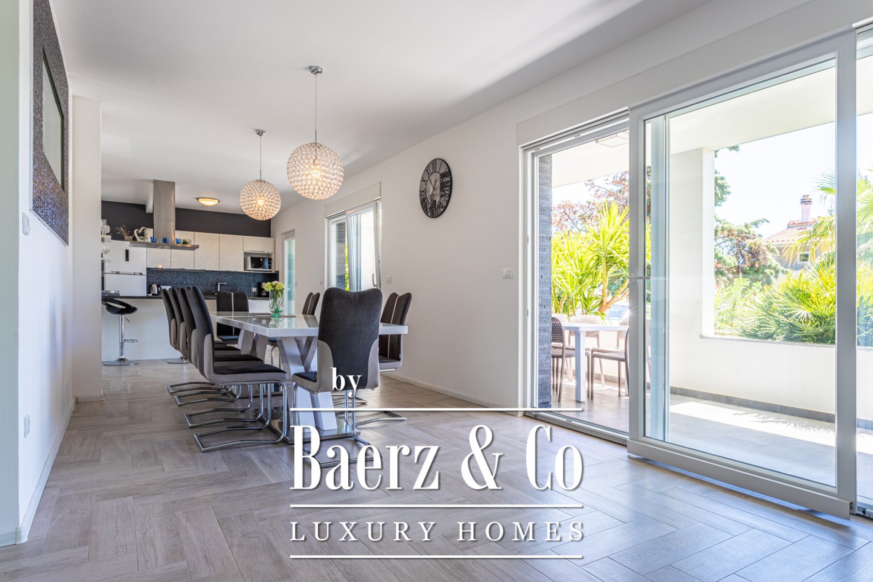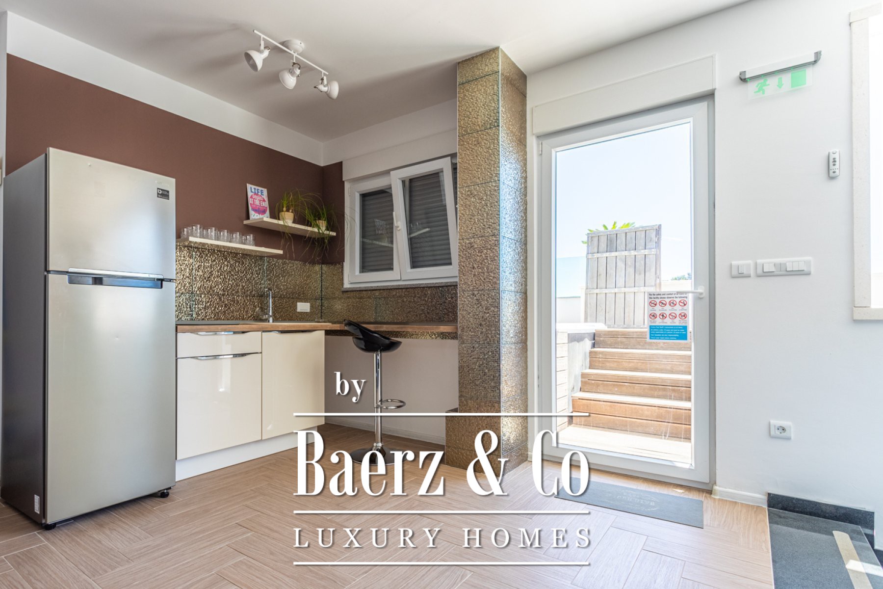 Modern, completely renovated family villa located in a beautiful small bay in Rogoznica in an ideal micro location with very little traffic, in the second row to the sea, with landscaped garden and parking. It is divided into three floors; ground floor with living area that includes kitchen with dining area, two en suite bedrooms, guest toilet and laundry room. The ground floor leads to a spacious outdoor terrace