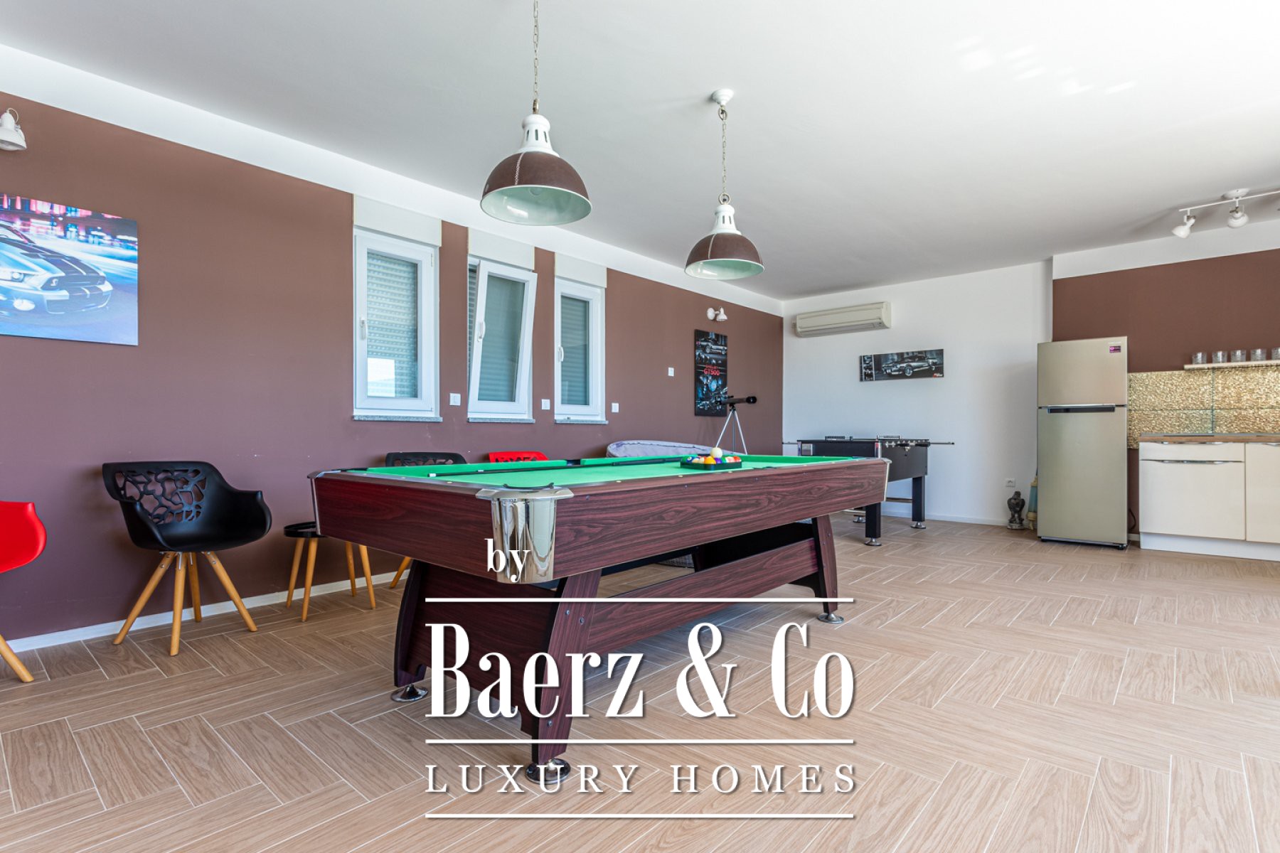 with landscaping and parking for several vehicles. The first floor consists of a living room with access to a loggia with a beautiful sea view and three en suite bedrooms. The second floor is designed as a recreation area that includes two toilets, sauna, playroom (billiards, table football), summer kitchen and a spacious terrace with jacuzzi, shower, sun deck and overflow pool overlooking the sea.
